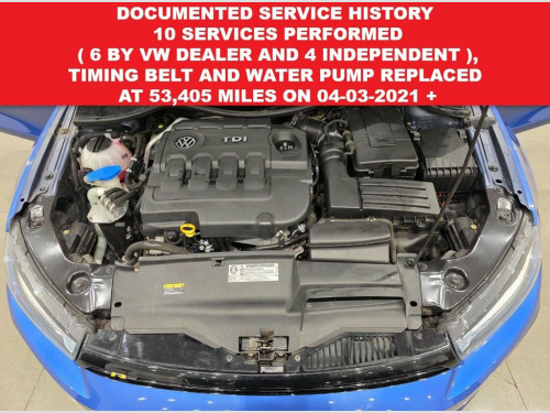 GREAT LOOKS AND SPEC + 2.0 TDI BLUEMOTION TECHNOLOGY ( 184 PS ) + DSG AUTO-TIP-PADDLESHIFT WITH SPORT MODE + DOCUMENTED SERVICE HISTORY, 10 SERVICES PERFORMED ( 6 BY VW DEALER AND 4 INDEPENDENT ), TIMING BELT AND WATER PUMP REPLACED AT 53,405 MILES ON 04-03-2021 + COMES WITH 12 MONTHS MOT AND ENGINE OIL SERVICE + EYE CATCHING SIGNATURE PAINTWORK- RISING BLUE METALLIC AND CONTRASTING BLACK VIENNA LEATHER UPHOLSTERY COMPLIMENTED WITH CONTRAST STITCHING + HEATED FRONT SPORT SEATS WITH E/LUMBAR SUPPORT + PIANO BLACK AND MATT ALUMINIUM INTERIOR TRIM + FACTORY 'R LINE' BODY KIT + BLACK PACKAGE + 19 INCH ALLOY WHEELS FINISHED IN GLOSS BLACK + BLACK MIRROR CAPS + YELLOW CALIPERS + SUBTLE COSMETIC UPGRADES- DEEPER REAR DIFFUSER- 2X EXHAUST TIPS- LOWERED SUSPENSION AND WHEEL SPACERS + START-STOP + DARKER TINTED REAR PRIVACY GLASS + F/R PARK PILOT WITH ACOUSTIC AND VISUAL ON SCRTEEN WARNING + DASH MOUNTED TRIPLE GUAGES + SATELLITE NAVIGATION + BLUETOOTH PHONE CONNECTIVITY + RADIO- CD PLAYER, AUX CONNECTIVITY + SD CARD-MEDIA-INTERFACE + ON BOARD COMPUTER AND DRIVER'S INFO SYSTEM + TRACTION CONTROL + 'R' EMBOSSED SPORTS FLAT BOTTOM MULTIFUNCTIONAL LEATHER STEERING WHEEL WITH UPGRADED LARGER PADDLESHIFT CONTROLS + ADJUSTABLE STEERING COLUMN AND HEADLAMP AIM + POWER STEERING + REMOTE C/LOCKING + E-WINDOWS + HEATED E-MIRRORS + FRONT ARMREST + TEMPERATURE CONTROLLED GLOVE BOX + ALARM-IMMOBILISER + PASSENGER AIR BAG ON-OFF + ALUMINIUM SPORT PEDALS + ISOFIX + E/BOOT RE Rear Tinted Glass - B Pillar Backwards -, 19in Alloy Wheels - Lugano Black, Winter Pack icw Leather Upholstery, Rising Blue, Park Assist, Vienna Leather - Titan Black, Voice Activation, 12V Socket - Luggage Compartment, 19in Alloy Wheels - Talladega, 2 Front Three-Point Seat Belts with Tens, 2 Zone Electronic Climate Control with A, ABS - Anti-Lock Braking System with HBA , Airbags, Alarm with Interior Protection, Aluminium Look Pedals, Armrest - Front Centre with Storage Comp, Automatic Coming Home Lighting Function, Bag Hooks in the Luggage Compartment x2, Black Rooflining, Body Coloured Bumpers and Door Handles, Body-Coloured Door Mirrors with Integrat, Brushed Aluminium Instrument Surrou