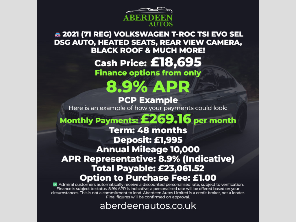 With only 38,590 miles and an abundance of specification and upgrades! Aberdeen Autos are excited to offer this 2021 VOLKSWAGEN T-ROC 1.5 TSI EVO SEL, 5-Door Hatchback, powered by a 1.5-Litre Turbocharged Petrol Engine and is driven by a DSG Automatic Transmission. With its low mileage and excellent condition, theres so much to love about the T-ROC, most notably its refinement and comfort, and makes a strong style statement both inside and out! The exterior is finished in Pure White with Half Leather interior and Heated Front Seats to complement. , , This 2021 Volkswagen T-ROC features advanced safety technologies, a modern infotainment system, and a spacious load compartment with an electric tailgate for added convenience. , Key features:, DSG Automatic, Digital Cockpit Pro, Touch-screen Navigation-Infotainment System, Rear View Camera, Heated Front Seats, Half Leather interior, Electric Tailgate, Front & Rear Parking Sensors, Split Folding Rear Seats, Pure White exterior, Black Roof, Roof Rails, Lane Assist, LED Headlights, Low mileage, Excellent condition, , Price £18,695, , Part Exchange welcome!, , Please contact us at Aberdeen Autos Limited to arrange a viewing and test drive. We look forward to helping you find your next car. , Enquiries are welcome! Please do not hesitate to contact our Sales Specialists with any queries, to request a video walkaround, or to make an appointment to view this vehicle. , Contact 01467 651600 / 07590 984097 (Mobile/WhatsApp) , or contact us by email: [email protected], , We care about our customers and offer competitive finance rates. Please contact us for a free, no-obligation representative quote or you may wish to try the finance calculator on the website at: https://www.aberdeenautos.co.uk/finance/, , For our customers convenience, you can apply for finance via the website, where we have information about the finance options that are available and see Representative Examples (indicative only) (Representative from 8.9% APR) or contact us direct. , RESERVE NOW ON THE WEBSITE FOR £99, , Please see our website / Facebook for other vehicles available!, , www.aberdeenautos.co.uk, , Like us on Facebook to stay updated on the latest stock and deals!, , https://www.facebook.com/aberdeenautos, , Happy motoring from Aberdeen Autos!, , For your information: vehicles purchased from Aberdeen Autos Limited include: HPI security and history check; road test and 40-point vehicle check; new service (if required), MOT, remaining manufacturers warranty if applicable or 3 months warranty (warranty terms and conditions apply in all cases) and quarter of a tank of fuel (with no additional charge to the customer). Please discuss with our Sales Specialists if you require further information. , (Please note that whilst every effort is made to ensure details are correct, variations or omissions may occur, any notified errors will be rectified). , Directions: Please use Google Maps and enter Aberdeen Autos as the destination. Please do not use the postcode.