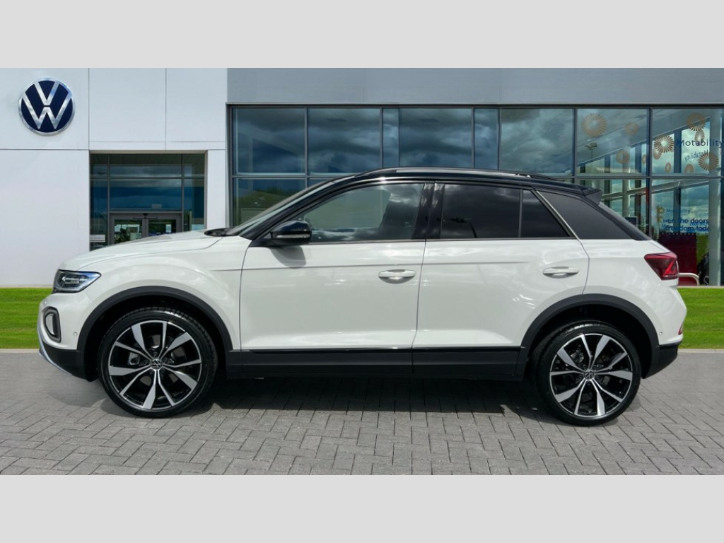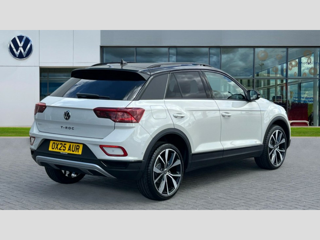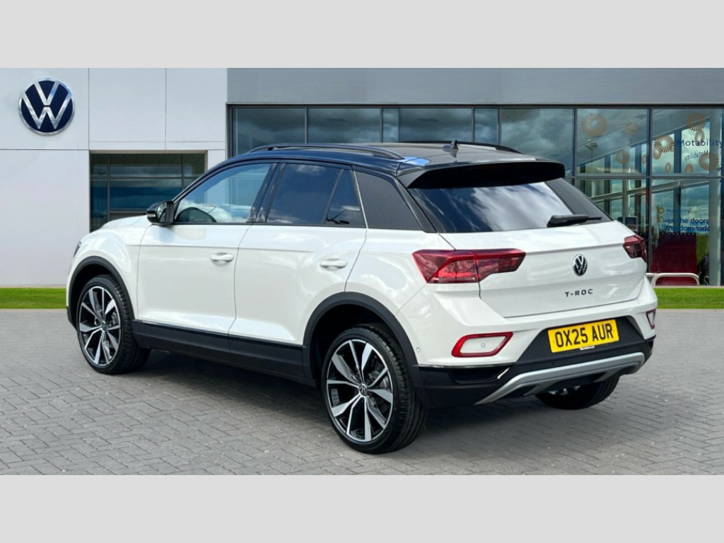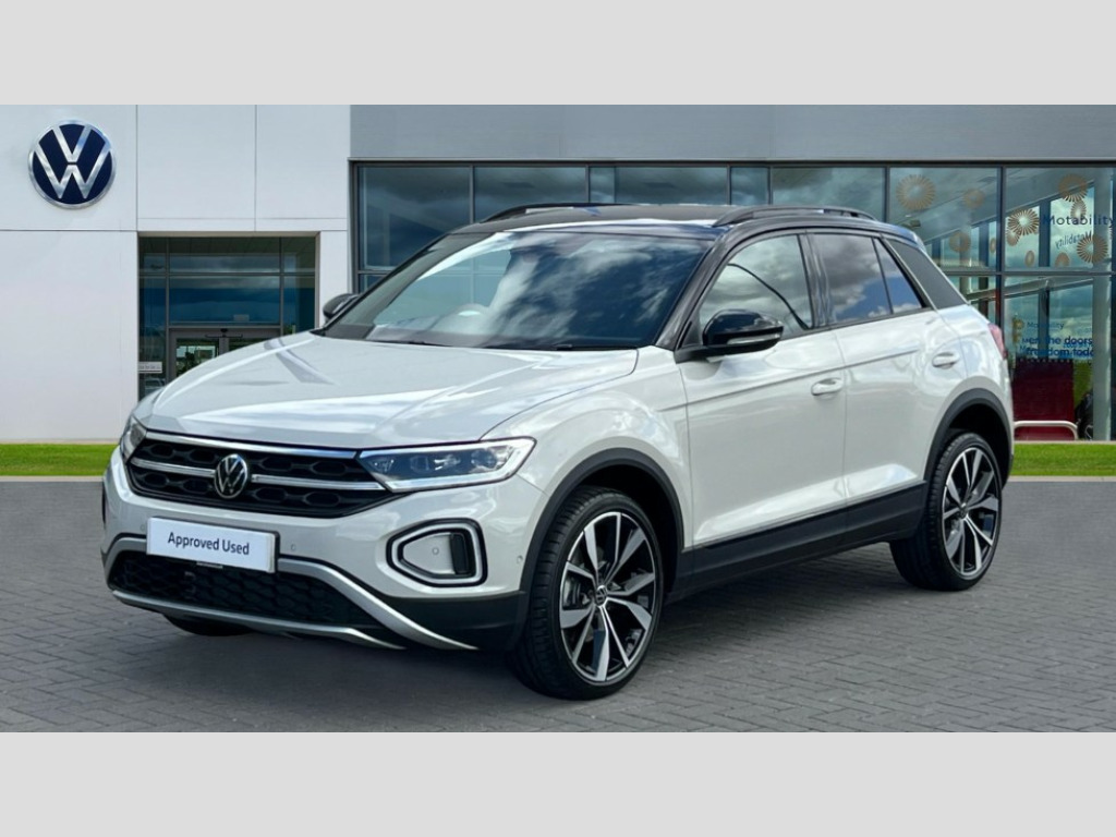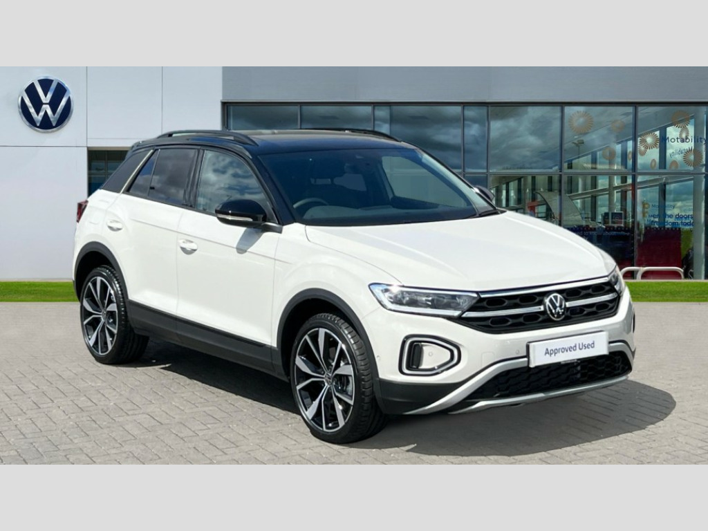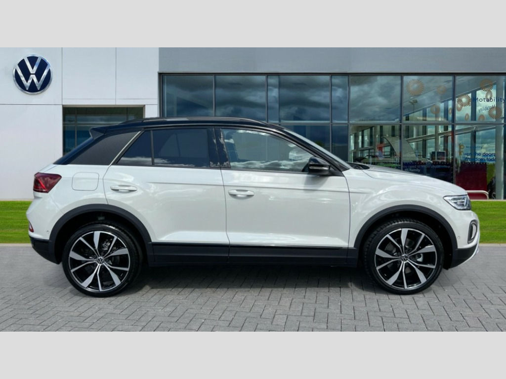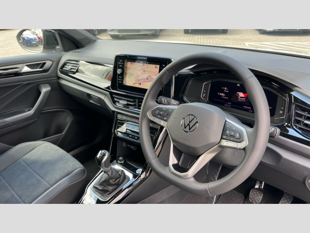Volkswagen T-Roc 1.0 TSI 115 Style Design 5dr 10.25" Digital cockpit pro, Advanced driver attention and drowsiness monitor, Dynamic road sign display, Emergency call service, Lane keeping system Lane Assist, Mobile phone interface, Modified key software - reduce switch off time for key status change to Long no motion, Online services, Park assist including front and rear parking sensors, Power assisted speed sensitive steering, Rear view camera, Service interval indicator, Tailgate/trunk lid release from outside, Think blue trainer driver tips and journey analysis, Warning sound and light for front seatbelts unfastened, Wireless app connect, Battery regeneration during braking, Start/stop function with battery regeneration, DAB Digital radio, Diversity antenna for FM reception, Music playback - MP3, WMA and AAC files, Premium USB cable in choice of either Apple or Android smartphone compatibility, SD card slot, Simultaneous pairing of 2 compatible mobile devices, Title and cover art display, We Connect and We Connect Plus functionality, Adhesive film in carbon look on the C-pillars, Advanced dynamic light assist for LED matrix headlights, Auto dimming interior rear view mirror, Automatic hazard lights activation under emergency braking, Black roof rails, Body colour sports bumpers with silver metallic underbody fascia, Body coloured exterior mirror housings and door handles, Dynamic cornering light, Dynamic headlight range control with self adjusting whilst driving, Electrically adjustable and heated door mirrors, Extended roof spoiler, Exterior ambient lighting, Exterior mirrors aspherical on driver side, convex on front passenger side, External USB type C socket and charging sockets, Front windscreen wiper with intermittent wipe and 4 position delay, Heated rear window, Illuminated front grille, IQ LED matrix headlights, LED 3rd brake light, LED rear number plate lights, LED rear tail lights with dynamic turn signal, LED separate daytime running light, Light mode for poor weather, rain, fog or snow, Power windows with comfort operation and circuit breaker, Privacy glass for rear side windows and rear window, Rain sensor, Rear exhaust tailpipe, Rear fog light on one side and reversing lights on both sides, Rear side wing doors, Rear wash/wipe with intermittent wipe setting, Remote electrically foldable door mirrors, puddle lights and reverse activated passenger's door mirror, Tilting and sliding panoramic sunroof with rear panoramic sunroof, 12V power socket in centre console, 3 rear head restraints, 3 seat bench in 2nd row, 4 load lashing points in luggage compartment, Air care climatronic air conditoning system with active combination filter and 2-zone temperature control, Black roof lining, Chrome plated radiator grille inserts, air vent surrounds and light switch surrounds, Door and side trim panel with leatherette insert, Drawer under drivers seat, Front + rear carpet mats, Front centre armrest, Front comfort sports seats, Front cupholders x 2, Front footwell illumination, Front seat back storage pockets, Glove compartment door with light, Instrument lighting, white adjustable panel illumination, Interior ambient lighting and surround lighting, Interior light delay, Isofix child seat preparation, Leather gearshift handle, LED interior light with switch off delay/dimmer and 2 front/rear LED reading lights, Load-through provision with cup holder when folded down ('Unsplit rear seat bench, split folding backrest, with centre armrest), Luggage compartment lighting, Non-folding front passenger seat backrest, Single front passenger seat, Storage compartment in left and right luggage area, Storage compartment in rear doors, Storage compartments in driver and front passenger doors, Sunvisors with illuminated vanity mirrors, Variable boot floor, height adjustable and removable, Black design pack - T-Roc style design, Driver assistance pack without proactive passenger protection - T-Roc, Easy open package with safelock - T-Roc, 3 point height adj front seatbelts + pretensioners, 3 point seatbelts in outer rear with ECE label, ABS, Child locks on rear doors, City emergency braking and pedestrian monitoring, Driver and front passenger airbag with front passenger airbag deactivation, Driver and front passenger safety-optimised head restraints, Drivers seatbelt reminder, Electronic parking brake, Electronic Stability Control (ESC) inc EDL (Electronic Differential Lock) and ASR (Traction Control), Front and rear passengers curtain airbag system including front side airbags, Predictive pedestrian protection, Rear disc brakes, Two tone horn, Tyre pressure loss indicator, Volkswagen roadside assistance, Black decorative trims, Piano black decorative inserts in dashboard and front door trim panels, Tool kit, Trims for alloy wheels, Tyre mobility kit including compressor and sealing foam