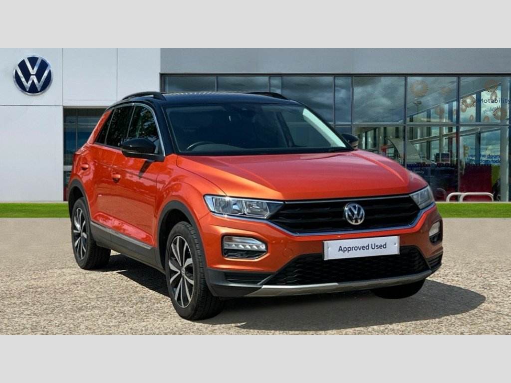 Volkswagen T-Roc 1.5 TSI EVO Design 5dr 2 USB connection charging sockets, Adaptive cruise control, App-Connect, Automatic start/stop system, Bluetooth telephone and audio connection for compatible devices, Car information display, Driver alert system with audible and visual fatigue detection system, Front assist, radar sensor controlled distance monitor, city emergency braking + predictive pedestrian protection, Lane assist, Multifunction computer with visual gear change recommendation for fuel consumption, Power assisted speed sensitive steering, Service interval indicator, Think blue trainer driver tips and journey analysis, Warning sound and light for doors and tailgate open, Warning sound and light for front seatbelts unfastened, Battery regeneration during braking, Bluetooth - Simultaneous pairing of 2 compatible mobile devices, DAB Digital radio, Multi device interface (MDI) with USB connection, Music playback - MP3, WMA and AAC files, Premium USB cable in choice of either Apple or Android smartphone compatibility, SD card slot, SMS functionality - read, compose and send SMS messages using touch-screen display, Title and cover art display, Auto dimming interior rear view mirror, Automatic hazard lights activation under emergency braking, Black grained lower door protectors, Black grained wheel arches, Body colour door handles, Body colour sports bumpers with silver metallic underbody fascia, Chrome effect left and right trapezoid exhaust tailpipe fascia surround, Chrome trim on upper and lower radiator grille, Door mirror integrated indicators, Dusk sensor, Electrically foldable, adjustable and heated door mirrors with puddle lights and reverse activated kerb-view adjustment on passenger's door mirror, Front and rear electric windows, Front windscreen wiper with intermittent wipe and 4 position delay, Fully galvanised body, Heated rear window, High level 3rd brake light, LED rear number plate lights, Manual coming/automatic leaving home lighting function, Rain sensor, Rear tinted glass from B-pillar backwards approx 65% tinted, Rear windscreen washer and wiper with interval delay, 12V socket in centre console storage area, 2 LED front and rear reading lights, 3 rear head restraints, 4 load lashing points in luggage compartment, Ambient lighting in front footwell and light strips below trim in front doors, Climate control - 2 zone electronic air conditioning with automatic air recirculation and allergy filter, Drawer under drivers seat, Front centre armrest with storage compartment, longitudinal and height adjustable and two rear air vents, Front cupholders x 2, Front footwell illumination, Front seat back storage pockets, Glovebox, Height adjustable front seats, Height/reach adjust steering wheel, Illuminated vanity mirrors, Instrument lighting, white adjustable panel illumination, Interior light delay, Isofix easy fit child seat preparation for 2 outer rear seats, Load through provision with single cup holder when folded down, Luggage compartment cover, removable, Luggage compartment lighting, Split folding rear seat backrests with centre armrest, Storage compartment in left and right luggage area, Storage compartment in rear doors, Storage compartments in driver and front passenger doors, 3 rear three point seatbelts, ABS, Driver and front passenger safety-optimised head restraints, Electronic parking brake with auto hold, ESC with EDL, ASR, EDTC and trailer stabilisation function, Front and rear curtain airbags, driver and front passenger airbags with passenger deactivation switch and front side impact airbags, Rigid safety cell with front and rear crumple zones, Three point height adjust front seatbelts + pretensioners, Tyre pressure loss indicator, Ventilated front and rear disc brakes, Volkswagen roadside assistance, Alarm with remote central locking and interior protection, Electronic engine immobiliser, Remote central locking with 2 remote folding keys