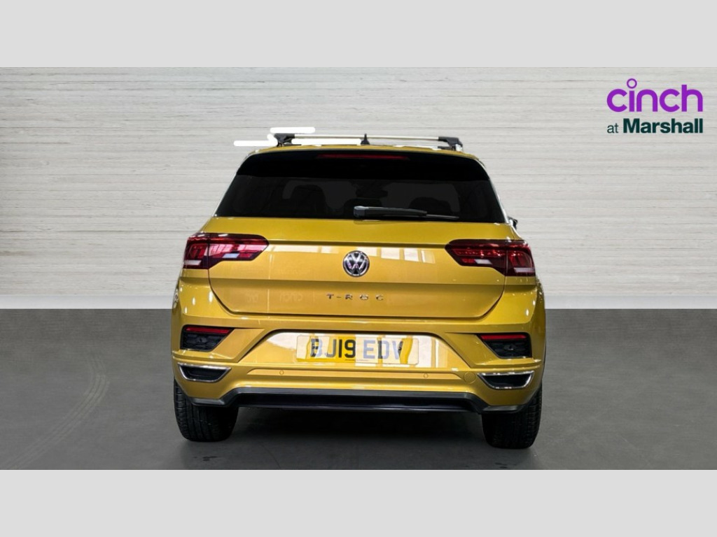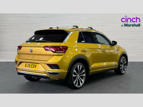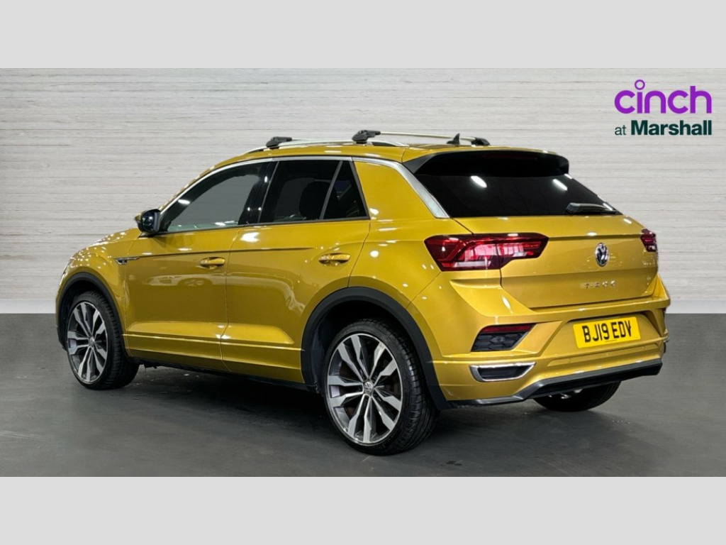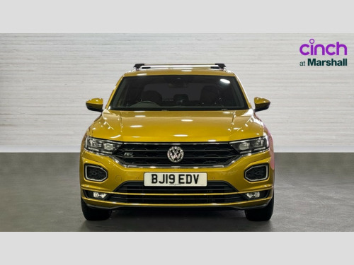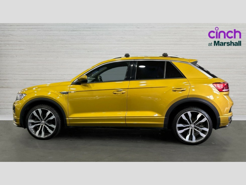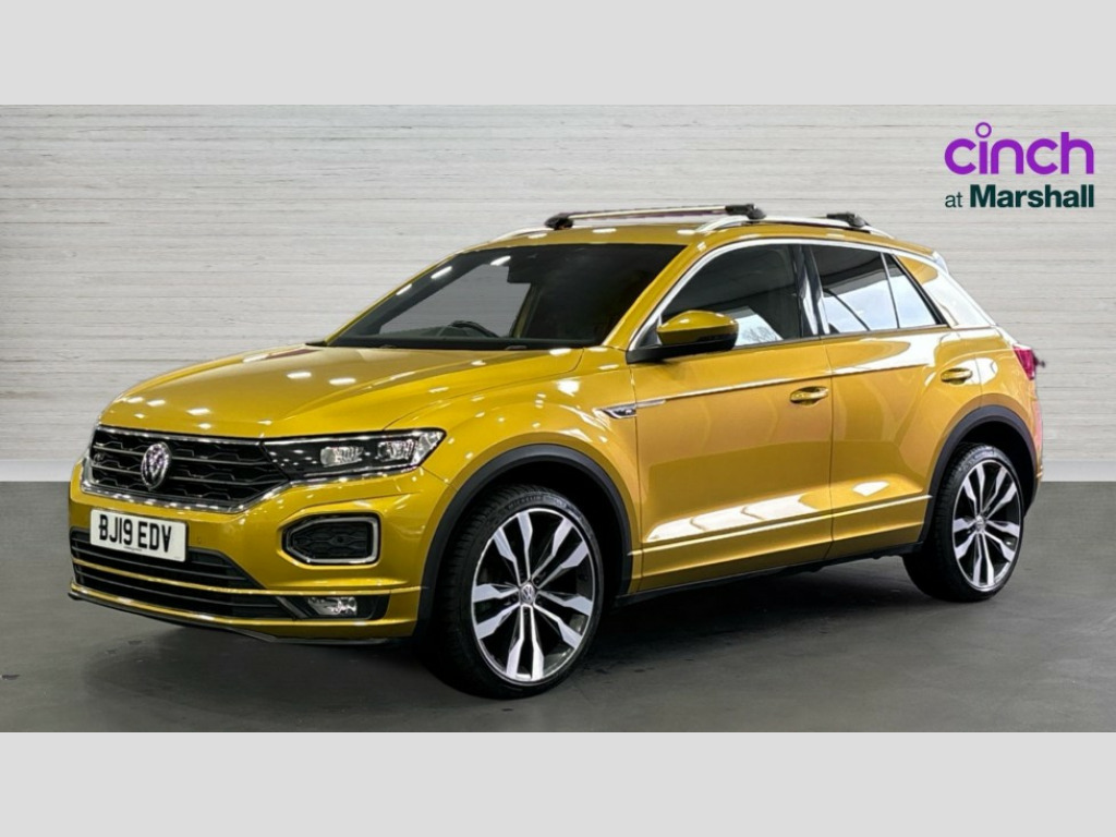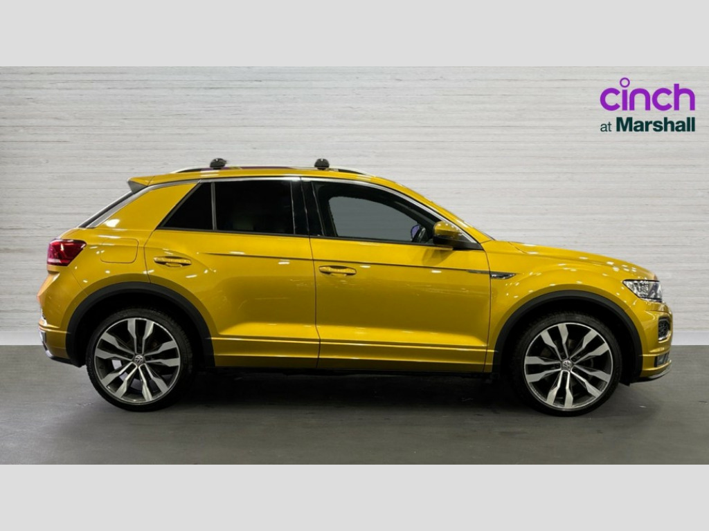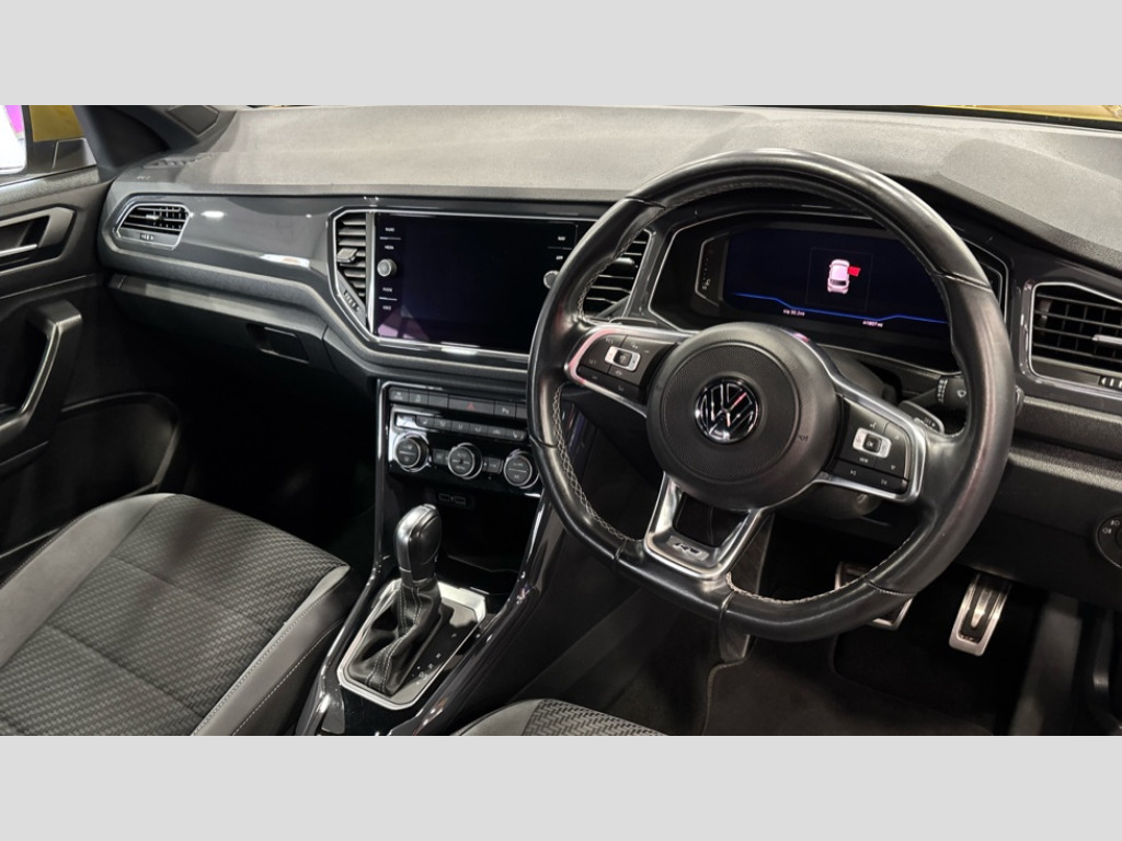 Volkswagen T-Roc 1.5 TSI EVO R-Line 5dr DSG 2 USB connection charging sockets, Active Info Display, 10.3" high resolution TFT dash display screen with customised information, Adaptive cruise control, App-Connect, Automatic start/stop system, Bluetooth telephone and audio connection for compatible devices, Car information display, Car-Net Security and Service, Discover navigation, 8" touch screen navigation/infotainment system with Car-Net, European map, CD/radio, 2D/3D map and speed limiter, Driver alert system with audible and visual fatigue detection system, Driving Mode Selection with four preset modes - Eco, normal, sport or individual modes, Front assist, radar sensor controlled distance monitor, city emergency braking + predictive pedestrian protection, Lane assist, Multifunction computer with visual gear change recommendation for fuel consumption, Progressive power assisted steering, Service interval indicator, Think blue trainer driver tips and journey analysis, Voice activation, Warning sound and light for doors and tailgate open, Warning sound and light for front seatbelts unfastened, Battery regeneration during braking, Sports suspension, Bluetooth - Simultaneous pairing of 2 compatible mobile devices, DAB Digital radio, Dynamic navigation based on TMC+, Multi device interface (MDI) with USB connection, Music playback - MP3, WMA and AAC files, Premium USB cable in choice of either Apple or Android smartphone compatibility, SD card slot, SMS functionality - read, compose and send SMS messages using touch-screen display, Three route options - Fast, Short, Eco, Title and cover art display, Auto dimming interior rear view mirror, Automatic hazard lights activation under emergency braking, Black grained lower door protectors, Black grained wheel arches, Body colour door handles, Body colour rear roof spoiler, Chrome effect left and right trapezoid exhaust tailpipe fascia surround, Chrome trim on upper and lower radiator grille, Door mirror integrated indicators, Dusk sensor, Electrically foldable, adjustable and heated door mirrors with puddle lights and reverse activated kerb-view adjustment on passenger's door mirror, Front and rear electric windows, Front fog lights with static cornering function, Front windscreen wiper with intermittent wipe and 4 position delay, Fully galvanised body, Heated rear window, High level 3rd brake light, LED darkened rear light clusters, LED rear number plate lights, Manual coming/automatic leaving home lighting function, Rain sensor, Rear tinted glass from B-pillar backwards approx 65% tinted, Rear windscreen washer and wiper with interval delay, 12V socket in centre console storage area, 2 LED front and rear reading lights, 3 rear head restraints, 4 load lashing points in luggage compartment, Aluminium pedals, Ambient lighting in front footwell and light strips below trim in front doors, Black roof lining and sun visors, Carbon flag cloth upholstery, Climate control - 2 zone electronic air conditioning with automatic air recirculation and allergy filter, Drawer under drivers seat, Front + rear carpet mats, Front centre armrest with storage compartment, longitudinal and height adjustable and two rear air vents, Front cupholders x 2, Front footwell illumination, Front seat back storage pockets, Front sport seats, Glovebox, Height adjustable front seats, Height/reach adjust steering wheel, Illuminated vanity mirrors, Instrument lighting, white adjustable panel illumination, Interior light delay, Isofix easy fit child seat preparation for 2 outer rear seats, Load through provision with single cup holder when folded down, Luggage compartment cover, removable, Luggage compartment lighting, R Line badge, Split folding rear seat backrests with centre armrest, Storage compartment in left and right luggage area, Storage compartment in rear doors, Storage compartments in driver and front passenger doors, Three spoke multi function leather trimmed steering wheel and gear knob including paddle shift, Unique R Line door sill protectors, R line styling pack - T-Roc, Winter pack - T-Roc, 3 rear three point seatbelts, ABS, Driver and front passenger safety-optimised head restraints, Electronic parking brake with auto hold, ESC with EDL, ASR, EDTC and trailer stabilisation function, Front and rear curtain airbags, driver and front passenger airbags with passenger deactivation switch and front side impact airbags, Rigid safety cell with front and rear crumple zones, Three point height adjust front seatbelts + pretensioners, Tyre pressure loss indicator, Ventilated front and rear disc brakes, Volkswagen roadside assistance, Alarm with remote central locking and interior protection, Electronic engine immobiliser, Remote central locking with 2 remote folding keys, Caribou grey decorative inserts in dash and door panel, 19" Suzuka alloy wheels with low rolling resistance tyres and anti wheel bolts