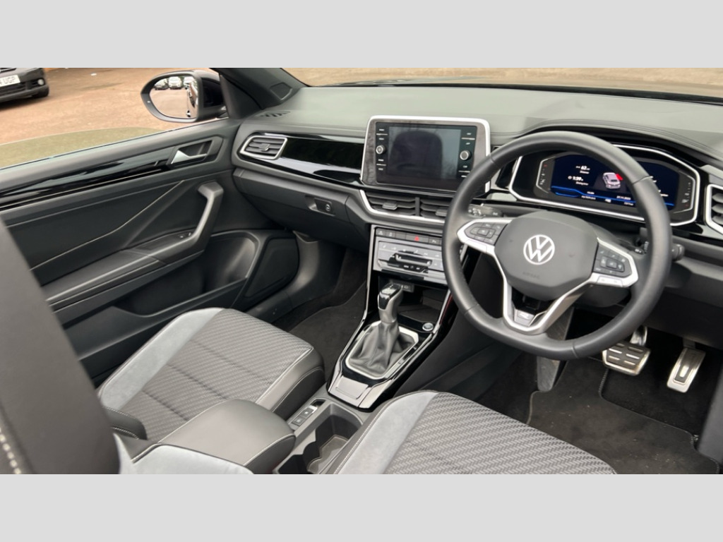 Volkswagen T-Roc 1.5 TSI R-Line 2dr DSG Adaptive cruise control and speed limiter, Advanced driver attention and drowsiness monitor, Bluetooth mobile phone interface, Brake pad wear indicator, Car information display, Digital Cockpit Pro with 10.25" Display, Driver tips and journey analysis, Emergency call service, Modified key software - reduce switch off time for key status change to Long no motion, Multifunction computer with visual gear change recommendation for fuel consumption, Multifunction front facing camera, Online services, Park assist including front and rear parking sensors, Speedo and rev counter, electronic odometer, trip, service interval display and exterior temperature gauge, Start/stop system with brake energy recovery, Tailgate/trunk lid release from outside, Warning sound and light for front seatbelts unfastened, Diversity antenna for FM reception, Music playback - MP3, WMA and AAC files, SMS functionality - read, compose and send SMS messages using touch-screen display, Title and cover art display, USB-C Interface and USB charging socket, We Connect and We Connect Plus functionality, Ambient lighting with logo projection, Auto dimming interior rear view mirror, Automatic hazard lights activation under emergency braking, Automatic headlight control with LED separate daytime running lights with coming/leaving home function, Black roof, Body colour door handles, Body colour rear spoiler, Chrome effect left and right trapezoid exhaust tailpipe fascia surround, Chrome trim on upper and lower radiator grille, Dark red rear combination lamps in LED technology, Dusk sensor, Exterior mirrors aspherical on driver side, convex on front passenger side, Heat insulating glass windscreen, High level 3rd brake light, LED rear number plate lights, Power operated canvas convertible top, Power windows with comfort operation and circuit breaker, R-Line design body coloured bumpers, Rain sensor, Rear boot, Rear exhaust tailpipe, Rear fog light on one side and reversing lights on both sides, Remote electrically foldable door mirrors, puddle lights and reverse activated passenger door mirror, Volkswagen roundel, Windscreen wiper with intermittent wipe light, Without exterior ambient lighting, 12V socket in centre console storage area, 2 LED front reading lights, 2 seat bench in 2nd row, 50:50 Split folding rear seat backrests with fixed rear seat bench, Air care climatronic air conditoning system with active combination filter and 2-zone temperature control, Black door lower parts with chrome trim, Chrome plated surround to light, mirror and window switch, Door and side trim panel with leatherette insert, Easy entry backrest release, Front and rear carpet mats with black stitching, Front centre armrest, Front cupholders x 2, Front door pockets, Front seat back storage pockets, Front sports comfort seats with manual height adjustment, Heated leather wrapped multi function sports steering wheel with tiptronic, Height/reach adjust steering wheel, Inserts of front seats and outer rear seats in ArtVelours titan black, Instrument lighting, white adjustable panel illumination, Interior light delay, Interior light in footwell, Interior lighting with switch off delay and contact switches on all doors, Interior white ambient lighting and surround lighting, Isofix child seat preparation, Lockable glove compartment with light, Luggage compartment lighting, Power adjustable lumbar support in front, Rear head restraints, Single front passenger seat, Stainless steel pedals, Sun visors with illuminated vanity mirrors, Unique R Line door sill protectors, Driver assistance pack without proactive passenger protection - T-Roc Cabriolet DSG, Sports pack - T-Roc cabriolet, 2 x 3-point seatbelts/outer rear seats with ECE label, Driver and front passenger airbag with front passenger airbag deactivation, Driver and front passenger safety-optimised head restraints, Drivers seatbelt reminder, Electronic parking brake, Electronic Stability Control (ESC) including ABS, ASR and EDL, Front and rear disc brakes, Front assist with autonomous emergency braking, Pedestrian monitoring, Predictive pedestrian protection, Rigid safety cell with front and rear crumple zones, Side airbag/thorax airbag system, for front passengers, Three point height adjust front seatbelts + pretensioners, Two tone horn, Tyre pressure loss indicator, Volkswagen roadside assistance, Anti-theft alarm system with interior protection and central locking system with SAFELOCK, radio remote control and 2 remote control folding keys, Electronic engine immobiliser, Trims for alloy wheels