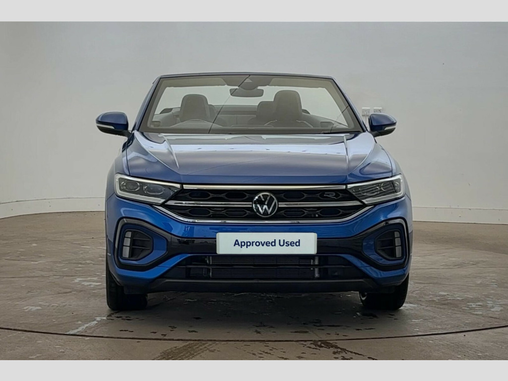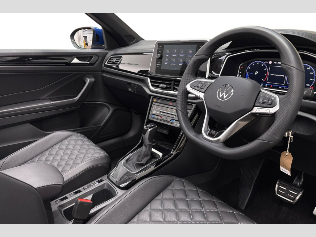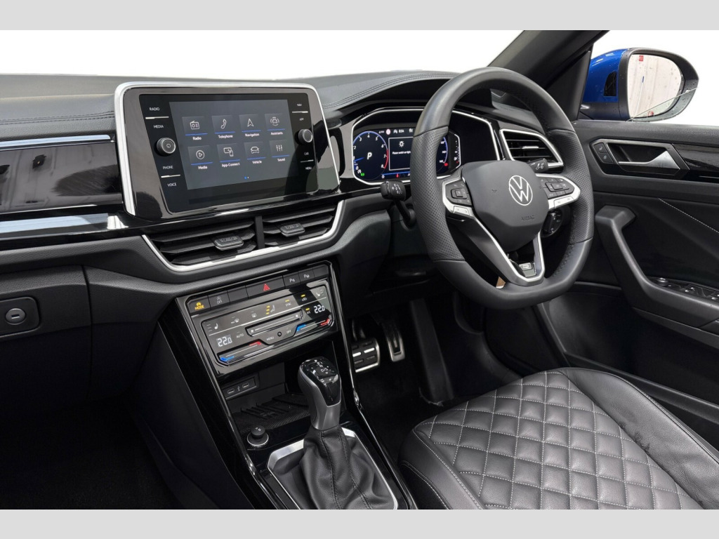 Volkswagen T-Roc 1.5 TSI R-Line 2dr DSG Adaptive cruise control and speed limiter, Advanced driver attention and drowsiness monitor, Brake pad wear indicator, Car information display, Digital Cockpit Pro with 10.25" Display, Driver tips and journey analysis, Emergency call service, Modified key software - reduce switch off time for key status change to Long no motion, Multifunction computer with visual gear change recommendation for fuel consumption, Multifunction front facing camera, Online services, Park assist including front and rear parking sensors, Speedo and rev counter, electronic odometer, trip, service interval display and exterior temperature gauge, Start/stop system with brake energy recovery, Tailgate/trunk lid release from outside, Warning sound and light for front seatbelts unfastened, Diversity antenna for FM reception, Mobile phone interface with inductive charging feature, Music playback - MP3, WMA and AAC files, SMS functionality - read, compose and send SMS messages using touch-screen display, Title and cover art display, USB-C Interface and USB charging socket, We Connect and We Connect Plus functionality, Ambient lighting with logo projection, Auto dimming interior rear view mirror, Automatic hazard lights activation under emergency braking, Automatic headlight control with LED separate daytime running lights with coming/leaving home function, Black roof, Body colour door handles, Body colour rear boot spoiler, Chrome effect left and right trapezoid exhaust tailpipe fascia surround, Chrome trim on upper and lower radiator grille, Dark red rear combination lamps in LED technology, Dusk sensor, Exterior mirrors aspherical on driver side, convex on front passenger side, Heat insulating glass windscreen, LED 3rd brake light, LED rear number plate lights, Power operated canvas convertible top, Power windows with comfort operation and circuit breaker, R-Line design body coloured bumpers, Rain sensor, Rear boot, Rear exhaust tailpipe, Rear fog light on one side and reversing lights on both sides, Remote electrically foldable door mirrors, puddle lights and reverse activated passenger door mirror, Volkswagen roundel, Windscreen wiper with intermittent wipe light, Without exterior ambient lighting, 12V socket in centre console storage area, 2 LED front reading lights, 2 seat bench in 2nd row, 50:50 Split folding rear seat backrests with fixed rear seat bench, Air care climatronic air conditoning system with active combination filter and 2-zone temperature control, Black door lower parts with chrome trim, Chrome plated surround to light, mirror and window switch, Door and side trim panel with leatherette insert, Easy entry backrest release, Front and rear carpet mats with black stitching, Front centre armrest, Front cupholders x 2, Front door pockets, Front seat back storage pockets, Front sports comfort seats with manual height adjustment, Heated leather wrapped multi function sports steering wheel with tiptronic, Height/reach adjust steering wheel, Inserts of front seats and outer rear seats in ArtVelours titan black, Instrument lighting, white adjustable panel illumination, Interior light delay, Interior light in footwell, Interior lighting with switch off delay and contact switches on all doors, Interior white ambient lighting and surround lighting, Isofix child seat preparation, Lockable glove compartment with light, Luggage compartment lighting, Power adjustable lumbar support in front, Rear head restraints, Single front passenger seat, Stainless steel pedals, Sun visors with illuminated vanity mirrors, Unique R Line door sill protectors, Driver assistance pack without proactive passenger protection - T-Roc Cabriolet DSG, Sports pack - T-Roc cabriolet, 2 x 3-point seatbelts/outer rear seats with ECE label, Driver and front passenger airbag with front passenger airbag deactivation, Driver and front passenger safety-optimised head restraints, Drivers seatbelt reminder, Electronic parking brake, Electronic Stability Control (ESC) including ABS, ASR and EDL, Front and rear disc brakes, Front assist with autonomous emergency braking, Pedestrian monitoring, Predictive pedestrian protection, Rigid safety cell with front and rear crumple zones, Side airbag/thorax airbag system, for front passengers, Three point height adjust front seatbelts + pretensioners, Two tone horn, Tyre pressure loss indicator, Volkswagen roadside assistance, Anti-theft alarm system with interior protection and central locking system with SAFELOCK, radio remote control and 2 remote control folding keys, Electronic engine immobiliser, Trims for alloy wheels
