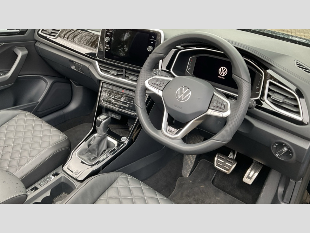 Volkswagen T-Roc 1.5 TSI R-Line 2dr DSG Adaptive cruise control and speed limiter, Advanced driver attention and drowsiness monitor, Brake pad wear indicator, Car information display, Digital Cockpit Pro with 10.25" Display, Driver tips and journey analysis, Emergency call service, Modified key software - reduce switch off time for key status change to Long no motion, Multifunction computer with visual gear change recommendation for fuel consumption, Multifunction front facing camera, Online services, Park assist including front and rear parking sensors, Speedo and rev counter, electronic odometer, trip, service interval display and exterior temperature gauge, Start/stop system with brake energy recovery, Tailgate/trunk lid release from outside, Warning sound and light for front seatbelts unfastened, Diversity antenna for FM reception, Mobile phone interface with inductive charging feature, Music playback - MP3, WMA and AAC files, SMS functionality - read, compose and send SMS messages using touch-screen display, Title and cover art display, USB-C Interface and USB charging socket, We Connect and We Connect Plus functionality, Ambient lighting with logo projection, Auto dimming interior rear view mirror, Automatic hazard lights activation under emergency braking, Automatic headlight control with LED separate daytime running lights with coming/leaving home function, Black roof, Body colour door handles, Body colour rear boot spoiler, Chrome effect left and right trapezoid exhaust tailpipe fascia surround, Chrome trim on upper and lower radiator grille, Dark red rear combination lamps in LED technology, Dusk sensor, Exterior mirrors aspherical on driver side, convex on front passenger side, Heat insulating glass windscreen, LED 3rd brake light, LED rear number plate lights, Power operated canvas convertible top, Power windows with comfort operation and circuit breaker, R-Line design body coloured bumpers, Rain sensor, Rear boot, Rear exhaust tailpipe, Rear fog light on one side and reversing lights on both sides, Remote electrically foldable door mirrors, puddle lights and reverse activated passenger door mirror, Volkswagen roundel, Windscreen wiper with intermittent wipe light, Without exterior ambient lighting, 12V socket in centre console storage area, 2 LED front reading lights, 2 seat bench in 2nd row, 50:50 Split folding rear seat backrests with fixed rear seat bench, Air care climatronic air conditoning system with active combination filter and 2-zone temperature control, Black door lower parts with chrome trim, Chrome plated surround to light, mirror and window switch, Door and side trim panel with leatherette insert, Easy entry backrest release, Front and rear carpet mats with black stitching, Front centre armrest, Front cupholders x 2, Front door pockets, Front seat back storage pockets, Front sports comfort seats with manual height adjustment, Heated leather wrapped multi function sports steering wheel with tiptronic, Height/reach adjust steering wheel, Inserts of front seats and outer rear seats in ArtVelours titan black, Instrument lighting, white adjustable panel illumination, Interior light delay, Interior light in footwell, Interior lighting with switch off delay and contact switches on all doors, Interior white ambient lighting and surround lighting, Isofix child seat preparation, Lockable glove compartment with light, Luggage compartment lighting, Power adjustable lumbar support in front, Rear head restraints, Single front passenger seat, Stainless steel pedals, Sun visors with illuminated vanity mirrors, Unique R Line door sill protectors, Driver assistance pack without proactive passenger protection - T-Roc Cabriolet DSG, Sports pack - T-Roc cabriolet, 2 x 3-point seatbelts/outer rear seats with ECE label, Driver and front passenger airbag with front passenger airbag deactivation, Driver and front passenger safety-optimised head restraints, Drivers seatbelt reminder, Electronic parking brake, Electronic Stability Control (ESC) including ABS, ASR and EDL, Front and rear disc brakes, Front assist with autonomous emergency braking, Pedestrian monitoring, Predictive pedestrian protection, Rigid safety cell with front and rear crumple zones, Side airbag/thorax airbag system, for front passengers, Three point height adjust front seatbelts + pretensioners, Two tone horn, Tyre pressure loss indicator, Volkswagen roadside assistance, Anti-theft alarm system with interior protection and central locking system with SAFELOCK, radio remote control and 2 remote control folding keys, Electronic engine immobiliser, Trims for alloy wheels