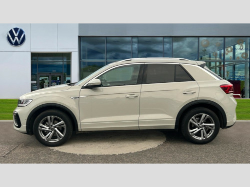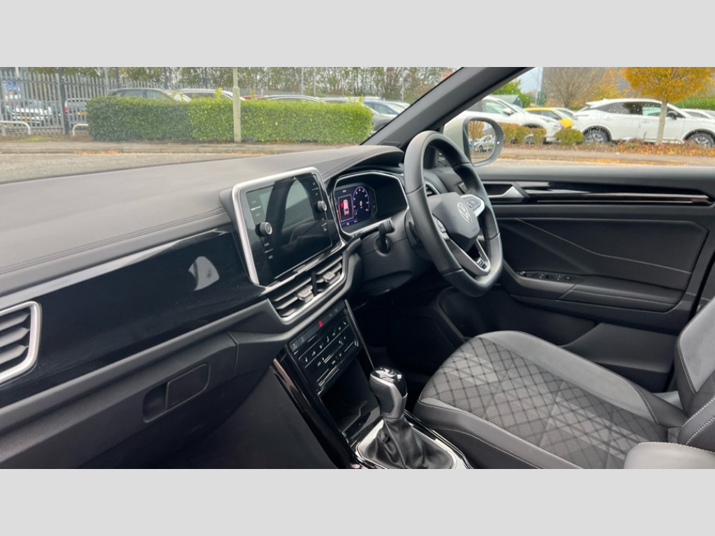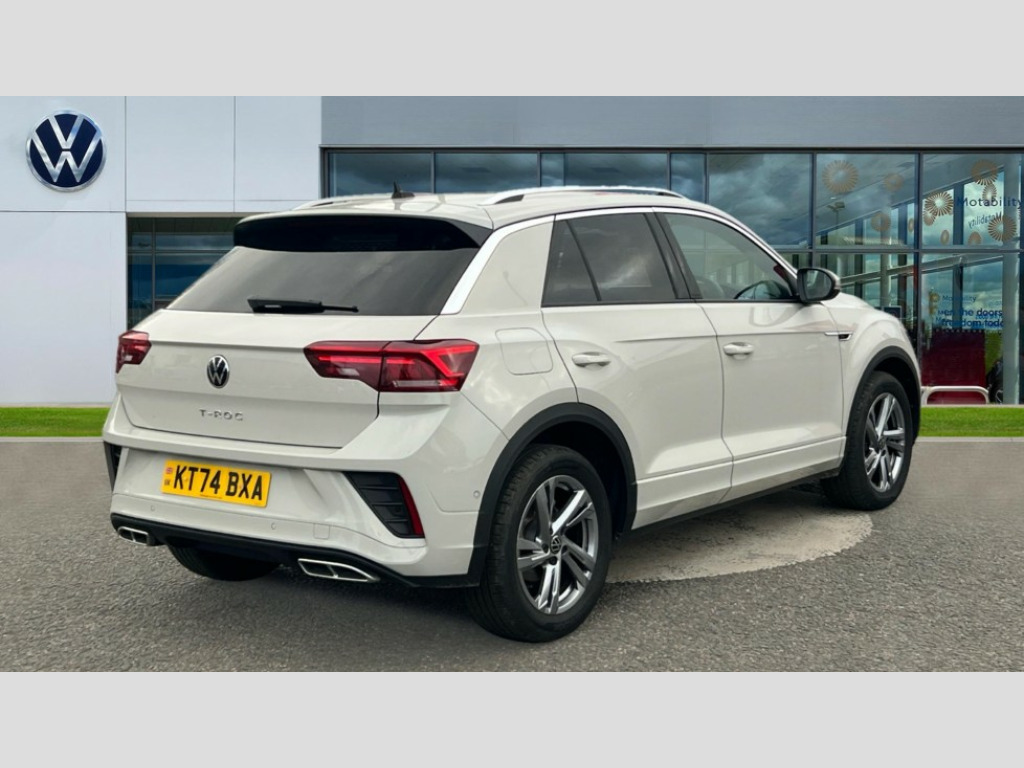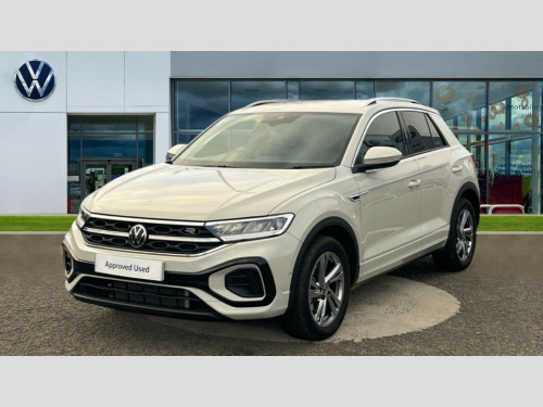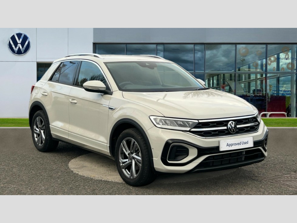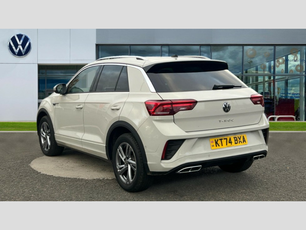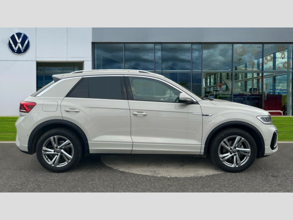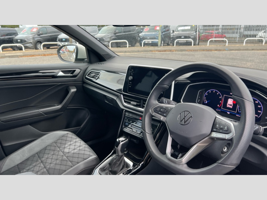 Volkswagen T-Roc 1.5 TSI R-Line 5dr DSG 10.25" Digital cockpit pro, Advanced driver attention and drowsiness monitor, Emergency call service, Lane keeping system Lane Assist, Mobile phone interface, Modified key software - reduce switch off time for key status change to Long no motion, Online services, Park assist including front and rear parking sensors, Service interval indicator, Tailgate/trunk lid release from outside, Think blue trainer driver tips and journey analysis, Warning sound and light for front seatbelts unfastened, Wireless app connect, Battery regeneration during braking, Start/stop function with battery regeneration, DAB Digital radio, Diversity antenna for FM reception, Front and rear 6 speakers, Music playback - MP3, WMA and AAC files, Premium USB cable in choice of either Apple or Android smartphone compatibility, SD card slot, Simultaneous pairing of 2 compatible mobile devices, Title and cover art display, We Connect and We Connect Plus functionality, Auto dimming interior rear view mirror, Automatic hazard lights activation under emergency braking, Automatic headlight control with LED separate daytime running lights with coming/leaving home function, Body coloured exterior mirror housings and door handles, Electrically adjustable and heated door mirrors, Extended roof spoiler, Exterior mirrors aspherical on driver side, convex on front passenger side, External USB type C socket and charging sockets, Front windscreen wiper with intermittent wipe and 4 position delay, Heated rear window, LED 3rd brake light, LED rear combination lamps, LED rear number plate lights, Power windows with comfort operation and circuit breaker, Privacy glass for rear side windows and rear window, R-Line design body coloured bumpers, Rain sensor, Rear exhaust tailpipe, Rear fog light on one side and reversing lights on both sides, Rear side wing doors, Rear wash/wipe with intermittent wipe setting, Remote electrically foldable door mirrors, puddle lights and reverse activated passenger's door mirror, 12V power socket in centre console, 3 rear head restraints, 3 seat bench in 2nd row, 4 load lashing points in luggage compartment, Air care climatronic air conditoning system with active combination filter and 2-zone temperature control, Black roof lining, Chrome plated decorative trims, Chrome plated radiator grille inserts, air vent surrounds and light switch surrounds, Door and side trim panel with leatherette insert, Front + rear carpet mats, Front centre armrest, Front cupholders x 2, Front footwell illumination, Front reading light, Front scuff plates with R Line logo, Front seat back storage pockets, Glove compartment door with light, Instrument lighting, white adjustable panel illumination, Interior ambient lighting and surround lighting, Interior light delay, Isofix child seat preparation, Leather gearshift handle, Load-through provision with cup holder when folded down ('Unsplit rear seat bench, split folding backrest, with centre armrest), Luggage compartment lighting, Single front passenger seat, Stainless steel pedals, Storage compartment in left and right luggage area, Storage compartment in rear doors, Storage compartments in driver and front passenger doors, Sunvisors with illuminated vanity mirrors, Variable boot floor, height adjustable and removable, Driver assistance pack without proactive passenger protection - T-Roc, 3 point height adj front seatbelts + pretensioners, 3 point seatbelts in outer rear with ECE label, ABS, Child locks on rear doors, City emergency braking and pedestrian monitoring, Driver and front passenger airbag with front passenger airbag deactivation, Driver and front passenger safety-optimised head restraints, Drivers seatbelt reminder, Electronic parking brake, Electronic Stability Control (ESC) inc EDL (Electronic Differential Lock) and ASR (Traction Control), Front and rear passengers curtain airbag system including front side airbags, Hill start assist, Predictive pedestrian protection, Rear disc brakes, Two tone horn, Tyre pressure loss indicator, Volkswagen roadside assistance, Piano black decorative inserts in dashboard and front door trim panels, Trims for alloy wheels