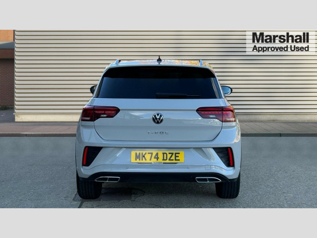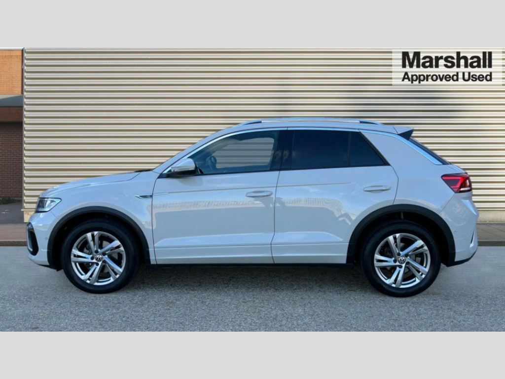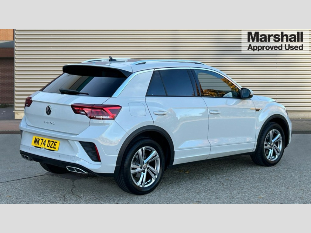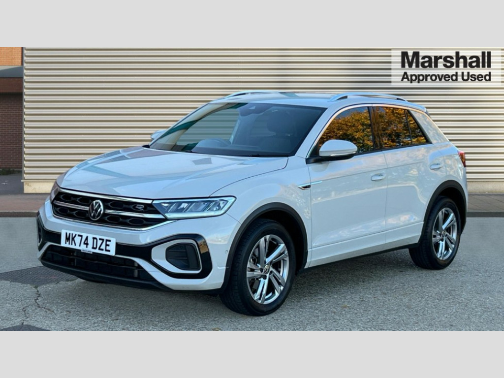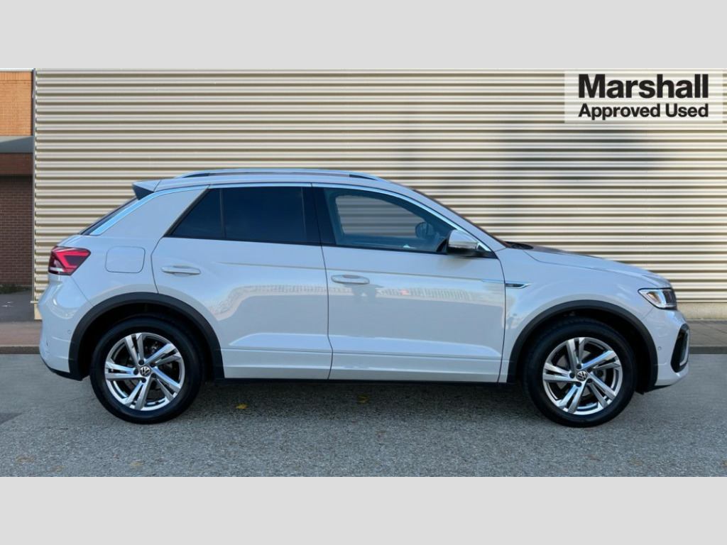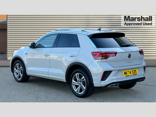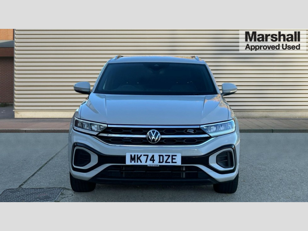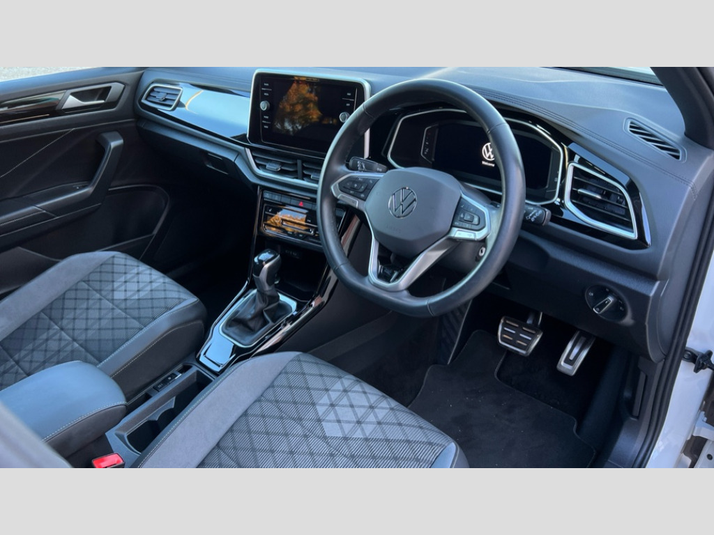 Volkswagen T-Roc 1.5 TSI R-Line 5dr DSG 10.25" Digital cockpit pro, Advanced driver attention and drowsiness monitor, Emergency call service, Lane keeping system Lane Assist, Mobile phone interface, Modified key software - reduce switch off time for key status change to Long no motion, Online services, Park assist including front and rear parking sensors, Service interval indicator, Tailgate/trunk lid release from outside, Think blue trainer driver tips and journey analysis, Warning sound and light for front seatbelts unfastened, Wireless app connect, Wireless Smartphone charger, Battery regeneration during braking, Start/stop function with battery regeneration, DAB Digital radio, Diversity antenna for FM reception, Front and rear 6 speakers, Music playback - MP3, WMA and AAC files, Premium USB cable in choice of either Apple or Android smartphone compatibility, SD card slot, Simultaneous pairing of 2 compatible mobile devices, Title and cover art display, We Connect and We Connect Plus functionality, Auto dimming interior rear view mirror, Automatic hazard lights activation under emergency braking, Automatic headlight control with LED separate daytime running lights with coming/leaving home function, Electrically adjustable and heated door mirrors, Extended roof spoiler, Exterior mirrors aspherical on driver side, convex on front passenger side, External USB type C socket and charging sockets, Front windscreen wiper with intermittent wipe and 4 position delay, Heated rear window, LED 3rd brake light, LED rear combination lamps, LED rear number plate lights, Power windows with comfort operation and circuit breaker, R-Line design body coloured bumpers, Rain sensor, Rear exhaust tailpipe, Rear fog light on one side and reversing lights on both sides, Rear side wing doors, Rear wash/wipe with intermittent wipe setting, Remote electrically foldable door mirrors, puddle lights and reverse activated passenger's door mirror, 12V power socket in centre console, 3 rear head restraints, 3 seat bench in 2nd row, 4 load lashing points in luggage compartment, Air care climatronic air conditoning system with active combination filter and 2-zone temperature control, Black roof lining, Chrome plated radiator grille inserts, air vent surrounds and light switch surrounds, Door and side trim panel with leatherette insert, Front + rear carpet mats, Front centre armrest, Front cupholders x 2, Front footwell illumination, Front reading light, Front scuff plates with R Line logo, Front seat back storage pockets, Glove compartment door with light, Instrument lighting, white adjustable panel illumination, Interior ambient lighting and surround lighting, Interior light delay, Isofix child seat preparation, Leather gearshift handle, Load-through provision with cup holder when folded down ('Unsplit rear seat bench, split folding backrest, with centre armrest), Luggage compartment lighting, Single front passenger seat, Stainless steel pedals, Storage compartment in left and right luggage area, Storage compartment in rear doors, Storage compartments in driver and front passenger doors, Sunvisors with illuminated vanity mirrors, Variable boot floor, height adjustable and removable, Driver assistance pack without proactive passenger protection - T-Roc, 3 point height adj front seatbelts + pretensioners, 3 point seatbelts in outer rear with ECE label, ABS, Child locks on rear doors, City emergency braking and pedestrian monitoring, Driver and front passenger airbag with front passenger airbag deactivation, Driver and front passenger safety-optimised head restraints, Drivers seatbelt reminder, Electronic parking brake, Electronic Stability Control (ESC) inc EDL (Electronic Differential Lock) and ASR (Traction Control), Front and rear passengers curtain airbag system including front side airbags, Hill start assist, Predictive pedestrian protection, Rear disc brakes, Two tone horn, Tyre pressure loss indicator, Volkswagen roadside assistance, Trims for alloy wheels