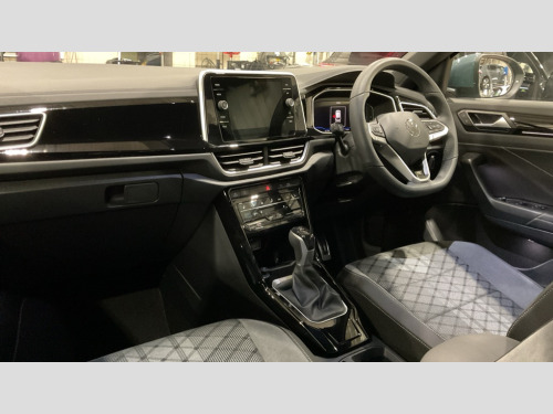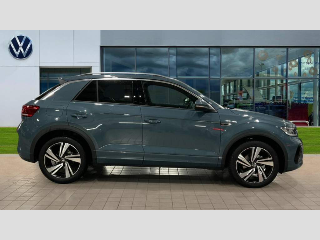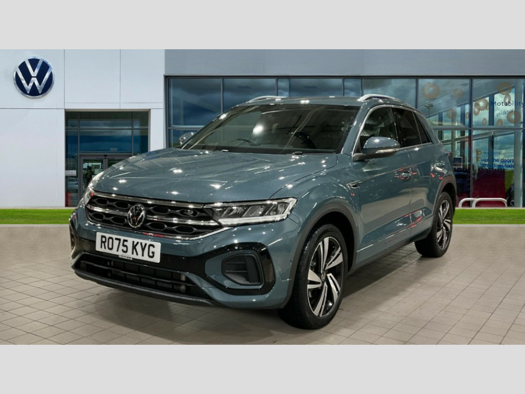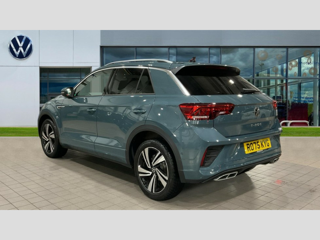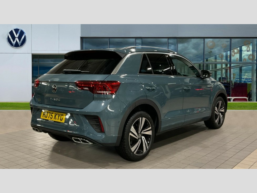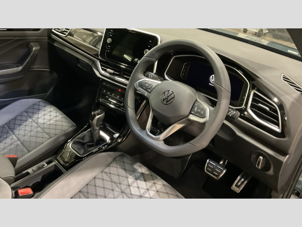 Volkswagen T-Roc 1.5 TSI R-Line 5dr DSG 10.25" Digital cockpit pro, Advanced driver attention and drowsiness monitor, Emergency call service, Lane keeping system Lane Assist, Mobile phone interface, Modified key software - reduce switch off time for key status change to Long no motion, Online services, Park assist including front and rear parking sensors, Service interval indicator, Tailgate/trunk lid release from outside, Think blue trainer driver tips and journey analysis, Warning sound and light for front seatbelts unfastened, Wireless app connect, Battery regeneration during braking, Start/stop function with battery regeneration, DAB Digital radio, Diversity antenna for FM reception, Front and rear 6 speakers, Music playback - MP3, WMA and AAC files, Premium USB cable in choice of either Apple or Android smartphone compatibility, SD card slot, Simultaneous pairing of 2 compatible mobile devices, Title and cover art display, We Connect and We Connect Plus functionality, Auto dimming interior rear view mirror, Automatic hazard lights activation under emergency braking, Automatic headlight control with LED separate daytime running lights with coming/leaving home function, Body coloured exterior mirror housings and door handles, Electrically adjustable and heated door mirrors, Extended roof spoiler, Exterior mirrors aspherical on driver side, convex on front passenger side, External USB type C socket and charging sockets, Front windscreen wiper with intermittent wipe and 4 position delay, Heated rear window, LED 3rd brake light, LED rear combination lamps, LED rear number plate lights, Power windows with comfort operation and circuit breaker, Privacy glass for rear side windows and rear window, R-Line design body coloured bumpers, Rain sensor, Rear exhaust tailpipe, Rear fog light on one side and reversing lights on both sides, Rear side wing doors, Rear wash/wipe with intermittent wipe setting, Remote electrically foldable door mirrors, puddle lights and reverse activated passenger's door mirror, 12V power socket in centre console, 3 rear head restraints, 3 seat bench in 2nd row, 4 load lashing points in luggage compartment, Air care climatronic air conditoning system with active combination filter and 2-zone temperature control, Black roof lining, Chrome plated decorative trims, Chrome plated radiator grille inserts, air vent surrounds and light switch surrounds, Door and side trim panel with leatherette insert, Front + rear carpet mats, Front centre armrest, Front cupholders x 2, Front footwell illumination, Front reading light, Front scuff plates with R Line logo, Front seat back storage pockets, Glove compartment door with light, Instrument lighting, white adjustable panel illumination, Interior ambient lighting and surround lighting, Interior light delay, Isofix child seat preparation, Leather gearshift handle, Load-through provision with cup holder when folded down ('Unsplit rear seat bench, split folding backrest, with centre armrest), Luggage compartment lighting, Single front passenger seat, Stainless steel pedals, Storage compartment in left and right luggage area, Storage compartment in rear doors, Storage compartments in driver and front passenger doors, Sunvisors with illuminated vanity mirrors, Variable boot floor, height adjustable and removable, Driver assistance pack without proactive passenger protection - T-Roc, 3 point height adj front seatbelts + pretensioners, 3 point seatbelts in outer rear with ECE label, ABS, Child locks on rear doors, City emergency braking and pedestrian monitoring, Driver and front passenger airbag with front passenger airbag deactivation, Driver and front passenger safety-optimised head restraints, Drivers seatbelt reminder, Electronic parking brake, Electronic Stability Control (ESC) inc EDL (Electronic Differential Lock) and ASR (Traction Control), Front and rear passengers curtain airbag system including front side airbags, Hill start assist, Predictive pedestrian protection, Rear disc brakes, Two tone horn, Tyre pressure loss indicator, Volkswagen roadside assistance, Piano black decorative inserts in dashboard and front door trim panels, Trims for alloy wheels