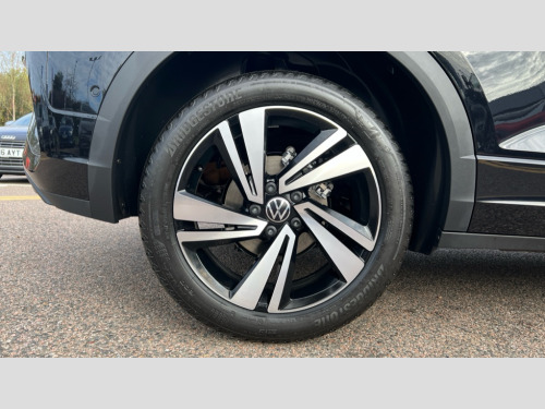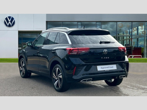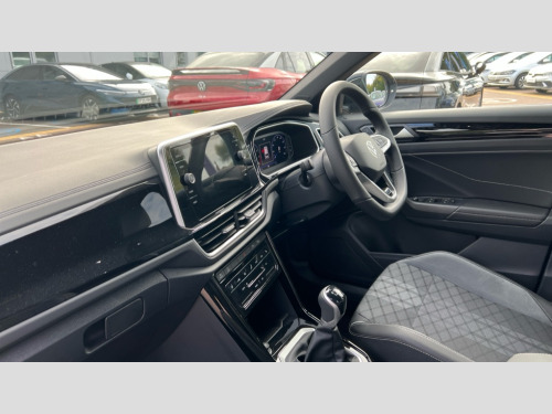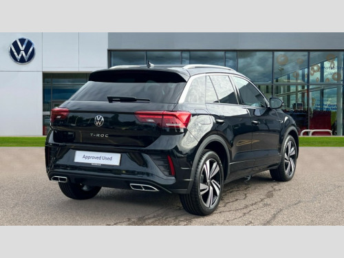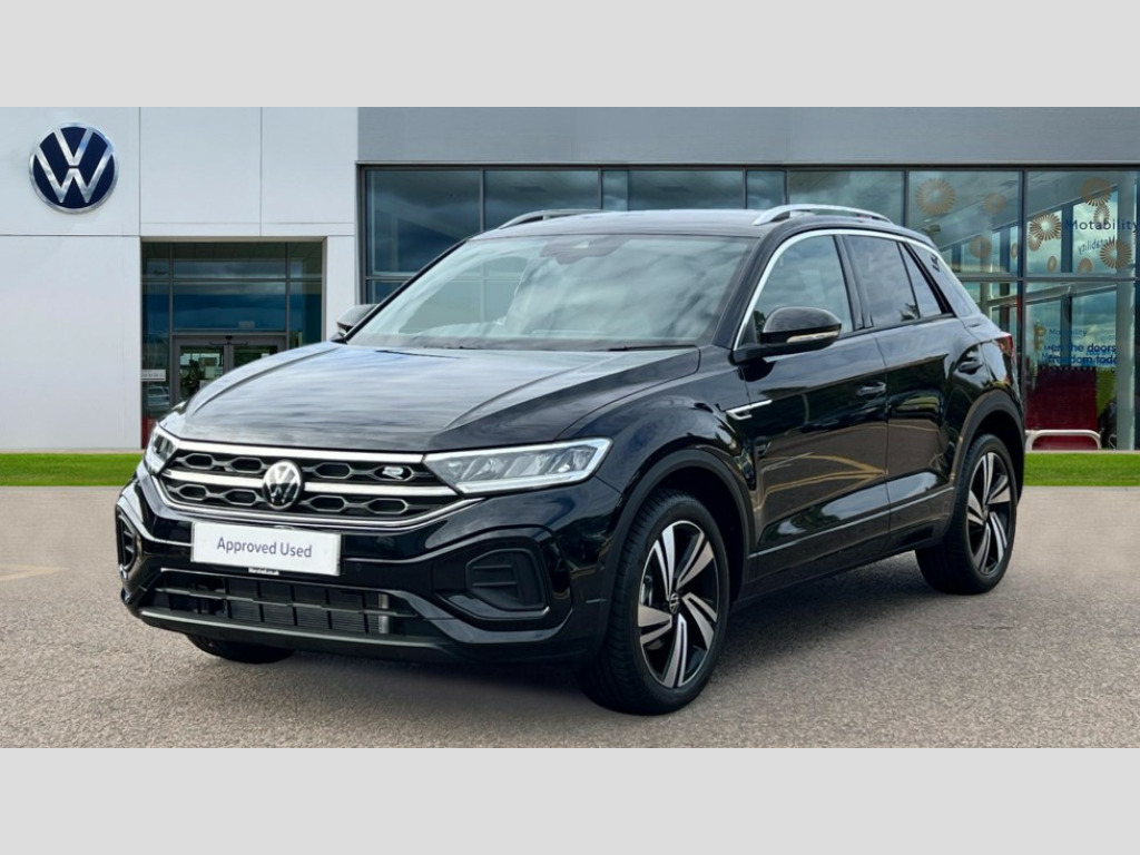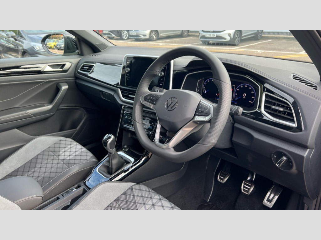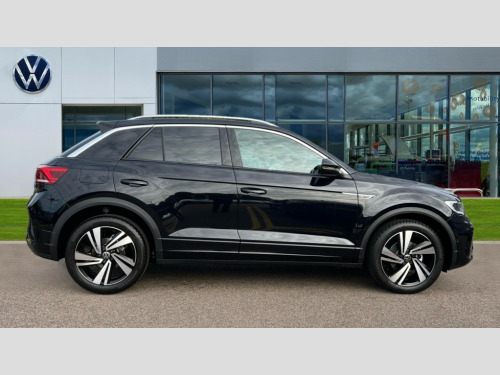 This 2025 Volkswagen T-Roc TSI R-Line is a Volkswagen manufacturer approved vehicle with only one owner from new. It features a 1.5 litre petrol engine and is Euro 6 compliant. The R-Line trim boasts a leather wrapped, heated, multifunction sports steering wheel, a sports seat pack, and striking 18 inch Nevada black diamond turned alloy wheels. For convenience and safety, it includes a rear view camera and Park Assist with front and rear parking sensors.