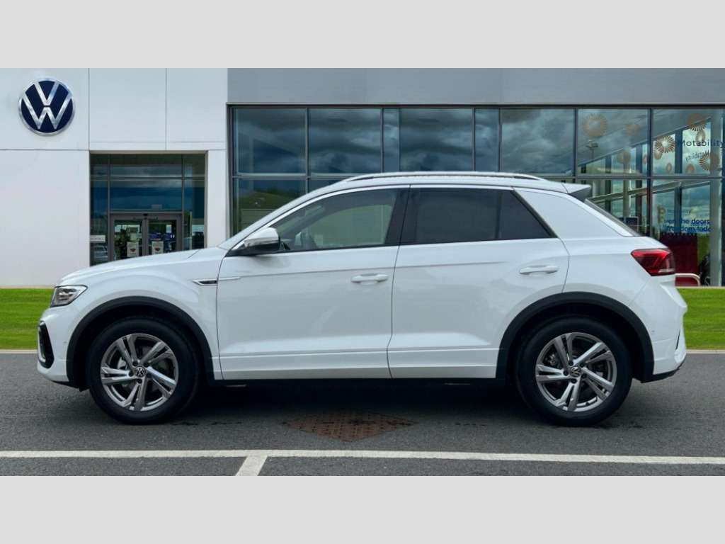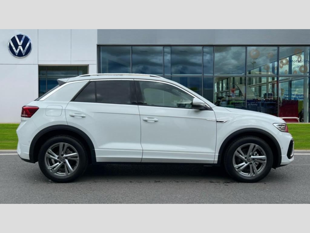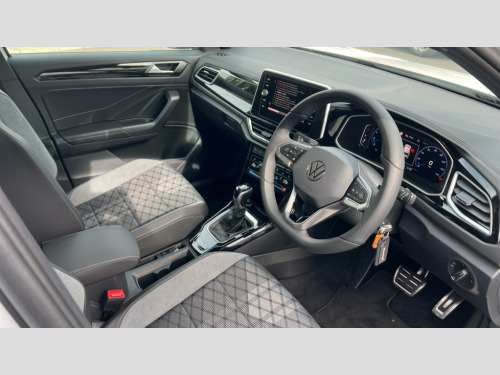 Volkswagen T-Roc 1.5 TSI R-Line 5dr DSG 10.25" Digital cockpit pro, Advanced driver attention and drowsiness monitor, Emergency call service, Lane keeping system Lane Assist, Mobile phone interface, Modified key software - reduce switch off time for key status change to Long no motion, Online services, Park assist including front and rear parking sensors, Service interval indicator, Tailgate/trunk lid release from outside, Think blue trainer driver tips and journey analysis, Warning sound and light for front seatbelts unfastened, Wireless app connect, Battery regeneration during braking, Start/stop function with battery regeneration, DAB Digital radio, Diversity antenna for FM reception, Front and rear 6 speakers, Music playback - MP3, WMA and AAC files, Premium USB cable in choice of either Apple or Android smartphone compatibility, SD card slot, Simultaneous pairing of 2 compatible mobile devices, Title and cover art display, We Connect and We Connect Plus functionality, Auto dimming interior rear view mirror, Automatic hazard lights activation under emergency braking, Automatic headlight control with LED separate daytime running lights with coming/leaving home function, Body coloured exterior mirror housings and door handles, Electrically adjustable and heated door mirrors, Extended roof spoiler, Exterior mirrors aspherical on driver side, convex on front passenger side, External USB type C socket and charging sockets, Front windscreen wiper with intermittent wipe and 4 position delay, Heated rear window, LED 3rd brake light, LED rear combination lamps, LED rear number plate lights, Power windows with comfort operation and circuit breaker, Privacy glass for rear side windows and rear window, R-Line design body coloured bumpers, Rain sensor, Rear exhaust tailpipe, Rear fog light on one side and reversing lights on both sides, Rear side wing doors, Rear wash/wipe with intermittent wipe setting, Remote electrically foldable door mirrors, puddle lights and reverse activated passenger's door mirror, 12V power socket in centre console, 3 rear head restraints, 3 seat bench in 2nd row, 4 load lashing points in luggage compartment, Air care climatronic air conditoning system with active combination filter and 2-zone temperature control, Black roof lining, Chrome plated decorative trims, Chrome plated radiator grille inserts, air vent surrounds and light switch surrounds, Door and side trim panel with leatherette insert, Front + rear carpet mats, Front centre armrest, Front cupholders x 2, Front footwell illumination, Front reading light, Front scuff plates with R Line logo, Front seat back storage pockets, Glove compartment door with light, Instrument lighting, white adjustable panel illumination, Interior ambient lighting and surround lighting, Interior light delay, Isofix child seat preparation, Leather gearshift handle, Load-through provision with cup holder when folded down ('Unsplit rear seat bench, split folding backrest, with centre armrest), Luggage compartment lighting, Single front passenger seat, Stainless steel pedals, Storage compartment in left and right luggage area, Storage compartment in rear doors, Storage compartments in driver and front passenger doors, Sunvisors with illuminated vanity mirrors, Variable boot floor, height adjustable and removable, Driver assistance pack without proactive passenger protection - T-Roc, 3 point height adj front seatbelts + pretensioners, 3 point seatbelts in outer rear with ECE label, ABS, Child locks on rear doors, City emergency braking and pedestrian monitoring, Driver and front passenger airbag with front passenger airbag deactivation, Driver and front passenger safety-optimised head restraints, Drivers seatbelt reminder, Electronic parking brake, Electronic Stability Control (ESC) inc EDL (Electronic Differential Lock) and ASR (Traction Control), Front and rear passengers curtain airbag system including front side airbags, Hill start assist, Predictive pedestrian protection, Rear disc brakes, Two tone horn, Tyre pressure loss indicator, Volkswagen roadside assistance, Piano black decorative inserts in dashboard and front door trim panels, Trims for alloy wheels