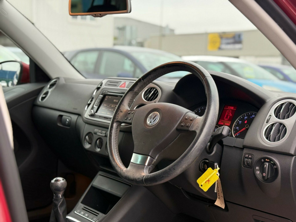 This Volkswagen Tiguan TSI SE from 2009 boasts a clean vehicle history and has been owned by only two previous keepers, offering peace of mind for its next owner. This four wheel drive model is equipped with a 1.4 litre petrol engine and features Climatic semi automatic air conditioning for comfortable journeys. While it has a partial service history, the vehicle history check is clear, confirming its sound condition.The Tiguan TSI SE offers an engaging driving experience, highlighted by its brisk 0 to 62 miles per hour acceleration in just 9.3 seconds. This performance, combined with its four wheel drive capability and the efficiency of its 1.4 litre engine, positions it as a capable and appealing choice within its class. in sahara alloy wheels with tyre flat indicator & antitheft wheel bolts, 3spoke leather steering wheel & gearknob & handbrake grip, air conditioning climatic semi automatic control, multifunction computer- highline, multifunction computer- midline, rcd 510 touch screen radio & dash mounted 6cd & mp3 auto- changer 8 speakers & aux-in socket- front centre console