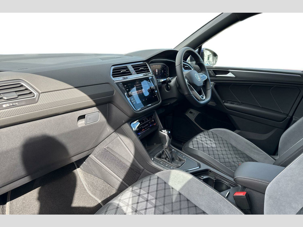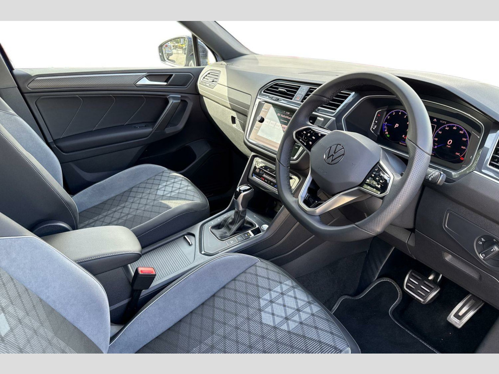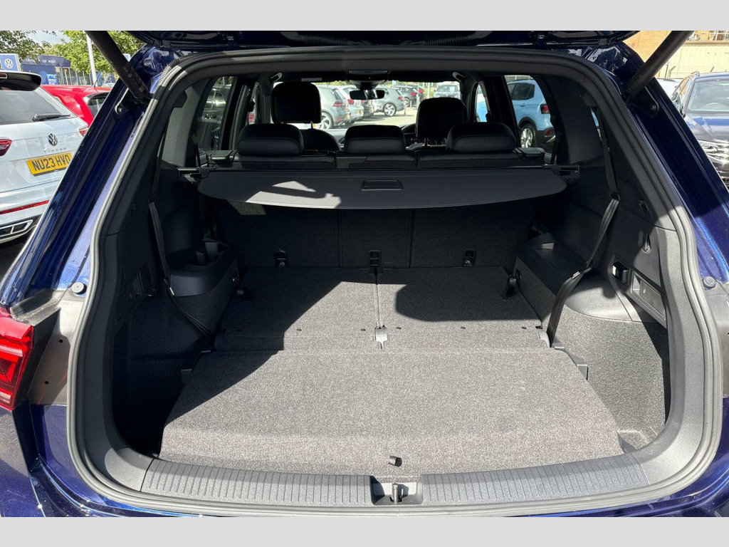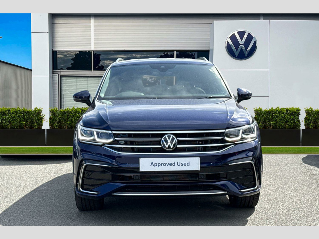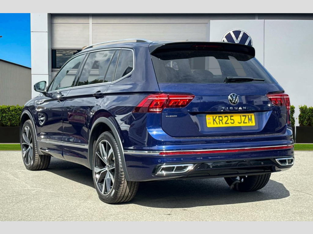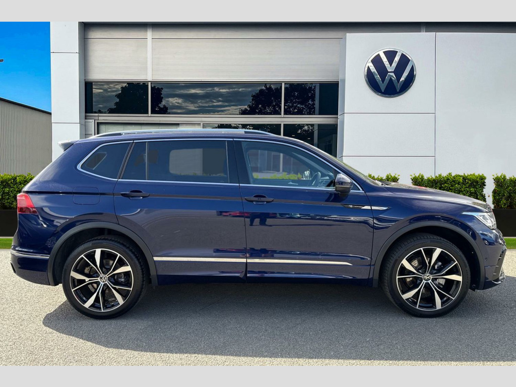 Rain sensor, Rear wiper, Front wheel drive, Chrome mouldings on side window, Exterior badge deletion, Rear side wing doors, Rear spoiler in R style, Silver roof rails, Automatic headlight control system, Coming/leaving home lighting function, Rear fog light, Third brake light, ABS+EBD+Brake assist, Electronic parking brake, Electronic Stability Control (ESC) inc EDL (Electronic Differential Lock) and ASR (Traction Control), Rear disc brakes, Adaptive cruise control, Advanced driver attention and drowsiness monitor, Driver profile selection, Lane change assist, Lane keeping system Lane Assist, Multifunction front facing camera, Progressive steering, Auto dimming interior rear view mirror, 3 point seat belt for centre rear seat, 3 rear three point seatbelts, Driver and front passenger safety-optimised head restraints, Driver's and front passenger's airbag with front passenger's airbag deactivation switch, Height adjustable front 3 point seatbelts + pretensioners, Manual rear child locks, Pedestrian monitoring, Side airbag in front and rear with curtain airbag, Two tone horn, Warning buzzer for seatbelts if unfastened, Front + rear carpet mats, Air Care Climatronic 3 zone automatic climate control with enhanced air filter and controls in the rear, 12-volt outlet in centre console rear and luggage compartment, 12V socket in centre console, Black roof lining, Door and side trim panel with leatherette insert, Drawers under front seats, Front centre armrest, Illuminated scuff plates, Leather gearshift handle, Leather wrapped multi function sports steering wheel with touch control and shifting paddles, Stainless steel pedals, Front footwell illumination, LED interior light with switch off delay/dimmer and 2 front/rear LED reading lights, Sun visors with illuminated vanity mirrors, App-Connect, Mobile phone interface comfort with inductive charging feature, 2 USB-C ports in the front, 1 USB-C charging socket on the center console in the rear, DAB Digital radio, Diversity antenna for FM reception, Electric boot lid, Digital cockpit pro, eCall emergency call service, Speedo and rev counter, electronic odometer, trip, service interval display and exterior temperature gauge, Start-stop system with battery regeneration (recuperation - energy recovery during braking), Ambience pack - Tiguan Allspace R Line, Driver assistance plus package - Tiguan Allspace, Park assist pack - Tiguan Allspace, 3 head restraints in rear, 3 individual folding 2nd row seats, 3rd row 2 individual seats, Driver + front passenger lumbar support, Driver and front passenger seat height adjustment, Foldable front passenger seat backrest, ISOFIX anchorage points for mounting 2 child seats on rear seats and i-Size child seats, Top comfort sports seats in front with 'R' Logo, Anti theft alarm system with interior monitoring, backup horn and towing protection, Anti-theft wheel bolts, Remote central locking with 2 remote folding keys