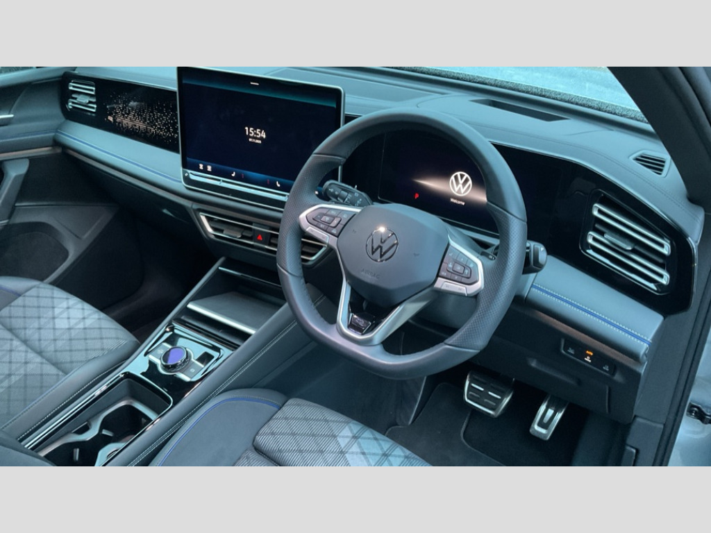 Volkswagen Tiguan 1.5 eTSI 150 R-Line 5dr DSG Adaptive cruise control (ACC), Advanced driver attention and drowsiness monitor, Bluetooth mobile phone interface, Car2X technology, Digital Cockpit Pro - 10.25" high resolution dash display screen with customisable menus and information, Dynamic road sign display, E-Sim card for online connectivity, eCall emergency call service, Front Assist - Autonomous emergency braking with pedestrian and cyclist monitoring, Lane change system, Side assist, Rear traffic alert and Exit warning system, Lane keeping system Lane Assist, Multifunction front facing camera, Oncoming vehicle braking when turning including swerve support, Park assistance plus with front and rear parking sensors, Power assisted steering with speed sensitive, Start/stop system with regenerative braking, Warning signal and warning light for front and rear seatbelts not fastened, Wireless App-Connect, Front wheel drive, Digital radio reception (DAB), Diversity antenna for FM reception, Air intake with Chrome trim, Ambient lighting with logo projection, Auto dimming interior rear view mirror, Automatic headlight control system, Body coloured door handles, Chrome moldings on the side windows, Coming/leaving home lighting function, Heat insulating glass in side and rear windows, Heated rear window, Heated windscreen washer jets, High level 3rd brake light, Illuminated door handle recesses, Illuminated lightline between headlamps, Laminated safety glass windshield, Rain sensor windscreen wipers, Rear fog light on one side, reversing light on both sides, Rear side wing doors, Rear wiper, 12V outlet in center console rear and in luggage compartment, 12V socket in centre console, 3 bench rear seats in 2nd row, Air care climatronic 3 zone air conditioning system with rear air conditioning control panel, Black roof lining, Brushed stainless steel pedals, Carpet mats, front and rear, Centre console with illuminated storage compartment with sliding cover and two drinks holders, Chrome elements on the mirror switch and power window switches and door pulls, Door and side trim panel with leatherette insert, Door sill protectors, Front centre armrest, Interior ambient lighting with 30 colour options, ISOFIX anchors for child seats on outer rear seats and front passenger seat compatible with i-Size, Mechanical rear seat release, Power adjustable lumbar support in front, Rear bench seat, split folding, longitudinally movable and folding with load-through hatch and centre armrest, Single front passenger seat, Soul headlining, Sports comfort seats in front, Sun visors with illuminated vanity mirrors, Three rear head restraints, Variable luggage compartment floor, 3 point seat belt for centre rear seats, 3 Point seat belts in front with pretensioners, 3 point seatbelts in outer rear with ECE label, Driver and front passenger airbag with front passenger airbag deactivation, Electronic parking brake with auto hold, Front and rear curtain airbags, Front and rear side airbags, Front centre airbag, Front disc brakes, Manual child proof rear door locks, Rear disc brakes, Two tone horn, Warning triangle, Anti theft wheel bolts, Decorative inserts, Interior door handle in matte chrome, Soul instrument panel