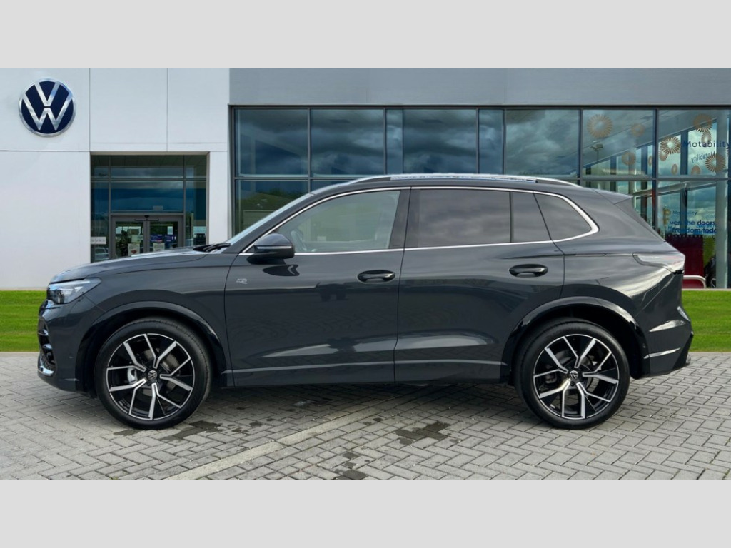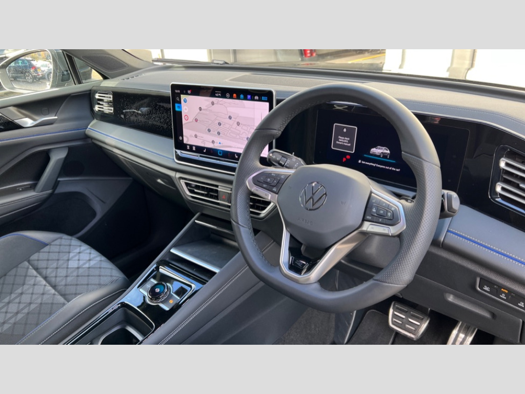 Volkswagen Tiguan 1.5 eTSI 150 R-Line 5dr DSG Adaptive cruise control (ACC), Advanced driver attention and drowsiness monitor, Bluetooth mobile phone interface, Car2X technology, Digital Cockpit Pro - 10.25" high resolution dash display screen with customisable menus and information, Dynamic road sign display, E-Sim card for online connectivity, eCall emergency call service, Front Assist - Autonomous emergency braking with pedestrian and cyclist monitoring, Lane change system, Side assist, Rear traffic alert and Exit warning system, Lane keeping system Lane Assist, Oncoming vehicle braking when turning including swerve support, Park assistance plus with front and rear parking sensors, Power assisted steering with speed sensitive, Start/stop system with regenerative braking, Warning signal and warning light for front and rear seatbelts not fastened, Wireless App-Connect, Front wheel drive, Digital radio reception (DAB), Diversity antenna for FM reception, Air intake with Chrome trim, Ambient lighting with logo projection, Auto dimming interior rear view mirror, Automatic headlight control system, Body coloured door handles, Chrome moldings on the side windows, Coming/leaving home lighting function, Heat insulating glass in side and rear windows, Heated rear window, Heated windscreen washer jets, High level 3rd brake light, Illuminated door handle recesses, Illuminated lightline between headlamps, Laminated safety glass windshield, LED Day time running light, Puddle lights and reverse activated passengers door mirror, Rain sensor windscreen wipers, Rear fog light on one side, reversing light on both sides, Rear side wing doors, Rear wiper, 12V outlet in center console rear and in luggage compartment, 12V socket in centre console, 3 bench rear seats in 2nd row, Air care climatronic 3 zone air conditioning system with rear air conditioning control panel, Black roof lining, Brushed stainless steel pedals, Carpet mats, front and rear, Centre console with illuminated storage compartment with sliding cover and two drinks holders, Chrome elements on the mirror switch and power window switches and door pulls, Door and side trim panel with leatherette insert, Door sill protectors, Front centre armrest, Interior ambient lighting with 30 colour options, ISOFIX anchors for child seats on outer rear seats and front passenger seat compatible with i-Size, Mechanical rear seat release, Power adjustable lumbar support in front, Rear bench seat, split folding, longitudinally movable and folding with load-through hatch and centre armrest, Single front passenger seat, Soul headlining, Sports comfort seats in front, Sun visors with illuminated vanity mirrors, Three rear head restraints, Variable luggage compartment floor, 3 point seat belt for centre rear seats, 3 Point seat belts in front with pretensioners, 3 point seatbelts in outer rear with ECE label, Driver and front passenger airbag with front passenger airbag deactivation, Electronic parking brake with auto hold, Front and rear curtain airbags, Front and rear side airbags, Front centre airbag, Front disc brakes, Manual child proof rear door locks, Rear disc brakes, Two tone horn, Warning triangle, Decorative inserts, Interior door handle in matte chrome, Soul instrument panel