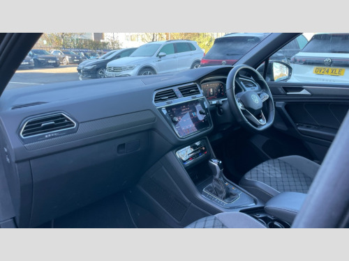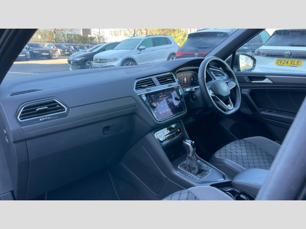 Volkswagen Tiguan 1.5 TSI 150 R-Line Edition 5dr DSG Adaptive cruise control ACC stop and go including speed limiter, App-Connect incl. App-Connect Wireless for Apple CarPlay and Android Auto, Bluetooth phone integration system, Comfort drive travel assist, Digital cockpit pro, Driver alert system, Driver profile selection, Dynamic road sign display, eCall emergency call system, Electromechanical speed sensitive power steering, Emergency assist, Front and rear parking distance sensors, Instrument cluster mph speedometer Great Britain, Lane keeping system Lane Assist, Lights on warning, Multifunction front facing camera, Outside temperature display, Premium multifunction display with multi colour display, Preparation for subsequent activation Navigation feature Discover Media includes Streaming and Internet, Remote control boot opening, Rev counter, Service interval indicator, Speed limit display, Start/stop system with regenerative braking, Tailgate/trunk lid unlocking from outside, Trip computer, Warning sound and light for doors and tailgate open, Battery regeneration during braking, Sports suspension, 8 Speakers, Digital radio reception DAB+, Diversity antenna for FM reception, Radio, Auto dimming interior rear view mirror, Automatic headlight control system, Body colored bumpers in R-Line style, Body colored exterior mirror housings, Body colour door handles, Chrome moldings on the side windows, Coming/leaving home lighting function, Dynamic headlight range control, Front and rear electric windows, Heated rear window, High level 3rd brake light, Laminated safety glass windshield, heat and sound insulating, LED headlamps with LED separate daytime running light and dynamic cornering light, LED rear combination lamps, LED rear number plate lights, License plate carrier in front and rear, Poor weather light and cornering light, Power adjustable, folding and heated door mirrors with surround lighting, front passenger exterior mirror lowering function, Privacy glass for rear side windows and rear window, R Line body kit, R Line side sills, Rain sensor, Rear exhaust tailpipe, Rear fog lamp, Rear side wing doors, Rear spoiler in R style, Rear windscreen washer and wiper with interval delay, Side and rear windows in heat insulating glass, Trailer Stability Programme, Unique R Line badging, Windscreen wipers/ intermittent wipe + 4 position delay, 12V outlet in center console rear and in luggage compartment, 12V outlet in front and tray, 2 LED front reading lights, 2 LED rear reading lights, 3 bench rear seats in 2nd row, 3 rear headrests, Air Care Climatronic 3 zone automatic climate control with enhanced air filter and controls in the rear, Art Velours greyson sports cloth upholstery, Backrest release for left front seat, Black headlining, Brushed stainless steel pedals and footrest, Carpet mats in front and rear with decorative stitching in Gray, Climate control unit rear with touch function, Door and side trim panel in foam film, insert in leatherette, Driver + front passenger lumbar support, Front footwell illumination, Front scuff plates in aluminum with R-Line logo, Front seats head restraints (x-adjustment), Height adjustable front seats, Height/reach adjust steering wheel, Isofix Preparation 2 Rear child seats, Leather gear knob, Rear bench seat asymetrically split folding, longitudinally movable and folding with load-through hatch and center armrest, Remote unlocking for rear seat backrest, Single front passenger seat, Sun visors with illuminated vanity mirrors, Top front comfort seats, Winter pack - Tiguan, 3 point seat belt for centre rear seats, 3 point seat belts with seat belt pretensioners for the outer rear seats, Curtain airbags for front and rear passengers, Driver/Front Passenger airbags, Drivers knee airbag, Electronic parking brake with auto hold, Electronic Stability Control with driver steering recommendation, ABS, ASR, EDL, EDTC and trailer stabilization, Front assist with autonomous emergency braking (for Adaptive Cruise Control ACC up to 130 mph), Front disc brakes, Front passenger airbag deactivation, Front side airbags, Height adjustable front 3 point seatbelts + pretensioners, Manual child proof rear door locks, Pedestrian monitoring system, Proactive passenger protection system in combination with front assist, Rear disc brakes, Two tone horn, Tyre pressure loss indicator, Warning sound and light for front seat belts if unfastened, Warning triangle, Anti theft alarm system with interior monitoring, backup horn and towing protection, Anti theft wheel bolts, Electronic engine immobiliser, Keyless locking and starting system keyless access with safelock, Chrome elements on the mirror switch power window switches and door pulls, Decorative inserts Carbon Gray for dashboard and front door trim panels, Interior door handle in matte chrome, 19" Valencia alloy wheels with AirStop tyres, Tool kit, Tyre mobility kit Includes 12V compressor and tyre sealant