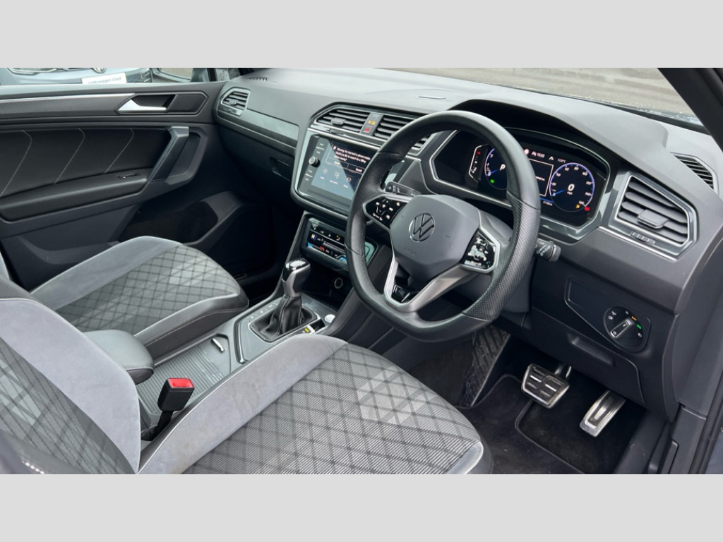 Volkswagen Tiguan 1.5 TSI 150 R-Line Edition 5dr DSG Adaptive cruise control ACC stop and go including speed limiter, App-Connect incl. App-Connect Wireless for Apple CarPlay and Android Auto, Bluetooth phone integration system, Comfort drive travel assist, Digital cockpit pro, Driver alert system, Driver profile selection, Dynamic road sign display, eCall emergency call system, Electromechanical speed sensitive power steering, Emergency assist, Front and rear parking distance sensors, Instrument cluster mph speedometer Great Britain, Lane keeping system Lane Assist, Lights on warning, Multifunction front facing camera, Outside temperature display, Premium multifunction display with multi colour display, Rev counter, Service interval indicator, Speed limit display, Start/stop system with regenerative braking, Trip computer, Warning sound and light for doors and tailgate open, Battery regeneration during braking, Digital radio reception DAB+, Diversity antenna for FM reception, Radio, Auto dimming interior rear view mirror, Automatic headlight control system, Body colored bumpers in R-Line style, Body colored exterior mirror housings, Body colour door handles, Chrome moldings on the side windows, Coming/leaving home lighting function, Dynamic headlight range control, Front and rear electric windows, Heated rear window, High level 3rd brake light, Laminated safety glass windshield, heat and sound insulating, LED rear combination lamps, LED rear number plate lights, License plate carrier in front and rear, Poor weather light and cornering light, Privacy glass for rear side windows and rear window, R Line body kit, R Line side sills, Rain sensor, Rear exhaust tailpipe, Rear fog lamp, Rear side wing doors, Rear spoiler in R style, Rear windscreen washer and wiper with interval delay, Side and rear windows in heat insulating glass, Trailer Stability Programme, Unique R Line badging, Windscreen wipers/ intermittent wipe + 4 position delay, 12V outlet in center console rear and in luggage compartment, 12V outlet in front and tray, 2 LED front reading lights, 2 LED rear reading lights, 3 bench rear seats in 2nd row, 3 rear headrests, Air Care Climatronic 3 zone automatic climate control with enhanced air filter and controls in the rear, Backrest release for left front seat, Black headlining, Brushed stainless steel pedals and footrest, Carpet mats in front and rear with decorative stitching in Gray, Climate control unit rear with touch function, Door and side trim panel in foam film, insert in leatherette, Front footwell illumination, Front scuff plates in aluminum with R-Line logo, Front seats head restraints (x-adjustment), Height/reach adjust steering wheel, Isofix Preparation 2 Rear child seats, Leather gear knob, Rear bench seat asymetrically split folding, longitudinally movable and folding with load-through hatch and center armrest, Remote unlocking for rear seat backrest, Single front passenger seat, Sun visors with illuminated vanity mirrors, Driver assistance pack plus - Tiguan DSG, 3 point seat belt for centre rear seats, 3 point seat belts with seat belt pretensioners for the outer rear seats, Curtain airbags for front and rear passengers, Driver/Front Passenger airbags, Drivers knee airbag, Electronic parking brake with auto hold, Electronic Stability Control with driver steering recommendation, ABS, ASR, EDL, EDTC and trailer stabilization, Front assist with autonomous emergency braking (for Adaptive Cruise Control ACC up to 130 mph), Front disc brakes, Front passenger airbag deactivation, Front side airbags, Height adjustable front 3 point seatbelts + pretensioners, Manual child proof rear door locks, Pedestrian monitoring system, Proactive passenger protection system in combination with front assist, Rear disc brakes, Two tone horn, Warning sound and light for front seat belts if unfastened, Warning triangle, Anti theft alarm system with interior monitoring, backup horn and towing protection, Anti theft wheel bolts, Electronic engine immobiliser, Chrome elements on the mirror switch power window switches and door pulls, Decorative inserts Carbon Gray for dashboard and front door trim panels, Interior door handle in matte chrome, Tool kit