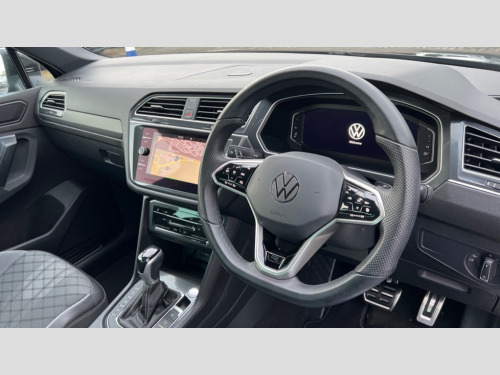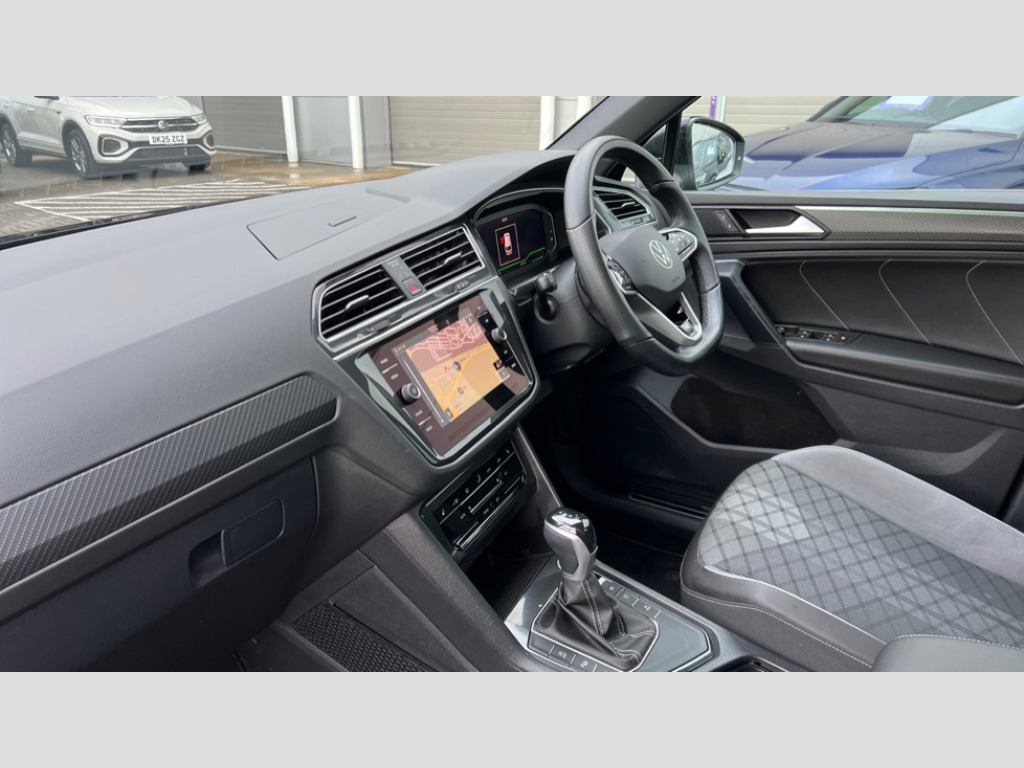 Volkswagen Tiguan 1.5 TSI 150 R-Line Edition 5dr DSG Adaptive cruise control ACC stop and go including speed limiter, App-Connect incl. App-Connect Wireless for Apple CarPlay and Android Auto, Bluetooth phone integration system, Comfort drive travel assist, Digital cockpit pro, Driver alert system, Driver profile selection, Dynamic road sign display, eCall emergency call system, Electromechanical speed sensitive power steering, Emergency assist, Front and rear parking distance sensors, Instrument cluster mph speedometer Great Britain, Lane keeping system Lane Assist, Lights on warning, Multifunction front facing camera, Outside temperature display, Premium multifunction display with multi colour display, Preparation for subsequent activation Navigation feature Discover Media includes Streaming and Internet, Remote control boot opening, Rev counter, Service interval indicator, Speed limit display, Start/stop system with regenerative braking, Tailgate/trunk lid unlocking from outside, Trip computer, Warning sound and light for doors and tailgate open, Battery regeneration during braking, Sports suspension, 8 Speakers, Digital radio reception DAB+, Diversity antenna for FM reception, Radio, Auto dimming interior rear view mirror, Automatic headlight control system, Body colored bumpers in R-Line style, Body colored exterior mirror housings, Body colour door handles, Chrome moldings on the side windows, Coming/leaving home lighting function, Dynamic headlight range control, Front and rear electric windows, Heated rear window, High level 3rd brake light, Laminated safety glass windshield, heat and sound insulating, LED headlamps with LED separate daytime running light and dynamic cornering light, LED rear combination lamps, LED rear number plate lights, License plate carrier in front and rear, Poor weather light and cornering light, Power adjustable, folding and heated door mirrors with surround lighting, front passenger exterior mirror lowering function, Privacy glass for rear side windows and rear window, R Line body kit, R Line side sills, Rain sensor, Rear exhaust tailpipe, Rear fog lamp, Rear side wing doors, Rear spoiler in R style, Rear windscreen washer and wiper with interval delay, Side and rear windows in heat insulating glass, Trailer Stability Programme, Unique R Line badging, Windscreen wipers/ intermittent wipe + 4 position delay, 12V outlet in center console rear and in luggage compartment, 12V outlet in front and tray, 2 LED front reading lights, 2 LED rear reading lights, 3 bench rear seats in 2nd row, 3 rear headrests, Air Care Climatronic 3 zone automatic climate control with enhanced air filter and controls in the rear, Art Velours greyson sports cloth upholstery, Backrest release for left front seat, Black headlining, Brushed stainless steel pedals and footrest, Carpet mats in front and rear with decorative stitching in Gray, Climate control unit rear with touch function, Door and side trim panel in foam film, insert in leatherette, Driver + front passenger lumbar support, Front footwell illumination, Front scuff plates in aluminum with R-Line logo, Front seats head restraints (x-adjustment), Height adjustable front seats, Height/reach adjust steering wheel, Isofix Preparation 2 Rear child seats, Leather gear knob, Rear bench seat asymetrically split folding, longitudinally movable and folding with load-through hatch and center armrest, Remote unlocking for rear seat backrest, Single front passenger seat, Sun visors with illuminated vanity mirrors, Top front comfort seats, Winter pack - Tiguan, 3 point seat belt for centre rear seats, 3 point seat belts with seat belt pretensioners for the outer rear seats, Curtain airbags for front and rear passengers, Driver/Front Passenger airbags, Drivers knee airbag, Electronic parking brake with auto hold, Electronic Stability Control with driver steering recommendation, ABS, ASR, EDL, EDTC and trailer stabilization, Front assist with autonomous emergency braking (for Adaptive Cruise Control ACC up to 130 mph), Front disc brakes, Front passenger airbag deactivation, Front side airbags, Height adjustable front 3 point seatbelts + pretensioners, Manual child proof rear door locks, Pedestrian monitoring system, Proactive passenger protection system in combination with front assist, Rear disc brakes, Two tone horn, Tyre pressure loss indicator, Warning sound and light for front seat belts if unfastened, Warning triangle, Anti theft alarm system with interior monitoring, backup horn and towing protection, Anti theft wheel bolts, Electronic engine immobiliser, Keyless locking and starting system keyless access with safelock, Chrome elements on the mirror switch power window switches and door pulls, Decorative inserts Carbon Gray for dashboard and front door trim panels, Interior door handle in matte chrome, 19" Valencia alloy wheels with AirStop tyres, Tool kit, Tyre mobility kit Includes 12V compressor and tyre sealant