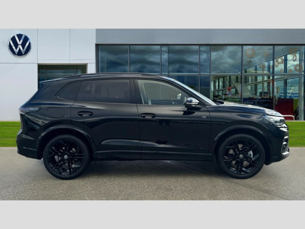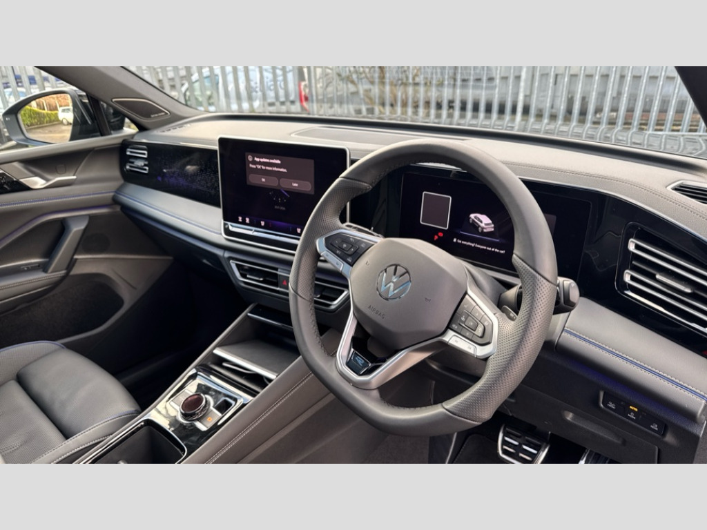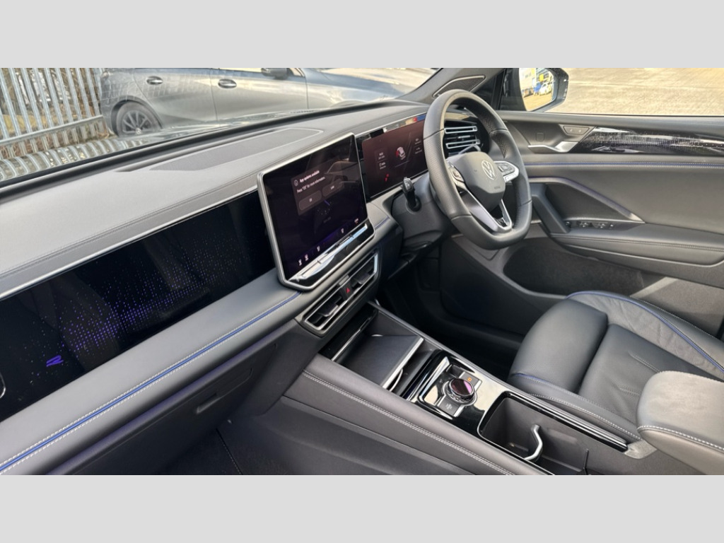 Volkswagen Tiguan 2.0 TDI R-Line 5dr DSG Adaptive cruise control (ACC), Advanced driver attention and drowsiness monitor, Bluetooth mobile phone interface, Digital Cockpit Pro - 10.25" high resolution dash display screen with customisable menus and information, Driving profile selection, Dynamic road sign display, E-Sim card for online connectivity, Easy Open and Close Electric tailgate with virtual pedal activation, eCall emergency call service, Extended safety system (proactive passenger protection system), Front Assist - Autonomous emergency braking with pedestrian and cyclist monitoring, IDA voice assistance with ChatGPT, Inductive smartphone charging without external antenna connection, Lane change system, Side assist, Rear traffic alert and Exit warning system, Multifunction front facing camera, Navigation system, Oncoming vehicle braking when turning including swerve support, Park assist plus with park distance control, Power assisted steering with speed sensitive, Start/stop system with regenerative braking, Tailgate/trunk lid unlocking from outside, Warning signal and warning light for front and rear seatbelts not fastened, Wireless App-Connect, Front shock absorption, Front wheel drive, 12.9" infotainment display, Digital radio reception (DAB), Diversity antenna for FM reception, 3D rear combination light special signal pattern, Ambient lighting with logo projection, Auto dimming interior rear view mirror, Automatic headlight control system, Body coloured door handles, Chrome moldings on the side windows, Coming/leaving home lighting function, Dynamic headlight range control with dynamic cornering light, Exterior mirrors convex on the left and aspherical on the right, Heat insulating glass in side and rear windows, Heat insulating windshield, High Beam Assist, automatic sensing for switching between dipped and main beam, High level 3rd brake light, Highway light, Illuminated door handle recesses, Illuminated lightline between headlamps, Illuminated logo front and rear, Laminated safety glass windshield, LED headlamps, LED separate signature day time running light, Poor weather light, Rain sensor windscreen wipers, Rear fog light on one side, reversing light on both sides, Rear side wing doors, Rear wiper, Remote electrically foldable door mirrors, puddle lights and reverse activated passenger's door mirror, 12V outlet in center console rear and in luggage compartment, 12V socket in centre console, 2 USB-C ports in the front, 2 USB-C charging sockets on the centre console in rear, charging capacity up to 45 W, 230V socket in luggage compartment, 3 bench rear seats in 2nd row, Air care climatronic 3 zone air conditioning system with rear air conditioning control panel, Black roof lining, Brushed stainless steel pedals, Carpet mats, front and rear, Centre console with illuminated storage compartment with sliding cover and two drinks holders, Chrome elements on the mirror switch and power window switches and door pulls, Door and side trim panel insert in Art velour, Drivers seat with manual adjustment of seat travel and height and backrest angle with thigh support longitudinally sliding, Front centre armrest, Front integrated head restraints, Front massage seats, Front scuff plates in aluminium, Front seats with manual height adjustment, Greyson sports cloth upholstery with inner side bolsters in artvelours, Interior ambient lighting with 30 colour options, ISOFIX anchors for child seats on outer rear seats and front passenger seat compatible with i-Size, Leather wrapped heated multifunction steering wheel with touch control and paddle shift, Mechanical rear seat release, Power adjustable lumbar support in front, Rear bench seat, split folding, longitudinally movable and folding with load-through hatch and centre armrest, Safety optimised front head restraints, Single front passenger seat, Sports comfort seats in front, Sun visors with illuminated vanity mirrors, Three rear head restraints, 3 point seat belt for centre rear seats, 3 Point seat belts in front with pretensioners, 3 point seatbelts in outer rear with ECE label, Driver and front passenger airbag with front passenger airbag deactivation, Electronic parking brake with auto hold, First aid kit with warning triangle and safety vest, Front and rear curtain airbags, Front centre airbag, Front disc brakes, Hill start assist, Manual child proof rear door locks, Rear disc brakes, Rear side airbags, Two tone horn, Tyre pressure monitoring system, Alarm with interior protection, Central locking system keyless entry, Interior door handle in matte chrome, Soul instrument panel