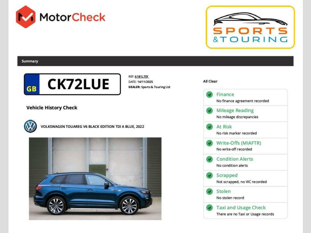 FABULOUS CONDITION | RARE & DESIRABLE ULTRAMARINE BLUE METALLIC PAINT | BLACK EDITION | NINE-WAY LEATHER SEATS | HEATED FRONT SEATS | HEATED STEERING WHEEL | TILT-AND-SLIDE PANORAMIC SUNROOF | POWER TAILGATE | 21-INCH SUZUKA DARK GRAPHITE DIAMOND-TURNED ALLOY WHEELS | BRIDGESTONE ALENZA TYRES | 360-DEGREE PARKING CAMERA | AMBIENT LIGHT PACK | 40-20-40 SPLIT FOLDING REAR SEATS | REFRIGERATED GLOVE COMPARTMENT | SEPARATE REAR SEAT CLIMATE CONTROLS | CARPLAY & ANDROID AUTO | KEYLESS ENTRY & START | ROOF SPOILER | SIDE SKIRTS | ADAPTIVE CRUISE CONTROL WITH STOP & GO | TRAFFIC SIGN RECOGNITION | We are delighted to list this practical and imposing Touareg, taken in part-exchange and much too good to pass on in the trade. This powerful SUV looks stunning in ULTRAMARINE BLUE and sitting on extra-cost 21-INCH SUZUKA DARK GRAPHITE DIAMOND-TURNED ALLOY WHEELS with BRIDGESTONE ALENZA TYRES. This Volkswagen is sumptuously equipped with HEATED FRONT SEATS, HEATED STEERING WHEEL, TILT-AND-SLIDE PANORAMIC SUNROOF, POWER TAILGATE, and more, making for a highly refined experience at the wheel. The enormous load space and comfortable cabin make it ideal for family trips or corporate travel, and the turbocharged diesel engine offers impressive performance matched by economical fuel consumption. This Touareg comes with an excellent service history, and it will be supplied with two remote key fobs and owners documentation. The registration CK72 LUE. You can chat to us live via text or WhatsApp on 07831 445521. Were open seven days a week, from 8am until 8pm, by appointment. Please read our reviews. Contact us for access to the Google drive for any of our cars, with high-resolution photos, service history, and full build specification, or request a video viewing. All our cars are supplied with a comprehensive MotorCheck report and pre-delivery inspection. We provide a three-month, 3,000 mile warranty free of charge and twelve and twenty-four-month options are also available. Please ask us about trading-in; we will give you sound advice.
