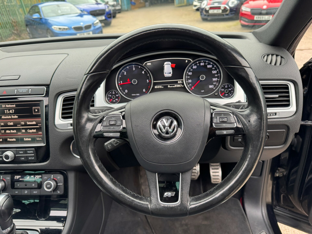 This 2016 Volkswagen Touareg 3.0 TDI V6 BlueMotion Tech R-Line Plus SUV boasts a powerful 262 ps Diesel engine and has covered 85016 miles, with an MOT valid until 03/01/2027. With 5 seats and 5 doors, this SUV is ULEZ compliant and perfect for both city and off-road driving. Its 21in Alloy Wheels - Mallory add to its robust and stylish exterior, while the interior features 12V Socket x4, Bluetooth Telephone Preparation, MDI Multi Device Interface, and RNS 850 Touch Screen Satellite Navigation Radio System with Integrated Voice Control for comfort and convenience. Whether you're navigating the city streets or conquering the great outdoors, this Volkswagen Touareg offers both power and practicality for all your driving needs.UK delivery available.Part exchange welcome.Extended warranty options.AA standards approved dealership.Trading standards approved dealership.Autotrader highly rated dealership. v socket x4, bluetooth telephone preparation for hands free profile enabled telephones, mdi - multi device interface, rns 850 touch screen satellite navigation radio system with integrated voice control, 21in alloy wheels - mallory, body coloured door handles, body-coloured door mirrors with integrated indicators, chrome exterior door trims, chrome trimmed upper and lower grille louvres, electric windows - front and rear, electrically heated - adjustable and foldable door mirrors with auto dimming with puddle lighting, gloss black b pillar, heated windscreen washer jets, panoramic sunroof, r-line body styling kit, rear diffuser - black with chrome angular exhaust tailpipes left and right, rear roof spoiler, roof rails - matt chrome finish, side window surrounds - chrome, steel space saver spare wheel, tinted glass - heat insulating rear 65 percent light absorbing from b pillar backwards, tinted rear light clusters and indicators, unique door sill protectors with r-line logo, unique r-line badging on front grille, abs plus - anti-lock braking system with ebd - electronic brake-pressure distribution and hba-hydraulic brake assist, airbags, alarm with interior protection, automatic post-collision braking system, central locking with remote control, child security locks in the rear doors electric, esc - electronic stability control including edl - electronic differential lock - asr - traction control and trailer stabilisation function, electronic engine immobiliser, electronic parking brake with auto hold function, first aid kit and warning triangle, height-adjustable front three-point seat belts with tensioners, hill descent assist, hill start assist, isofix child seat preparation - outer rear, keyless entry, led rear number plate lights, rollover protection system, three rear 3-point seat belts, warning buzzer and light for front seat belts if unfastened, air vent surrounds - matt chrome, aluminium look pedals, automatic dimming rear view mirror, automatic electric opening and closing of rear tailgate, bag hooks in the luggage compartment, black rooflining, climate control, coat hook on b pillar, cup holders - front x2 in centre console, drivers and front passengers double sun visors with vanity mirrors, drivers and passengers safety optimised head restraints, front centre armrest - two piece with storage compartment, galvanised body, gloss black surrounds in dash and centre console, glovebox - cooled - illuminated - lockable, height and reach adjustable steering column, interior trim - piano black, led rear fog light, leather trimmed gear knob, load lashing points x4 in luggage compartment, luggage compartment cover with convenience opening, luggage compartment lights x 2, lumbar support for drivers and front passenger seat, modular rear seat system with sliding and reclining function, multifunction heated r-line steering wheel with paddle shift - leather trimmed with controls for multifunction computer and stereo options, one-touch indicators with 3 repeat function, rain sensor, rear centre armrest - folding with cup holders x2, remote unlocking for tailgate on drivers side, seats - heated front, silver lane decorative inserts in dash - centre console and doors, storage compartment in dashboard centre with cover, storage compartment in drivers door for 1.5 litre bottle, storage compartment in passengers door for 1.0 litre bottle, textile carpet mats - front and rear, three rear head restraints, white interior lighting, area view, coasting function, cruise control, driver alert system, limited slip torsen differential and electronic differential lock on all four wheels, lowered sports suspension, multifunction computer with 7in colour screen in instrument cluster, parking sensors - ultrasonic front and rear with optical and audible, power assisted steering - speed sensitive, tyre pressure monitoring system, automatic coming-leaving home lighting function, automatic headlight height adjustment, bi-xenon 35w dipped and main beam headlights, dusk sensor, front fog lights with static cornering function, headlight washer system