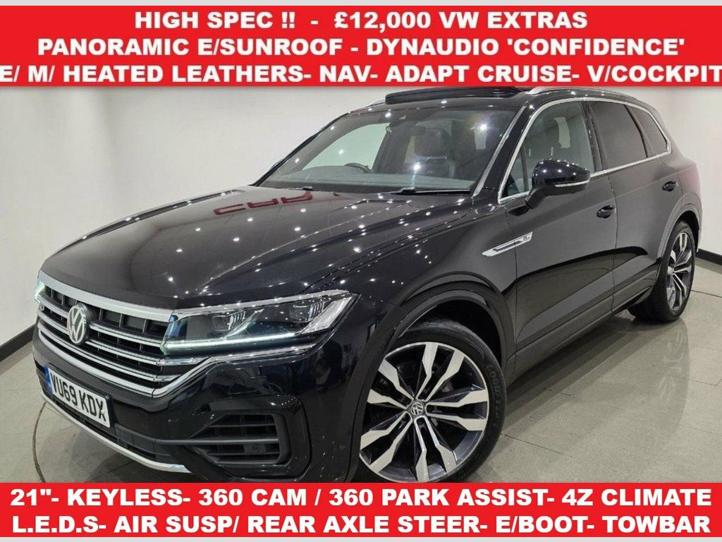 HIGH SPEC WITH £12,000 VW EXTRAS + 1 PREVIOUS KEEPER + MOT EXPIRY NOV 2026 + VW AND SPECIALIST SERVICE HISTORY, 5 SERVICES PERFORMED, LAST SERVICED AT 82,861 MILES ON 22-09-2025 + E/SLIDING PANORAMIC SUNROOF + DEEP BLACK PEARL EFFECT PAINTWORK + SAVONA LEATHER UPHOLSTERY + 14 WAY ELECTRIC-MEMORY-HEATED R-LINE ERGO COMFORT FRONT SPORT SEATS + EASY EXIT SEAT MEMORY + KEYLESS- COMFORT ACCESS + PIANO BLACK AND SILVER WAVE DESIGN ALUMINIUM DECOR INLAYS + AIR SUSPENSION AND REAR AXLE STEERING + HEAT INSULATING PRIVACY GLASS AND HEATED WINDSCREEN - LAMINATED ACOUSTIC + 4 ZONE CLIMATE CONTROL + AMBIENT LIGHTING + AUTO L.E.D. HEADLIGHTS WITH JET WASH + DYNAMIC INDICATORS + HIGH BEAM ASSIST + INNOVATION VIRTUAL COCKPIT + 360 AREA VIEW CAMERA / FRONT / REAR / SIDE CAMERAS + 360 PARK ASSIST AND AUTO PARALLEL PARK ASSIST + DRIVER ALERT SYSTEMS- LANE ASSIST/ LANE KEEPING/ LANE CHANGE/ BLIND SPOT + TRAFIC SIGN RECOGNITION + 4MOTION ACTIVE CONTROL + ELECTRONIC DIFFERENTIAL CONTROL + DRIVING PROFILE SELECTION + R-LINE BODY STYLING + 21 INCH ALLOYS + SPORTS SUSPENSION + POWER FOLD-HEATED E-MIRRORS + E/CHILD LOCKS + AUTO HOLD BRAKES + HILL DESCENT CONTROL + HILL ASSIST + ADAPTIVE CRUISE CONTROL + FRONT ASSIST + SIDE ASSIST + SPEED LIMITER + AUTO BRAKING + DYNAUDIO 'CONFIDENCE' HIGH END AUDIO SYSTEM + 4X USB + NAVIGATION + VOICE CONTROL + BLUETOOTH + SMARTPHONE WIRELESS CHARGING + R-LINE FLAT BOTTOM MULTIFUNCTIONAL LEATHER STEERING WHEEL WITH PADDLESHIFT + TYRE PM + E/TAILGATE + Reversible Boot Floor with Luggage Manag, Cargo Management System, Ambient Light Pack - Coloured, Net Partition and Luggage Compartment Ma, Heated Front and Rear Seats, Memory Pack Plus, Garage Door Opener, Towbar - Power Folding with Trailer Assi, Roof Rails and Cross Bars - Silver Anodi, Laminated Safety Privacy Glass, Heated Windscreen - Laminated - Acoustic, Panoramic Sunroof, Off Road Pack, 21in Alloy Wheels - Suzuka Dark Graphite, Driver Assistance Pack Plus, Keyless Entry - with Hands Free Tailgate, IQ Light - LED Premium Matrix Beam Headl, Park Assist with Area View Camera, Air Suspension, Air Suspension and Rear Axle Steering, Dynaudio Confidence High End Audio Syste, Side Scan, Tyr