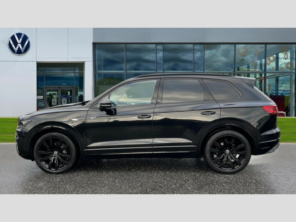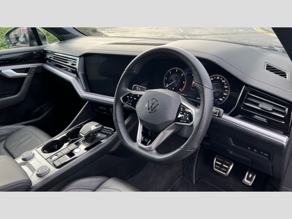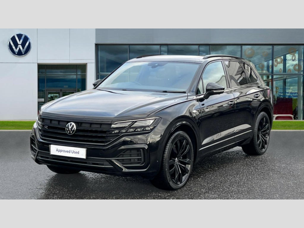 Volkswagen Touareg 3.0 V6 TDI 4Motion Black Edition 5dr Tip Auto 2D/3D map view, ACC - Adaptive cruise control with front assist, forward collision warning, distance monitoring, city emergency brake and speed limiter, Apple car play/Android Auto, Audible and visual fatigue detection system, Bluetooth hands free telephone connection, Car information display, Drive select with Damper control, Driver alert system, Driver profile selection, Dynamic road sign display camera controlled system with visual warning for traffic and road signs, eCall emergency system, Fully electric tailgate + keyless entry and start, Instrument cluster, MirrorLink, Multifunction camera, Multifunction computer premium with 7" colour display, One touch indicators with repeat function, Service interval indicator, Speed sensitive power steering, Start/stop system with regenerative braking, Tailgate power latch, Think blue trainer driver tips and journey analysis, Traffic sign recognition, Voice control system, Wireless Smartphone charger, 24 litre AdBlue tank, Torsen limited slip differential, DAB Digital radio, Dynamic navigation based on TMC+, Gesture control for infotainment system, Multi device interface (MDI) with illuminated USB-C connection, Music playback - MP3, WMA and AAC files, SD card slot, Simultaneous pairing of 2 compatible mobile devices, SMS functionality - read, compose and send SMS messages using touch-screen display, Title and cover art display, Volkswagen media control, Adaptive low beam for urban and motorway use, Auto dimming rear view mirror, Automatic coming/leaving home lighting function, Automatic headlights, Black anodised roof rails, Black door mirrors, Black rear diffuser, Black side window surrounds, Black upper and lower grille louvres extending into headlights and radiator grille, Body colour door handles, Body coloured wheel arches, C signature gloss black front air intake, Chromed tailpipe on the left and right integrated in the bumper with trapezoid design, Dusk sensor, Dynamic headlight range control, Electric front tilt/slide panoramic sunroof and fixed rear sunroof, Electrically power adjustable, heated, folding, auto dimming, front passenger exterior door mirror lowering function, Front and rear electric windows, Galvanised body, Gloss black finish B pillar, Gloss black rear diffuser, Headlight washers, Heat insulating darkened glass in side and rear windows, Heated windscreen washer jets, IQ.Light-LED matrix headlight,daytime running light with dynamic cornering light and indicator, LED 3rd brake light, LED rear fog light, LED rear number plate lights, Plastic scuff plates in door apertures, Poor weather light, Puddle lights, Rain sensor, Rear side wing doors, Rear wiper, 12V socket in front and rear centre console and boot, 2 Coat hooks on B pillar, 3 rear head restraints, 3 seat bench in 2nd row, 3 spoke sport heated leather multi-function sports steering wheel with gear shift paddles - generation 2, 4 way adjustable front head restraints, 4 way electric lumbar support for driver and front passenger, 4 zone climate control, 40:20:40 split folding slide/recline rear seat, B pillar vents, Black lower edge of door extending sills, Branded points of interest, Double sun visor for drivier and passenger with LED illuminated vanity mirrors, Electric luggage compartment cover, Folding rear centre armrest with 2 cupholders, Front + rear carpet mats, Front centre armrest with storage box, Gear shift indicator, Height/reach adjust steering wheel, Illuminated air conditioned glovebox, Isofix preparation for 2 rear child seats, Jack and tool kit, Leather trimmed gear knob with gloss black inlay/aluminum trim, Leatherette door trim, LED luggage compartment lighting, Load through provision, Luggage compartment with load lashing rings, Plastic loading edge protection, Rear seat remote release levers, Single front passenger seat, Soul black headlining, Stainless steel pedals, Innovision cockpit pack - Touareg, 3 point front seatbelts with pre-tensioners, ABS, Active bonnet, Automatic post collision braking system, Curtain airbags, Driver/Front Passenger airbags, EBD + Brake Assist, EDL, Electronic parking brake with auto hold, ESC with ASR, Front seat side impact airbags, Hill descent control, Hill start assist, Passenger airbag deactivate switch, Seatbelt warning lamp and buzzer, Three 3 point rear seatbelts, Two tone horn, Volkswagen roadside assistance, Warning triangle and first aid kit, Alarm with interior monitoring in cab, backup horn and towing protection, Child security locks for front and rear doors, Electronic engine immobiliser, Remote central locking, Black decorative trims on the side windows, High gloss black centre console