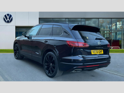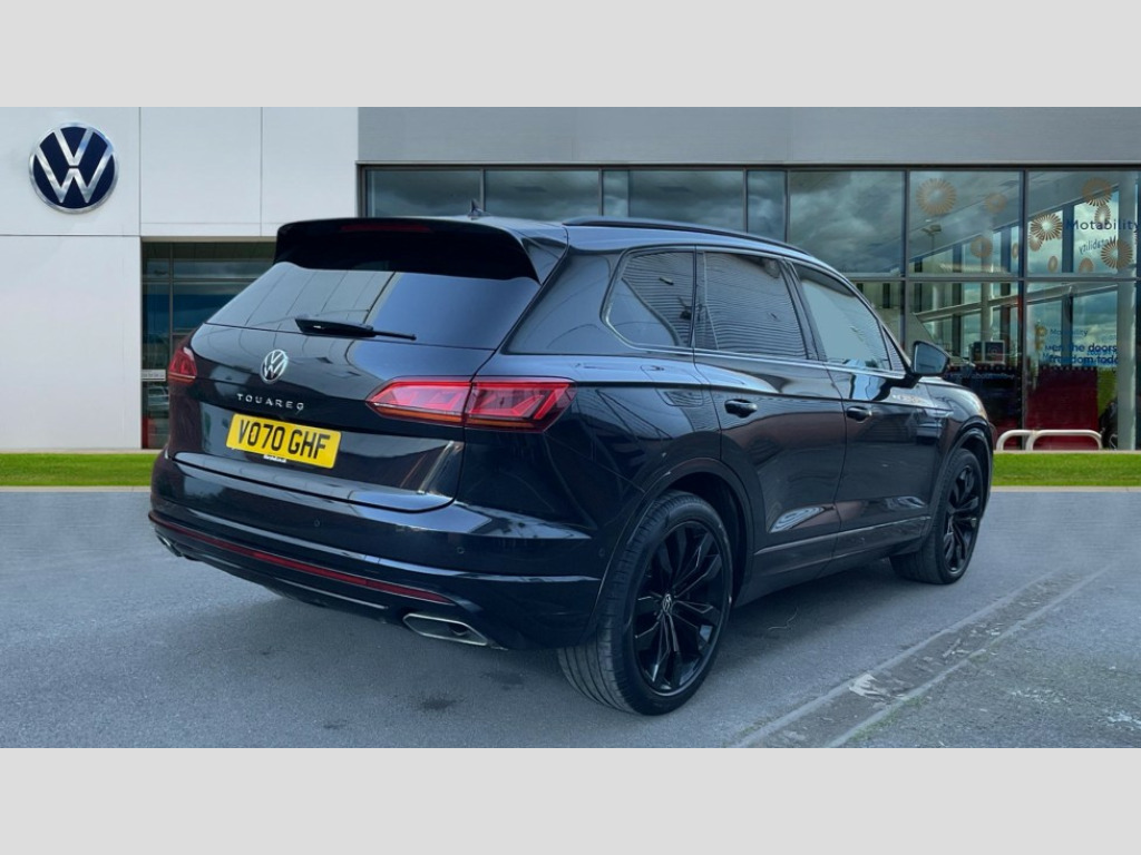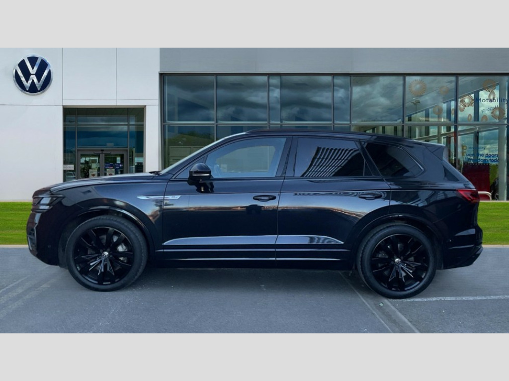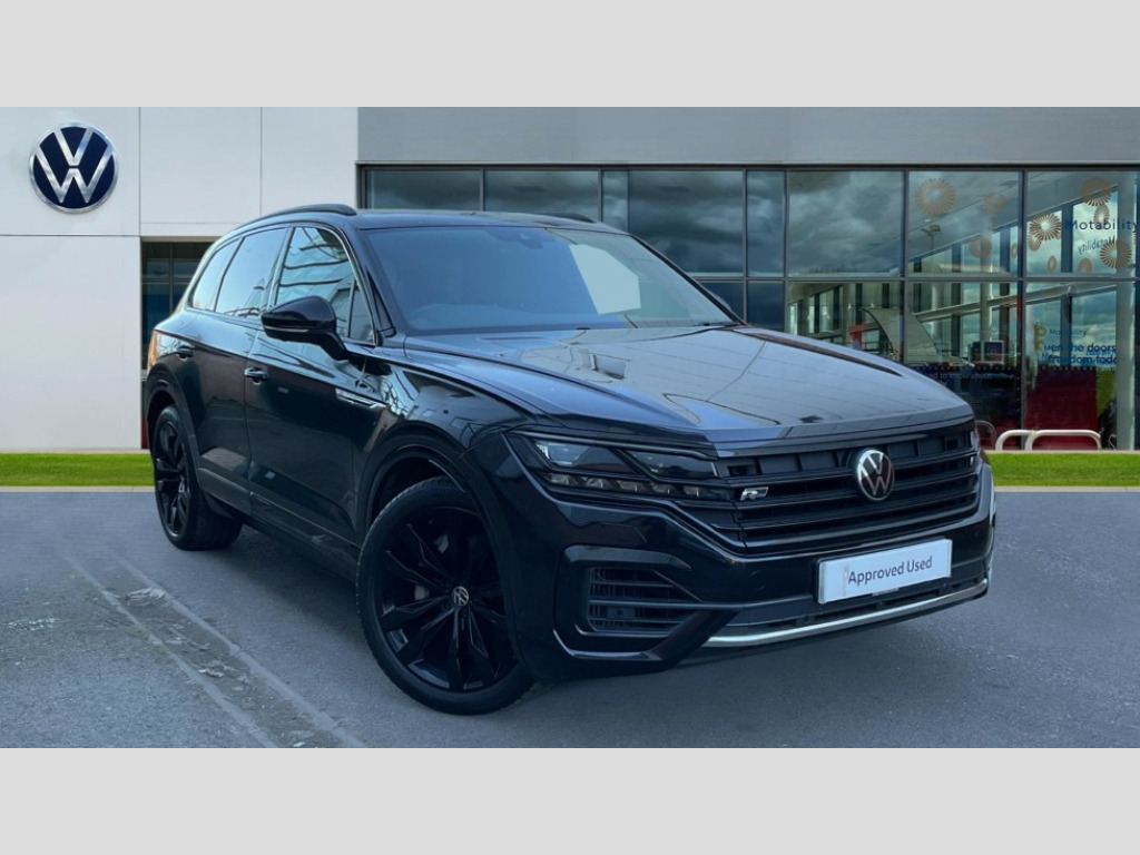 Volkswagen Touareg 3.0 V6 TSI 4Motion Black Edition 5dr Tip Auto 2D/3D map view, ACC - Adaptive cruise control with front assist, forward collision warning, distance monitoring, city emergency brake and speed limiter, Apple car play/Android Auto, Audible and visual fatigue detection system, Bluetooth hands free telephone connection, Car information display, Drive select with Damper control, Driver alert system, Dynamic road sign display camera controlled system with visual warning for traffic and road signs, eCall emergency system, Fully electric tailgate + keyless entry and start, Instrument cluster, MirrorLink, Multifunction camera with lane assist, Multifunction computer premium with 7" colour display, One touch indicators with repeat function, Park assist with area view camera, Service interval indicator, Speed sensitive power steering, Start/stop system with regenerative braking, Tailgate power latch, Think blue trainer driver tips and journey analysis, Traffic sign recognition, Voice control system, Wireless Smartphone charger, Torsen limited slip differential, DAB Digital radio, Dynamic navigation based on TMC+, Gesture control for infotainment system, Multi device interface (MDI) with illuminated USB-C connection, Music playback - MP3, WMA and AAC files, SD card slot, Simultaneous pairing of 2 compatible mobile devices, SMS functionality - read, compose and send SMS messages using touch-screen display, Title and cover art display, Volkswagen media control, Adaptive low beam for urban and motorway use, Auto dimming rear view mirror, Automatic coming/leaving home lighting function, Automatic headlights, Black anodised roof rails, Black door mirrors, Black rear diffuser, Black side window surrounds, Black upper and lower grille louvres extending into headlights and radiator grille, Body colour door handles, Body coloured wheel arches, C signature gloss black front air intake, Chromed tailpipe on the left and right integrated in the bumper with trapezoid design, Dusk sensor, Dynamic headlight range control, Electric front tilt/slide panoramic sunroof and fixed rear sunroof, Electrically power adjustable, heated, folding, auto dimming, front passenger exterior door mirror lowering function, Front and rear electric windows, Galvanised body, Gloss black finish B pillar, Gloss black rear diffuser, Headlight washers, Heat insulating darkened glass in side and rear windows, Heated windscreen washer jets, IQ.Light-LED matrix headlight,daytime running light with dynamic cornering light and indicator, LED rear fog light, LED rear number plate lights, Plastic scuff plates in door apertures, Poor weather light, Puddle lights, Rain sensor, Rear wiper, 12V socket in front and rear centre console and boot, 2 Coat hooks on B pillar, 3 rear head restraints, 3 spoke sport heated leather multi-function sports steering wheel with gear shift paddles - generation 2, 4 way adjustable front head restraints, 4 way electric lumbar support for driver and front passenger, 4 zone climate control, 40:20:40 split folding slide/recline rear seat, B pillar vents, Black lower edge of door extending sills, Branded points of interest, Double sun visor for drivier and passenger with LED illuminated vanity mirrors, Electric luggage compartment cover, Folding rear centre armrest with 2 cupholders, Front + rear carpet mats, Front centre armrest with storage box, Gear shift indicator, Height/reach adjust steering wheel, Illuminated air conditioned glovebox, Isofix preparation for 2 rear child seats, Jack and tool kit, Leather trimmed gear knob with gloss black inlay/aluminum trim, Leatherette door trim, LED luggage compartment lighting, Load through provision, Luggage compartment with load lashing rings, Plastic loading edge protection, Rear seat remote release levers, Soul black headlining, Stainless steel pedals, Innovision cockpit pack - Touareg, R line styling pack - Touareg, 3 point front seatbelts with pre-tensioners, ABS, Active bonnet, Automatic post collision braking system, Curtain airbags, Driver/Front Passenger airbags, EBD + Brake Assist, EDL, Electronic parking brake with auto hold, ESC with ASR, Front seat side impact airbags, Hill descent control, Hill start assist, Passenger airbag deactivate switch, Seatbelt warning lamp and buzzer, Three 3 point rear seatbelts, Two tone horn, Volkswagen roadside assistance, Warning triangle and first aid kit, Alarm with interior monitoring in cab, backup horn and towing protection, Child security locks for front and rear doors, Electronic engine immobiliser, Remote central locking, Black decorative trims on the side windows, High gloss black centre console, Tyre repair kit