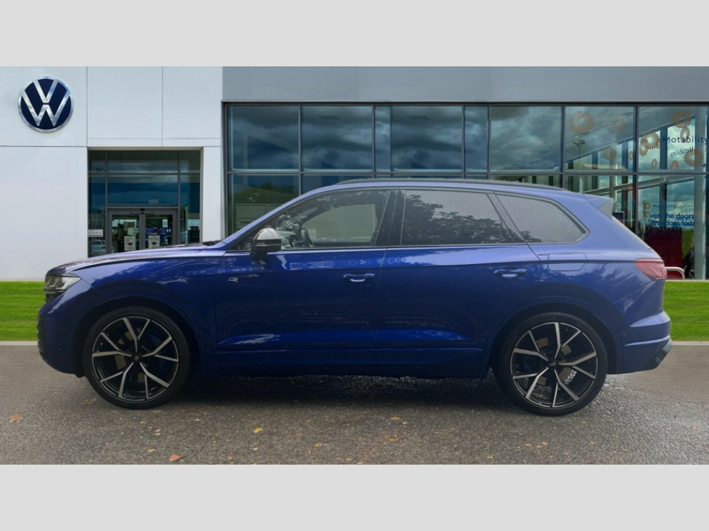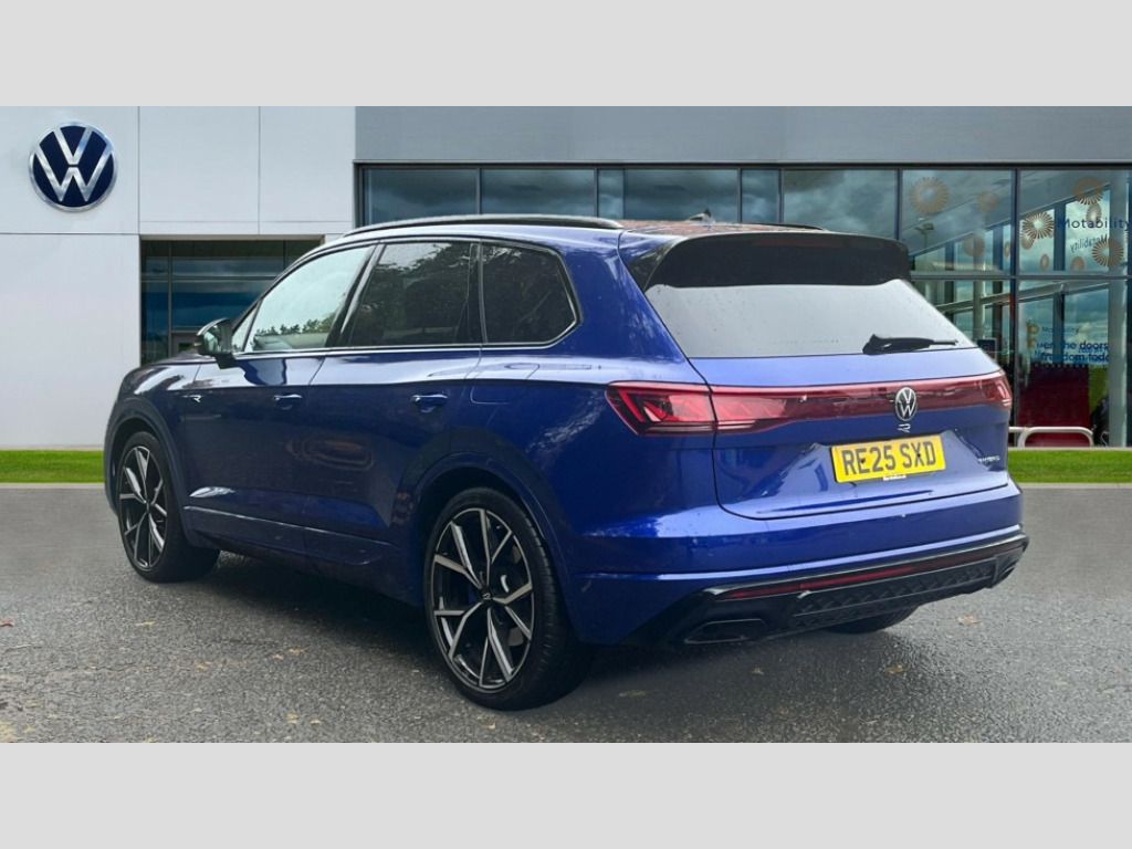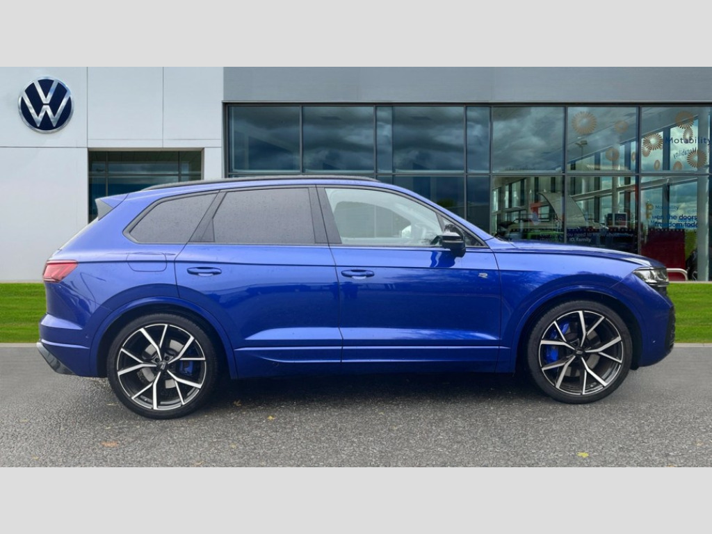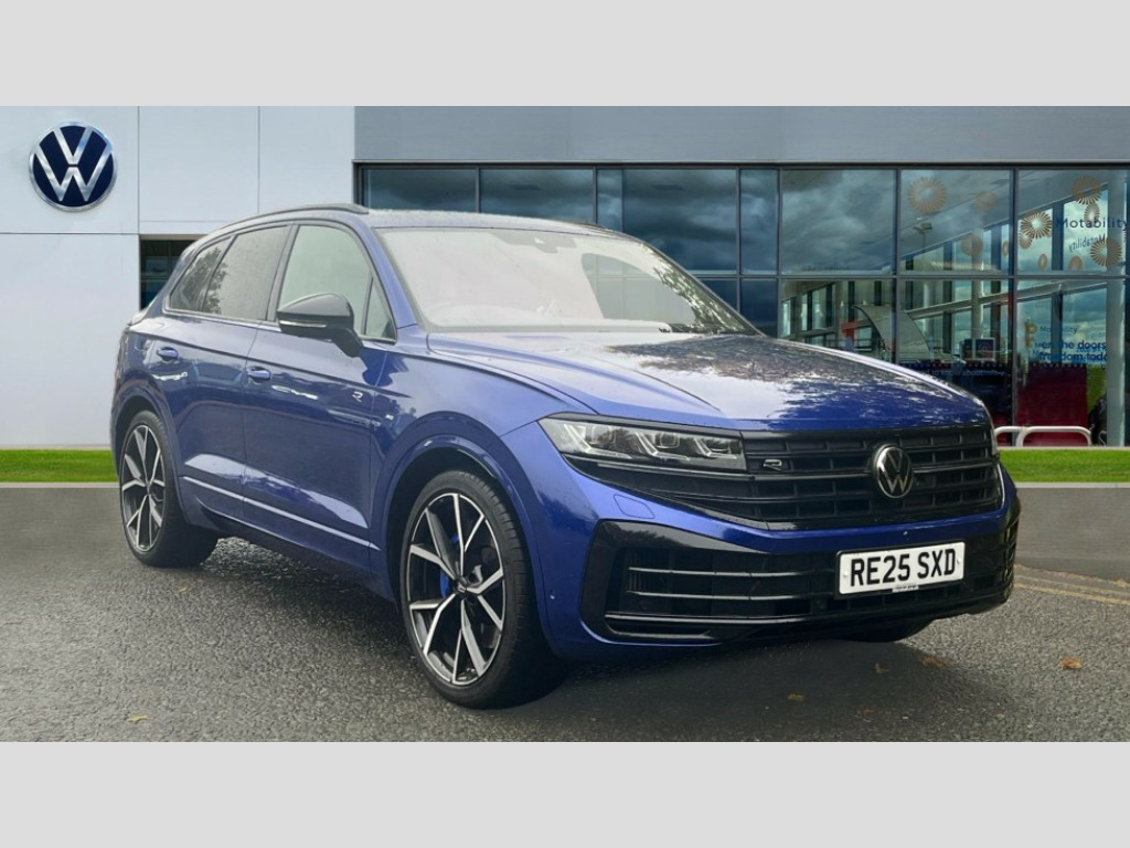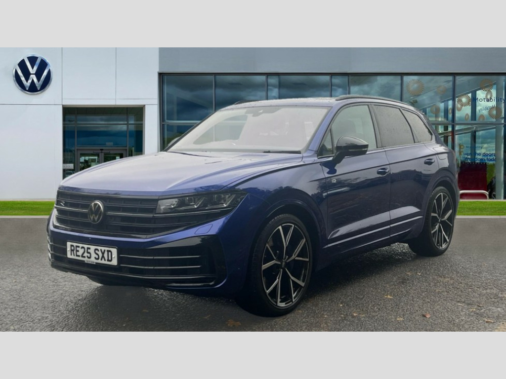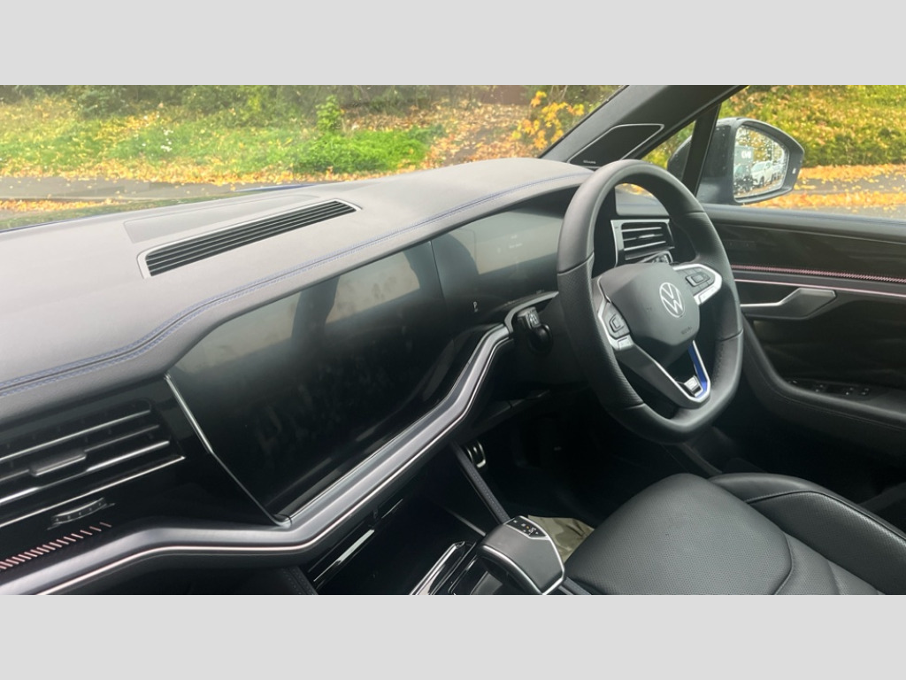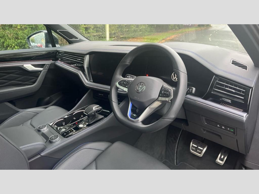 Volkswagen Touareg 3.0 V6 TSI eHybrid 4Motion R 5dr Tip Auto 15" Screen Top infotainment system Premium (MIB3), Adaptive cruise control, Advanced driver attention and drowsiness monitor, Driver profile selection, Dynamic road sign display, E-Sim card for online connectivity, eCall emergency system, Innovision cockpit, Intelligent park assist, Mobile phone interface with inductive charging, Multi-colour Active Info display, Park Assist - Sensor controlled steering aid to assist parallel or bay parking, PAS, Warning signal and warning light for front and rear seatbelts not fastened, Wireless app connect, Adaptive chassis control, Air suspension, Charging cable - Mode 2 / 10-amp / 2.3 kW, Charging cable - Mode 3 / 32-amp / 7.2 kW, Standard electronic engine sound actuator, DAB Digital radio, Diversity antenna for AM/ FM reception, We Connect and We Connect Plus functionality, Automatic coming/leaving home lighting function, Automatic headlights, Black door mirrors, Black style comfort bumpers, Dynamic headlight range control with dynamic cornering light, Electric front tilt/slide panoramic sunroof and fixed rear sunroof, Electrically power adjustable, heated, folding, auto dimming, front passenger exterior door mirror lowering function, External USB type C socket and charging sockets, Gloss black roof rails, HD LED Matrix beam plus digital headlight projection with variable light distribution, Headlight washers, Highway light, LED 3rd brake light, LED daytime running lights, LED rear combination lamp with variable lighting functions and special styling, Poor weather light, Rain sensor, Rear exhaust tailpipe, Rear fog light with back up light on both sides, Rear light bar and illuminated logo, Rear side wing doors, Rear wiper, Stainless steel door sill protection, 12V socket in centre console, 3 rear headrests, 3 seat bench in 2nd row, 30 colours options interior ambient lighting, 4 zone climate control, Additional Interior Lighting, Airbag label on sun visor and B-pillar, Brushed stainless steel pedals, Door and side trim panel with Leather quilting, Double sun visors with illuminated vanity mirrors, Front + rear carpet mats, Front centre armrest, Illuminated scuff plates in door apertures, Leather wrapped multifunction sports steering wheel, heated, with touch control and shift paddles, Mechanical rear seat release, Power adjustable lumbar support in front, Power seats in front, right side with memory features and seat cushion depth adjustment, Puglia leather upholstery with "R" ergoComfort, Rear seat backrest and split folding with center armrest, Single front passenger seat, Memory pack plus - Touareg, 3 point seatbelts, outer rear with ECE lable, ABS, Child locks on rear doors, Curtain airbags, Disc brakes in front blue with R-Logo, Disc brakes in rear blue, Driver and front passenger safety-optimised head restraints, Driver/Front Passenger airbags, Extended pedestrian protection measures, Front assist, Front seat side impact airbags, Generative braking with start and stop system, Height adjustable 3 point front seatbelts with pre tensioners, Passenger airbag deactivate switch, Three 3 point rear seatbelts, Two tone horn, Tyre pressure loss indicator, Warning triangle and first aid kit, Alarm system with interior protection, Easy open and close sensor controlled luggage compartment opening and closing with remote unlocking, Keyless Access Keyless locking and starting system with SAFELOCK, Aluminium decorative inserts, Black decorative trims, Gloss black decorative inserts in centre console, 285/35 R22 106Y XL Low rolling resistance tyres, Tool kit, Tyre mobility kit including compressor and sealing foam