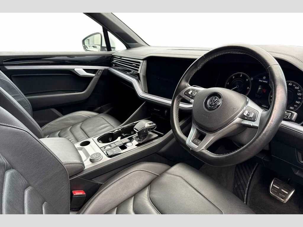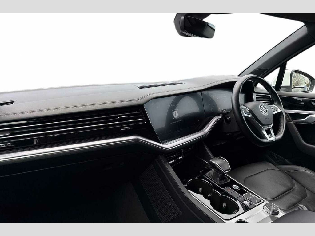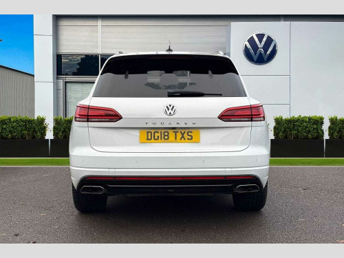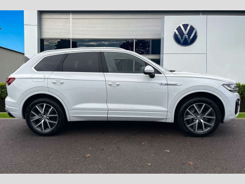 Innovision Cockpit with Volkswagen Digital Cockpit, Vienna Ergo Comfort Leather - Soul, R-Line vienna leather upholstery + 14 way electric front ergoComfort seats, Innovision cockpit pack with Digital cockpit - Touareg, Solid - Pure white, R-Line vienna leather - Soul/Crystal grey + 14 way electric front ergoComfort seats, Front and rear electric windows, Heated windscreen washer jets, Black rear diffuser, Body colour bumpers, Body colour door handles, Body colour door sills, Body coloured side skirts, Chrome exhaust tailpipes, Chrome protective strip on door sill, Chrome trimmed radiator grille and air intake, Chrome trimmed side windows, Automatic coming/leaving home lighting function, Automatic headlights, LED cornering headlights, LED daytime running lights, LED Indicators, Puddle lights, ABS, Automatic post collision braking system, EBD + Brake Assist, EDL, Electronic parking brake with auto hold, ESC with ASR, Hill descent control, ACC - Adaptive cruise control with front assist, forward collision warning, distance monitoring, city emergency brake and speed limiter, Drive select with Damper control, Driver alert system, Multifunction camera with lane assist, Speed sensitive power steering, Traffic sign recognition, Auto dimming rear view mirror, Body colour door mirrors with integral indicators, 3 point front seatbelts with pre-tensioners, Curtain airbags, Driver/Front Passenger airbags, Driver/Passenger whiplash optimised head restraints, Front seat side impact airbags, Passenger airbag deactivate switch, Seatbelt warning lamp and buzzer, Three 3 point rear seatbelts, Warning triangle and first aid kit, Front + rear carpet mats, 4 zone climate control, 12V Accessory socket in centre console, 4 load lashing points, Electric luggage compartment cover, Folding rear centre armrest with 2 cupholders, Front centre armrest with storage box, Gear shift indicator, Height/reach adjust steering wheel, Jack and tool kit, Leather heated multifunction steering wheel with paddle shift, Leatherette door trim, Load through provision, Soul black headlining, Stainless steel load sill protection, Stainless steel pedals, Torsen limited slip differential, Sunvisors with illuminated vanity mirrors, Apple car play/Android Auto, Bluetooth hands free telephone connection, MirrorLink, Wireless Smartphone charger, 2x SD card slot, DAB Digital radio, Gesture control for infotainment system, Tailgate power latch, Multifunction computer, Service interval indicator, Aluminium dash and door panel inserts, High gloss black centre console, 3 rear head restraints, 60/40 split folding slide/recline rear seat, Driver/front passenger seat height adjustment, Front seats lumbar support, Isofix preparation for 2 rear child seats, Alarm with interior monitoring in cab, backup horn and towing protection, Anti-theft wheel bolts, Remote central locking, Temporary space saver steel spare wheel