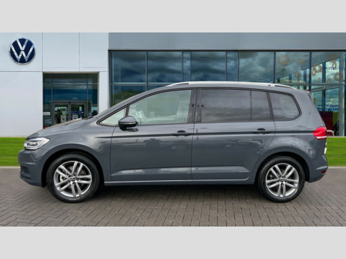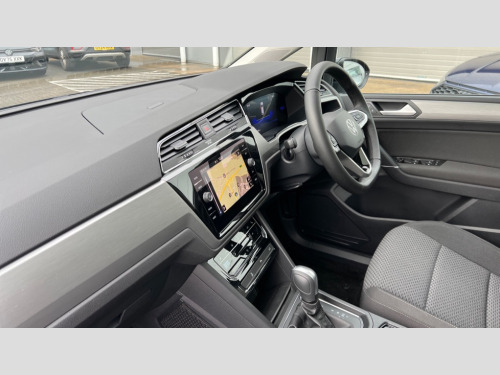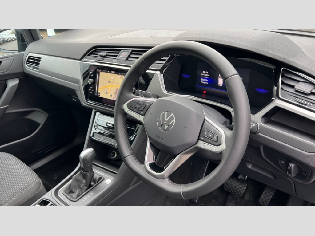Volkswagen Touran 1.5 TSI EVO Match 5dr DSG Adaptive cruise control, Audible lights on warning, Discover media navigation touchscreen navigation/radio system with streaming and internet, Driver alert system, Driver profile selection, Dynamic road sign display, Electric tailgate, Electronic odometer, Emergency services call system, Extended, crash-active and proactive Pedestrian and cyclist monitoring, External temperature gauge, Front parking sensors, Lane change system side assist and rear traffic alert, Lane keep assist, Misfuelling protection device, Mobile pairing with SMS function, Mobile phone interface with inductive charging, Rear view camera displayed via vehicles audio system display, Rev counter with fuel gauge, Side scan, Speed limiter, Speed sensitive power steering, Stop/start system, Think blue trainer driver tips and journey analysis, Trip and service interval display, We connect' and 'We connect plus' functionality, Petrol Particulate Filter, Rear stabiliser bar, XDS electronic differential lock, 4x20 watt output, 8 Speakers, Audio Connectivity System, DAB Digital radio, External USB-C data socket with increased charging performance - 2 USB sockets 45W, MP3/WMA compatability, SD card slot, Title and cover art display, USB connection, Aerial integrated into side window, Auto dimming door mirrors, on driver side, surround lighting and front passenger side mirror lowering function, Auto dimming rear view mirror, Automatic coming/leaving home lighting function, Body colour bumpers, Body colour door handles, Body colour door mirrors with integral indicators, Door mirrors with memory function, Dusk sensor + auto driving lights, Electric folding door mirrors, Electric heated + adjustable door mirrors, Electric, glass sliding/tilting panoramic sunroof including integrated roller blind and LED lighting around aperture, Front and rear electric windows, Fully galvanised body, Gloss black finish B pillar, Green tinted heat insulating glass, High level third brake light, Rain sensor, Rear fog lights, Rear side wing doors, Rear tinted glass from B-pillar backwards approx 65% tinted, Rear wash/wipe with intermittent wipe setting, Removable engine badge, Silver roof rails, Tailgate wiper- reverse gear activation, Twin chrome exhaust tailpipes, Volkswagen roundel, Windscreen wipers intermittent wipe, 12V power point for Row 2, 12V socket in luggage compartment, 2 individual fold flat 3rd row seats, 2 three point seatbelts in 3rd row, 2nd row centre armrest, 2nd row centre seat converts into table, 3 single slide/fold/removable 2nd row seats, 3 spoke steering wheel, 3x3 point seatbelts on 2nd row with height adjust on outer seats, 4 boot load lashing points, 4 way adjustable front head restraints, 5 headrests, Activated charcoal canister for intensified evaporation system, Air care climatronic 3 zone air conditioning system with rear air conditioning control panel, Chrome plated radiator grille inserts, air vent surrounds and light switch surrounds, Driver and front passenger under seat drawer, Dust/pollen filters, Foldable front passenger seat backrest with load through function, Front and rear reading lights X 2, Front centre armrest with storage compartment, Front comfort seats with lumbar support, Front cupholders x 2, Front passenger seat height adjust, Front seat storage pockets, Front seatback folding tables, Height adjustable driver's seat, Height/reach adjust steering wheel, Illuminated glovebox, Instrument lighting white adjustable panel illumination with red night time illumination, Interior light with delay, Isofix on 2nd row outer seats, Isofix on 3rd row seats, Large storage compartment in roof console, Lasano cloth upholstery, Leather multifunction steering wheel with gear knob, Leatherette on rear of front seats, Low tunnel 2nd row seat, Luggage compartment lighting, Media box in dashboard on passenger side, Multi storage in passenger/luggage areas, Multi-function centre console with storage facilities, Retractable luggage cover, Split folding rear seat backrests, Storage bins on all doors, Sun visors with illuminated vanity mirrors, Family Pack - Touran, Winter pack without heated washer jet - Touran, 3 point height adjustable front seatbelts, Auto hold function, Automatic post collision braking system, Door open warning reflectors, Driver/Front Passenger airbags, Drivers knee airbag, EDL + ASR, Electronic parking brake, Energy recovery system, ESC with ABS, First aid kit, Front and rear (row 2) curtain airbags, Front assist with autonomous emergency braking, Front seat side impact airbags, Front seatbelt pretensioners, Front/rear disc brakes, Hill hold control, Hydraulic Brake Assist (HBA), Loose wheel warning function, Manual passenger airbag deactivation function, Pre crash preventive occupant protection, Proactive passenger protection system with front and side assist, Rear child proof door locks, Road sign recognition, Seatbelt warning lamp and buzzer, Traction control, Two tone horn, Warning triangle, Alarm with remote central locking and interior protection, Electronic engine immobiliser, Keyless Access Keyless locking and starting system with SAFELOCK, New brushed design decorative inserts in dash and front doors, 17" Salvador alloy wheels with anti-theft wheel bolts, 215/55 R17 self sealing tyres with low rolling resistance
