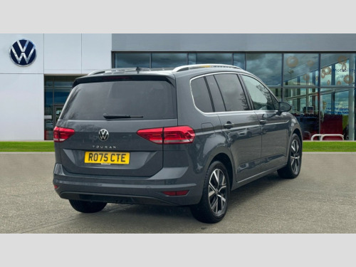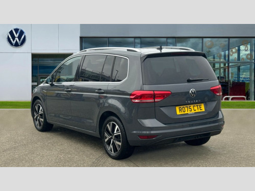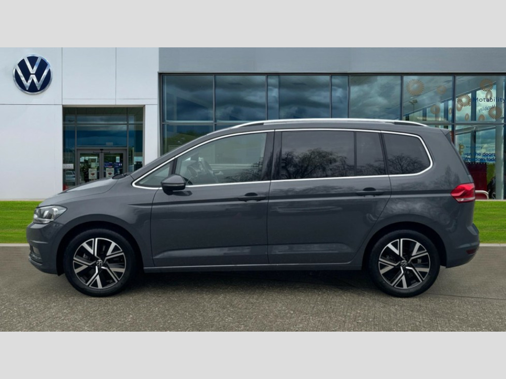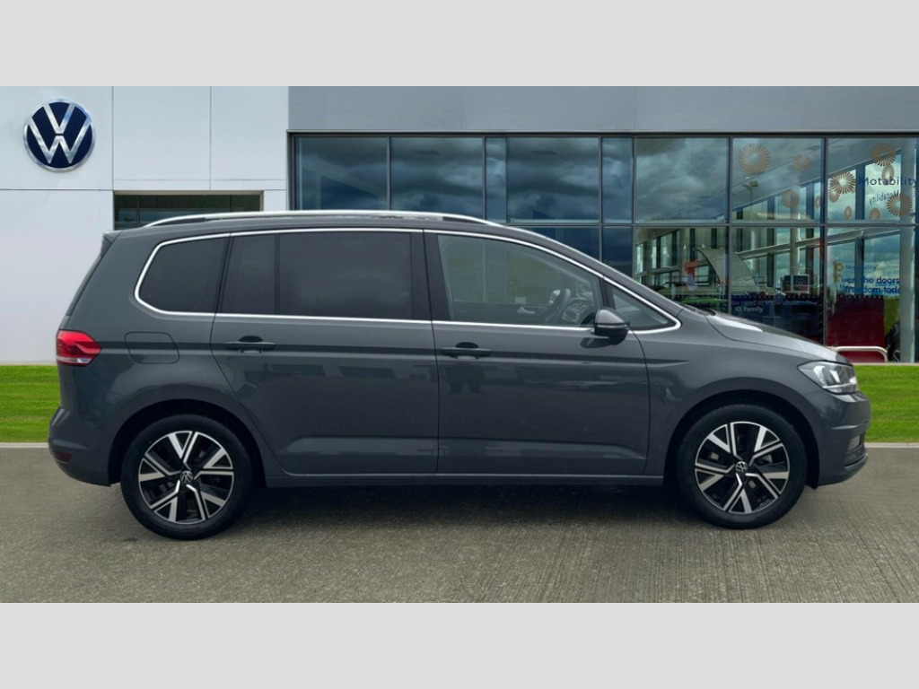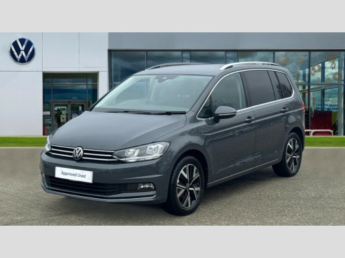 Volkswagen Touran 1.5 TSI EVO SEL 5dr DSG Active info display - Digital cockpit 10.25" HD display screen, Adaptive cruise control, Audible lights on warning, Discover media navigation touchscreen navigation/radio system with streaming and internet, Driver alert system, Driver electronic voice amplification function, Driver profile selection, Dynamic road sign display, Electronic odometer, Emergency services call system, Extended, crash-active and proactive Pedestrian and cyclist monitoring, External temperature gauge, Front parking sensors, Lane change system side assist and rear traffic alert, Lane keep assist, Mobile pairing with SMS function, Mobile phone interface with inductive charging, Rev counter with fuel gauge, Speed limiter, Speed sensitive power steering, Stop/start system, Think blue trainer driver tips and journey analysis, Trip and service interval display, Wireless app connect without mirror link, Petrol Particulate Filter, XDS electronic differential lock, 4x20 watt output, 8 Speakers, Audio Connectivity System, DAB Digital radio, External USB-C data socket with increased charging performance - 2 USB sockets 45W, MP3/WMA compatability, SD card slot, Title and cover art display, USB connection, Aerial integrated into side window, Auto dimming door mirrors, on driver side, surround lighting and front passenger side mirror lowering function, Auto dimming rear view mirror, Automatic coming/leaving home lighting function, Body colour bumpers, Body colour door handles, Body colour door mirrors with integral indicators, Chrome fog light surround, Chrome lower front bumper insert, Chrome trimmed front air intake surrounds, Chrome trimmed radiator grille louvre inserts, Chrome trimmed side windows, Dusk sensor + auto driving lights, Front and rear electric windows, Front fog lights with static cornering function, Fully galvanised body, Gloss black finish B pillar, Green tinted heat insulating glass, High level third brake light, Rain sensor, Rear side wing doors, Rear tinted glass from B-pillar backwards approx 65% tinted, Rear wash/wipe with intermittent wipe setting, Silver roof rails, Tailgate wiper- reverse gear activation, Twin chrome exhaust tailpipes, Volkswagen roundel, Windscreen wipers intermittent wipe, 12V power point for Row 2, 12V socket in luggage compartment, 2 individual fold flat 3rd row seats, 2 three point seatbelts in 3rd row, 2nd row centre armrest, 2nd row centre seat converts into table, 3 single slide/fold/removable 2nd row seats, 3 spoke steering wheel, 3 Zone electronic climate control with automatic air recirculation, 3x3 point seatbelts on 2nd row with height adjust on outer seats, 4 boot load lashing points, 4 way adjustable front head restraints, 5 headrests, Ambient lighting in door trim and foot well, Art velour/Microfibre cloth upholstery, Driver and front passenger under seat drawer, Dust/pollen filters, Foldable front passenger seat backrest, Front + rear carpet mats, Front and rear reading lights, Front centre armrest with storage compartment, Front comfort seats with lumbar support, Front cupholders x 2, Front passenger seat height adjust, Front seat storage pockets, Front seatback folding tables, Height adjustable driver's seat, Height/reach adjust steering wheel, Illuminated glovebox, Illuminated vanity mirrors, Instrument lighting white adjustable panel illumination with red night time illumination, Interior light with delay, Isofix on 2nd row outer seats, Isofix on 3rd row seats, Large storage compartment in roof console, Leatherette on rear of front seats, Low tunnel 2nd row seat, Luggage compartment lighting, Media box in dashboard on passenger side, Multi storage in passenger/luggage areas, Multi-function centre console with storage facilities, Multifunction leather trimmed steering wheel including leather trimmed gear knob with 3.5" screen with multifunction computer, Retractable luggage cover, Split folding rear seat backrests, Storage bins on all doors, Mirror pack - Touran, 3 point height adjustable front seatbelts, Auto hold function, Automatic post collision braking system, Door open warning reflectors, Driver/Front Passenger airbags, Drivers knee airbag, EDL + ASR, Electrically operated child locks on rear doors, Electronic parking brake, Energy recovery system, ESC with ABS, First aid kit, Front and rear (row 2) curtain airbags, Front assist including city emergency braking, Front seat side impact airbags, Front seatbelt pretensioners, Front/rear disc brakes, Hill hold control, Hydraulic Brake Assist (HBA), Loose wheel warning function, Manual passenger airbag deactivation function, Pre crash preventive occupant protection, Proactive passenger protection system with front and side assist, Rear child proof door locks, Seatbelt warning lamp and buzzer, Traction control, Two tone horn, Warning triangle, Alarm with remote central locking and interior protection, Electronic engine immobiliser, Chrome plated instrument surrounds, Piano black decorative inserts, 17" Alexandria alloy wheels with self sealing tyres and anti-theft wheel bolts