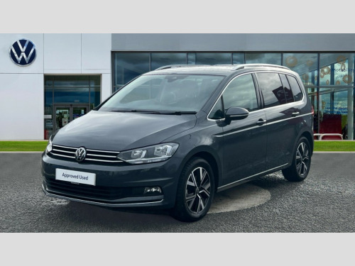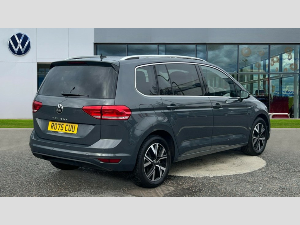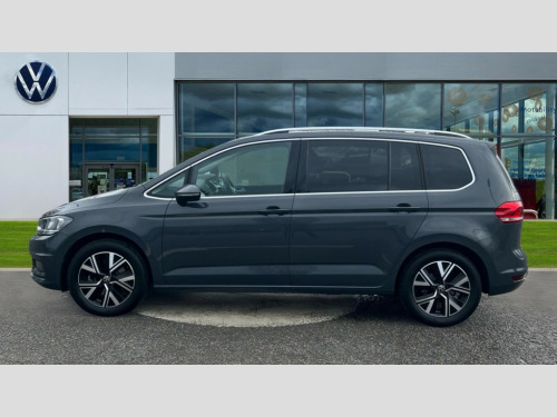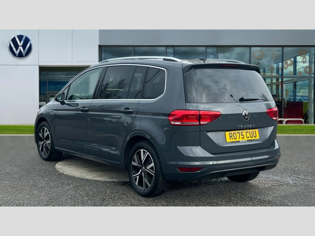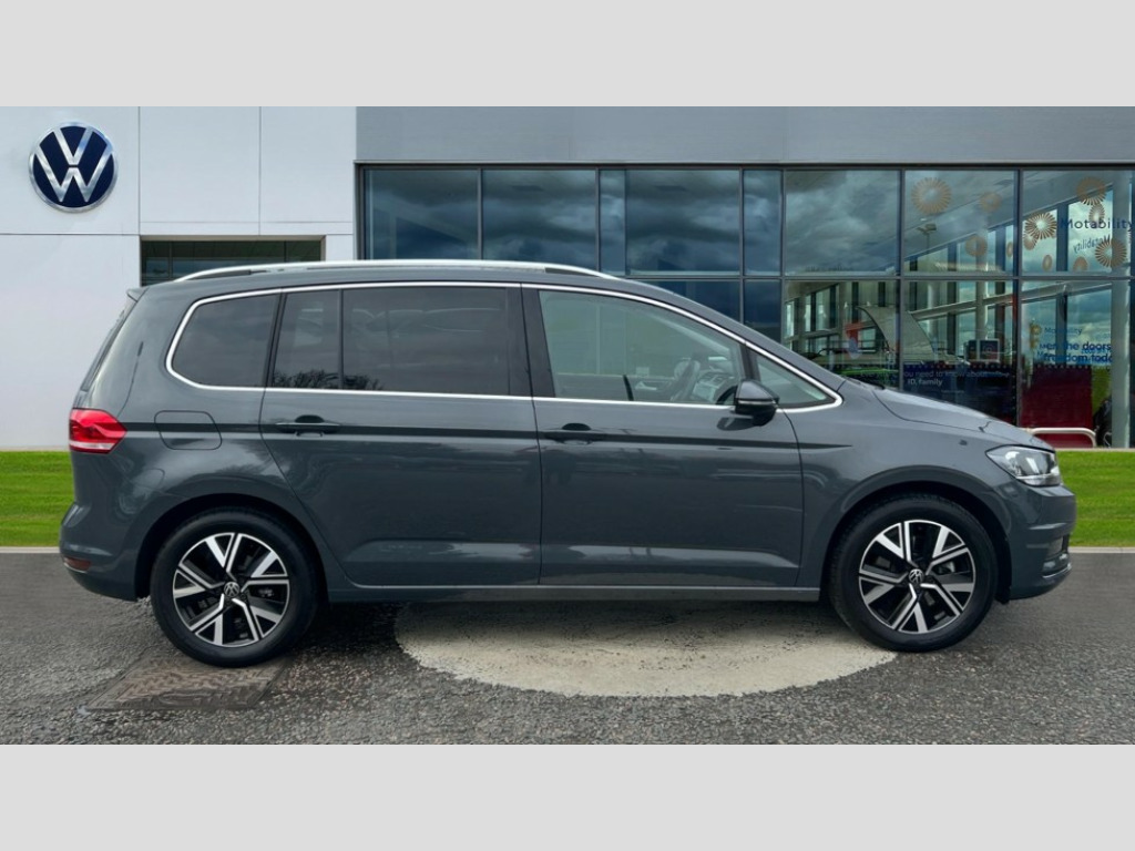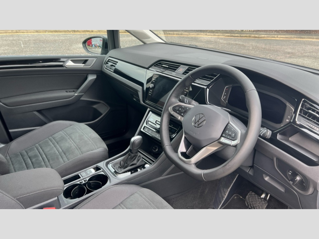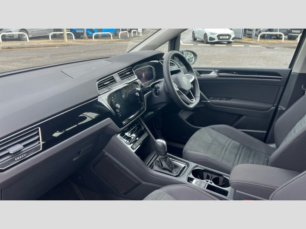 Volkswagen Touran 1.5 TSI EVO SEL 5dr DSG Active info display - Digital cockpit 10.25" HD display screen, Adaptive cruise control, Audible lights on warning, Discover media navigation touchscreen navigation/radio system with streaming and internet, Driver alert system, Driver electronic voice amplification function, Driver profile selection, Dynamic road sign display, Electronic odometer, Emergency services call system, Extended, crash-active and proactive Pedestrian and cyclist monitoring, External temperature gauge, Front parking sensors, Lane change system side assist and rear traffic alert, Lane keep assist, Mobile pairing with SMS function, Mobile phone interface with inductive charging, Rev counter with fuel gauge, Speed limiter, Speed sensitive power steering, Stop/start system, Think blue trainer driver tips and journey analysis, Trip and service interval display, Wireless app connect without mirror link, Petrol Particulate Filter, XDS electronic differential lock, 4x20 watt output, 8 Speakers, Audio Connectivity System, DAB Digital radio, External USB-C data socket with increased charging performance - 2 USB sockets 45W, MP3/WMA compatability, SD card slot, Title and cover art display, USB connection, Aerial integrated into side window, Auto dimming door mirrors, on driver side, surround lighting and front passenger side mirror lowering function, Auto dimming rear view mirror, Automatic coming/leaving home lighting function, Body colour bumpers, Body colour door handles, Body colour door mirrors with integral indicators, Chrome fog light surround, Chrome lower front bumper insert, Chrome trimmed front air intake surrounds, Chrome trimmed radiator grille louvre inserts, Chrome trimmed side windows, Dusk sensor + auto driving lights, Front and rear electric windows, Front fog lights with static cornering function, Fully galvanised body, Gloss black finish B pillar, Green tinted heat insulating glass, High level third brake light, Rain sensor, Rear side wing doors, Rear tinted glass from B-pillar backwards approx 65% tinted, Rear wash/wipe with intermittent wipe setting, Silver roof rails, Tailgate wiper- reverse gear activation, Twin chrome exhaust tailpipes, Volkswagen roundel, Windscreen wipers intermittent wipe, 12V power point for Row 2, 12V socket in luggage compartment, 2 individual fold flat 3rd row seats, 2 three point seatbelts in 3rd row, 2nd row centre armrest, 2nd row centre seat converts into table, 3 single slide/fold/removable 2nd row seats, 3 spoke steering wheel, 3 Zone electronic climate control with automatic air recirculation, 3x3 point seatbelts on 2nd row with height adjust on outer seats, 4 boot load lashing points, 4 way adjustable front head restraints, 5 headrests, Ambient lighting in door trim and foot well, Art velour/Microfibre cloth upholstery, Driver and front passenger under seat drawer, Dust/pollen filters, Foldable front passenger seat backrest, Front + rear carpet mats, Front and rear reading lights, Front centre armrest with storage compartment, Front comfort seats with lumbar support, Front cupholders x 2, Front passenger seat height adjust, Front seat storage pockets, Front seatback folding tables, Height adjustable driver's seat, Height/reach adjust steering wheel, Illuminated glovebox, Illuminated vanity mirrors, Instrument lighting white adjustable panel illumination with red night time illumination, Interior light with delay, Isofix on 2nd row outer seats, Isofix on 3rd row seats, Large storage compartment in roof console, Leatherette on rear of front seats, Low tunnel 2nd row seat, Luggage compartment lighting, Media box in dashboard on passenger side, Multi storage in passenger/luggage areas, Multi-function centre console with storage facilities, Multifunction leather trimmed steering wheel including leather trimmed gear knob with 3.5" screen with multifunction computer, Retractable luggage cover, Split folding rear seat backrests, Storage bins on all doors, Mirror pack - Touran, 3 point height adjustable front seatbelts, Auto hold function, Automatic post collision braking system, Door open warning reflectors, Driver/Front Passenger airbags, Drivers knee airbag, EDL + ASR, Electrically operated child locks on rear doors, Electronic parking brake, Energy recovery system, ESC with ABS, First aid kit, Front and rear (row 2) curtain airbags, Front assist including city emergency braking, Front seat side impact airbags, Front seatbelt pretensioners, Front/rear disc brakes, Hill hold control, Hydraulic Brake Assist (HBA), Loose wheel warning function, Manual passenger airbag deactivation function, Pre crash preventive occupant protection, Proactive passenger protection system with front and side assist, Rear child proof door locks, Seatbelt warning lamp and buzzer, Traction control, Two tone horn, Warning triangle, Alarm with remote central locking and interior protection, Electronic engine immobiliser, Chrome plated instrument surrounds, Piano black decorative inserts, 17" Alexandria alloy wheels with self sealing tyres and anti-theft wheel bolts