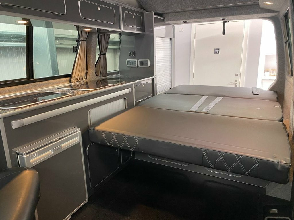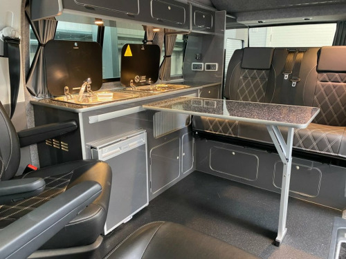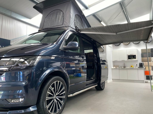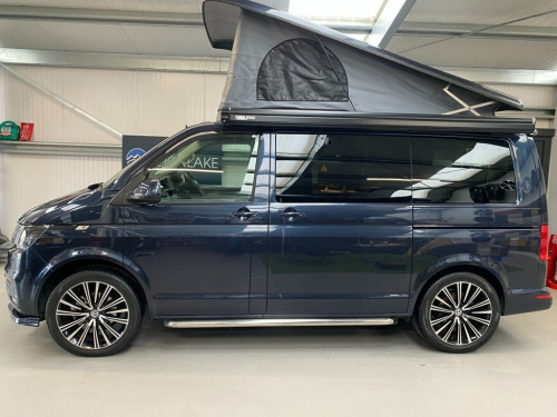 LOW MILEAGE Highline Transporter Finished in Stunning Starlight Blue Paintwork, with the superb Camper King St Tropez interior, Diesel Heater, Deluxe Upholstery, 20L integrated Water Tank, Gas hob, Sink with running water, 4 Berth, LED HEADLIGHTS, SAFARI Pop top roof, LED lighting, SOLAR PANEL, Leisure/Auxiliary battery, TOW BAR, Fridge, RIB bed, 4 Belted seats, Isofix on rear seats, DAB Radio and Touchscreen, Bluetooth, Apple Car Play/Android Auto/Mirror Link, Air conditioning, Adaptive Cruise Control, Front and Rear Parking Sensors, Heated Windscreen, Auto Lights, Auto Wipers, Multifunction Steering Wheel, 20" Wheels, Electrically adjustable and folding door mirrors, Electric front windows, 2 Keys, Low Miles. VW Warranty and VW Commercial roadside assistance available. We have a wide selection of VW T6 & 6.1 Campers - all newly converted by Camper King. We can build any van to your personal spec. We have various different styles available - and extras such as diesel heaters, bike racks, sun shades, awnings and solar panels can be added. We have a range of vans in different colours and different style interiors. Please note that Autotrader automatically inputs some of the specification for these vehicles in this advert. Please check with us for any details, as some features may be incorrect. Why not come along to one of our showrooms to see what we have in stock or to choose your very own specification from one of our vans ready to convert. WE HAVE SHOWROOMS IN