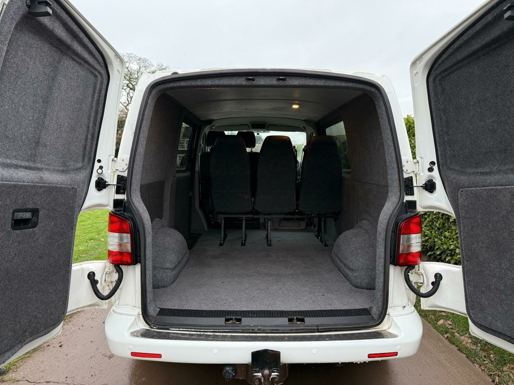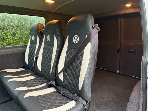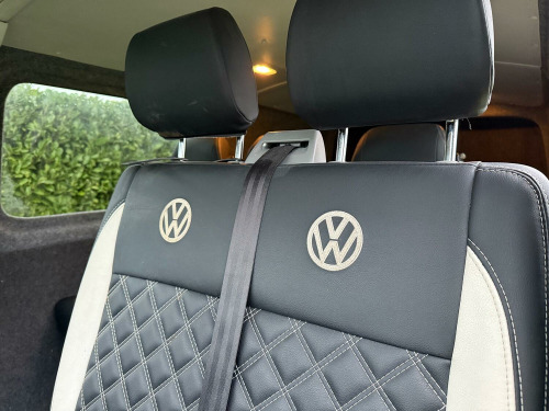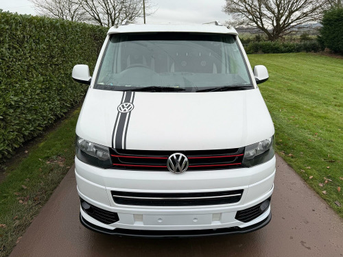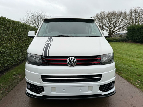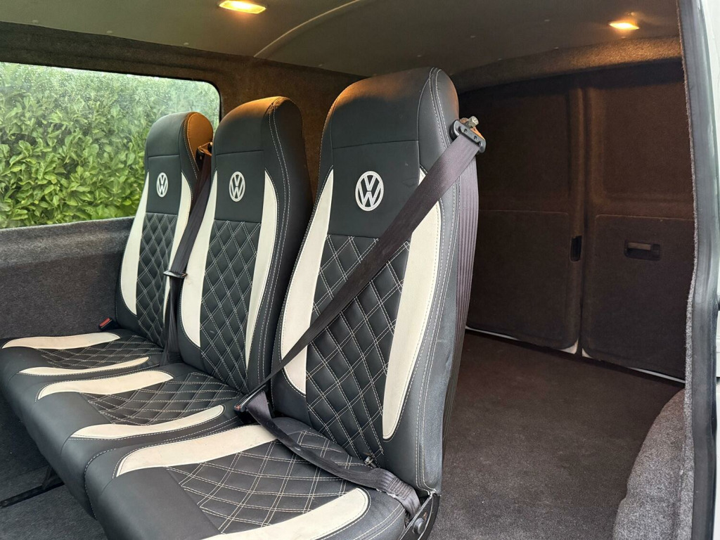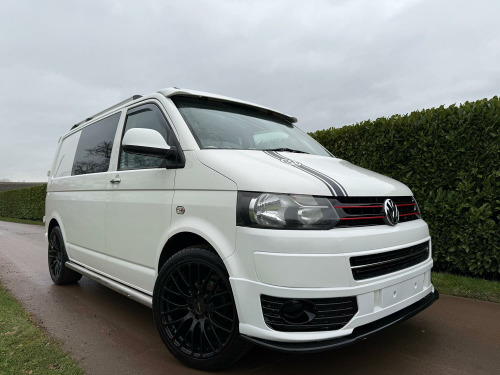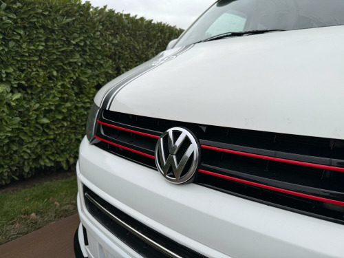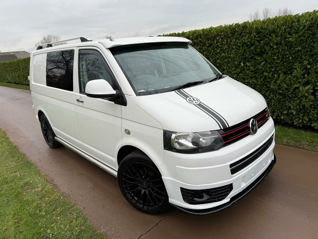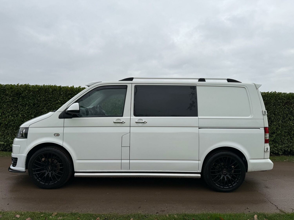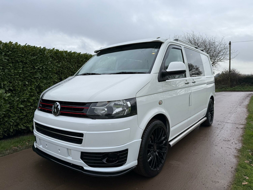 Great value T5.1 Kombi converted. 95000 miles. Finished in Candy White. Full leather seats. 6 seats. 20 inch alloys, body coloured mouldings. Aluminium roof bars. Sportline front spoiler with gloss black inserts. White rear roof spoiler. Reverse camera. Fully carpet lined. Stainless side bars. Gloss black front grille with red inserts. Wind deflectors. Service history, 2 keys.