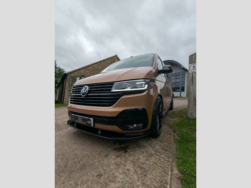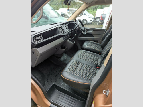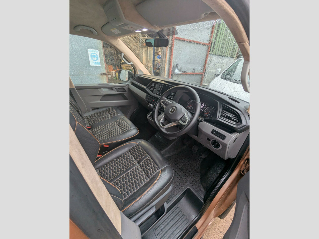 2020 20 Factory VW Transporter T6.1 2.0 Turbo Diesel 6 Seat kombi Van Tailgate 150Bhp factory built in metallic Bronze with Copper/ Black Leather interior with 54,000 Warranted Miles from new with full service history T30 Highline spec(Air Con, Bluetooth, Electric windows, Electric mirrors, DAB radio, Heated screen, Parking sensors all around, Cruise control, Apple Carplay / Android Auto), , Full service history including cam belt and water pump, Brand new 20″ Navis Luxe gloss black alloys, 4 x brand new Maxxis tyres, S T adjustable lowering coilovers front and rear, Uprated Meyle HD top mounts , Factory privacy windows all around, Factory kombi flooring, Camel Alcantara headlining throughout, Hexagon stitch leather upholstery, Genuine LED front headlights and rear taillights, Tailgate, 8 x LED, Rear speakers, Gloss black front grill, splitter and wing mirror caps, LV-R rear spoiler, Factory Android Auto and Apple carplay, 3 months warranty provided