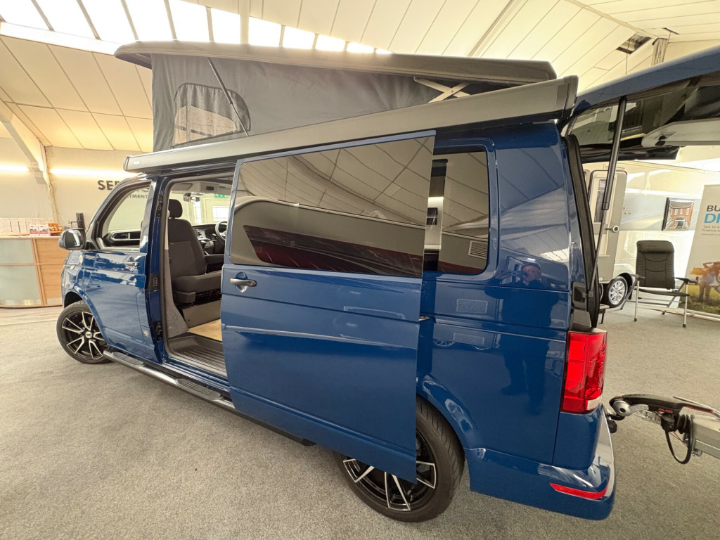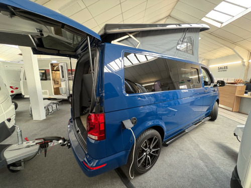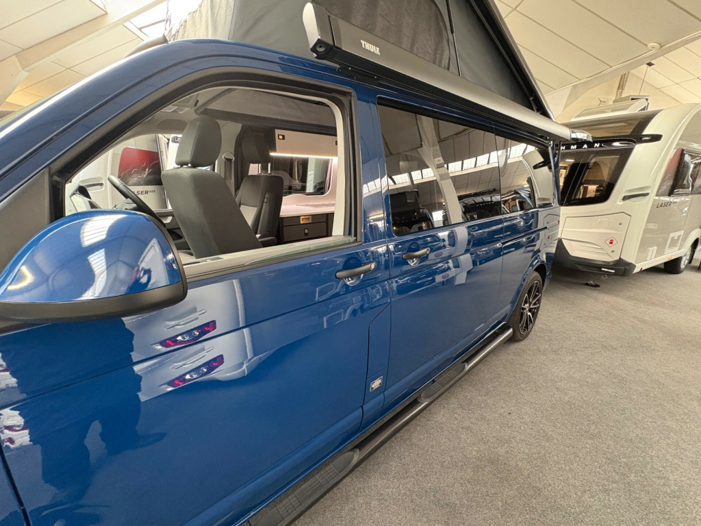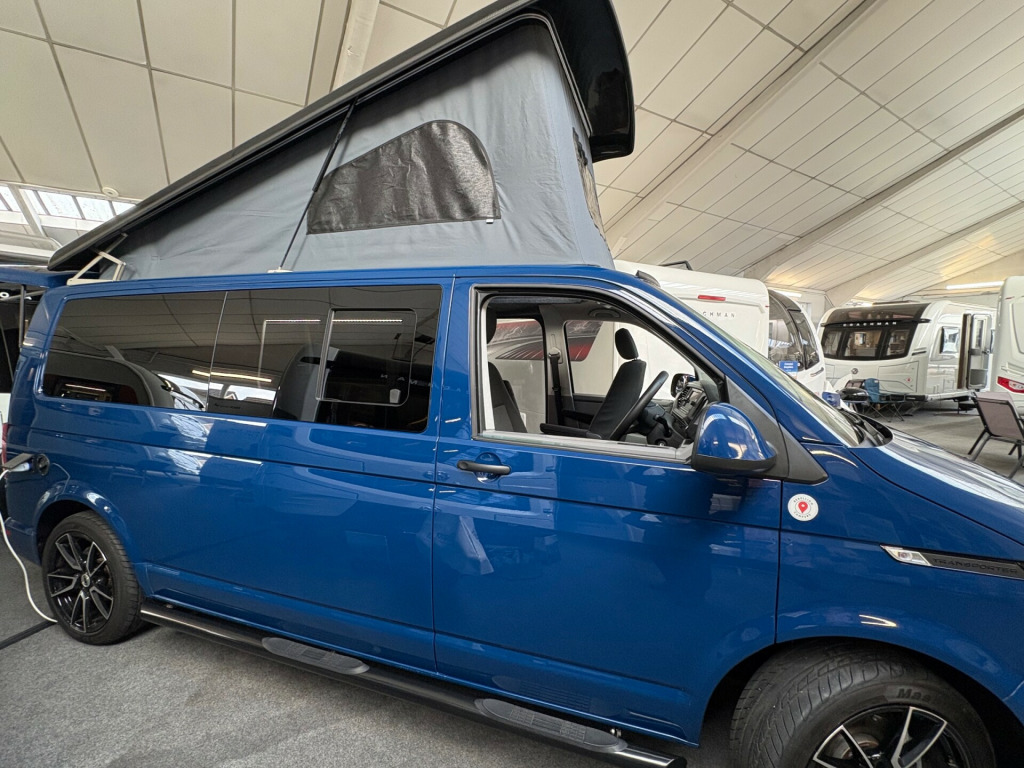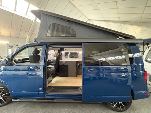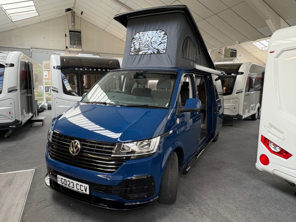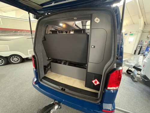 Year 2023, Berth: 4, 2.0 TDI, Automatic, Length: 4.9m / 16'1'', Width: 1.9m / 6'2'', Height: 1.99m / 6'6''. Ist reg 15.06.23. Rebellion campervan conversion. This four berth long wheel base camper has four travelling seats with seat belts. The rear seats become a double bed, while another bed is included within the pop top. A small kitchen with water a two burner gas hob, and a compressor fridge, provide options for a hot drink or to make a meal, whether you are just out for the day or out for longer. The Thule wind out canopy provides shade enabling people to sit outside, without worrying about the full glare of the sun. The cab air con and onboard diesel heater, provide a comfortable interior at any time of year. The rear tow bar is useful to tow a trailer, caravan or even to mount a cycle carrier. uise control, parking camera, power steering, rear parking sensor, steering wheel rake adjustment, abs, air bag, isofix child seat anchor points, twin air bags, immobiliser, remote central locking, electric front windows, electric handbrake, electric mirrors, electric windows, heated door mirrors, front armrest, alloy wheels, body coloured bumpers, front fog lights, side steps, solid paint, spare wheel, towbar - fixed, rear rock 'n' roll bed, cold water and sink, two burner gas hob, grill, sanjo compressor fridge, thetford porta potti toilet, thule wind out canopy, led lighting, usb sockets, two rear travel seats with seat belts, pop up top with additional bed, rebellion camper conversion, diesel heater, black side rails, apple car play, on board water tank, cab air conditioning, 19