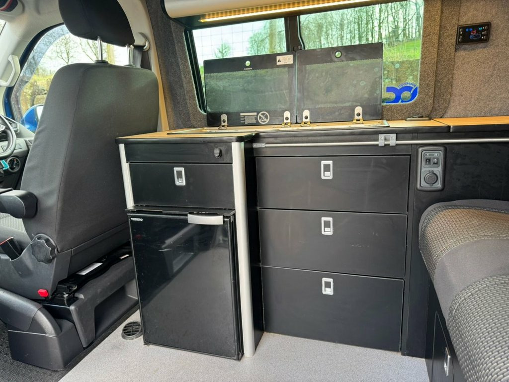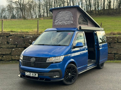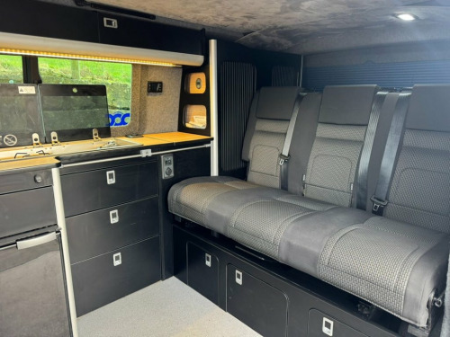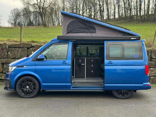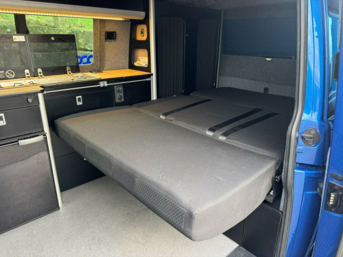 2021 Volkswagen Transporter T6.1, T32 Kombi Highline SWB, Euro 6 150PS 2.0TDI 6 speed manual. This vehicle is finished in Ravana Blue metallic with black cloth interior seats. The vehicle has been owned since new and has been converted by the owner to a very high standard. The vehicle has covered 23,000 miles and has been serviced at Volkswagen and will be serviced again by Volkswagen prior to sale. It has a MOT which is valid until August 2026 with no advisories. The vehicle remians in great condition throughout and comes with handbooks, service and MOT paperwork, V5 and 2 sets of remote keys. The vehicles specification is as follows: Wasp Addition which includes - 20" black alloys, rear spoiler, front splitter, lowered suspension 30mm - roof bars, side bars and wind deflectors. 5 belted seats Adaptive cruise control with speed limiter Auto headlights, wipers and rain sensors Climate control air conditioning Heated front seats 2 x ISOFIX and top tether child seat anchorage Front and rear parking sensors Composition colour DAB+ radio with touch screen USC charging points Tailgate with window and glazed sides Lights and vision pack 2x front captains seats 3 seat RIB bed in matching fabric to front seat EVO Motions Kitchen units with soft close drawers. LED lighting throughout Vanshades blinds Diesel heater with electric fob 200W solar panel 120ah AGM leisure battery Victron charging Victron smart battery monitor with option to link to phone Split charge 12V Socket - Additional, 17in Alloy Wheels - Devonport - Silver, ABS - Anti-Lock Braking System, ASR - Anti Slip Regulation, Air Conditioning - Electronically Contro, Allergen Filter, Anti-Theft Alarm System with Interior Mo, Armrest - Drivers and Passenger, Auto-Dimming Breakaway Interior Rearview, Automatic Headlight Activation with Dayt, BAS - Brake Assist System, Basic Single Passenger Seat, Comfort Pack, Composition Colour DAB Plus Radio System, Crosswind Assist, Cruise Control - Adaptive with Speed Lim, Dash Panel with Open Stowage Compartment, Driver Alert System, Drivers and Front Passengers Airbags wit, EDL - Electronic Differential Lock, ESP - Electronic Stability Programme, Electr