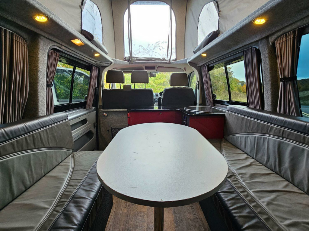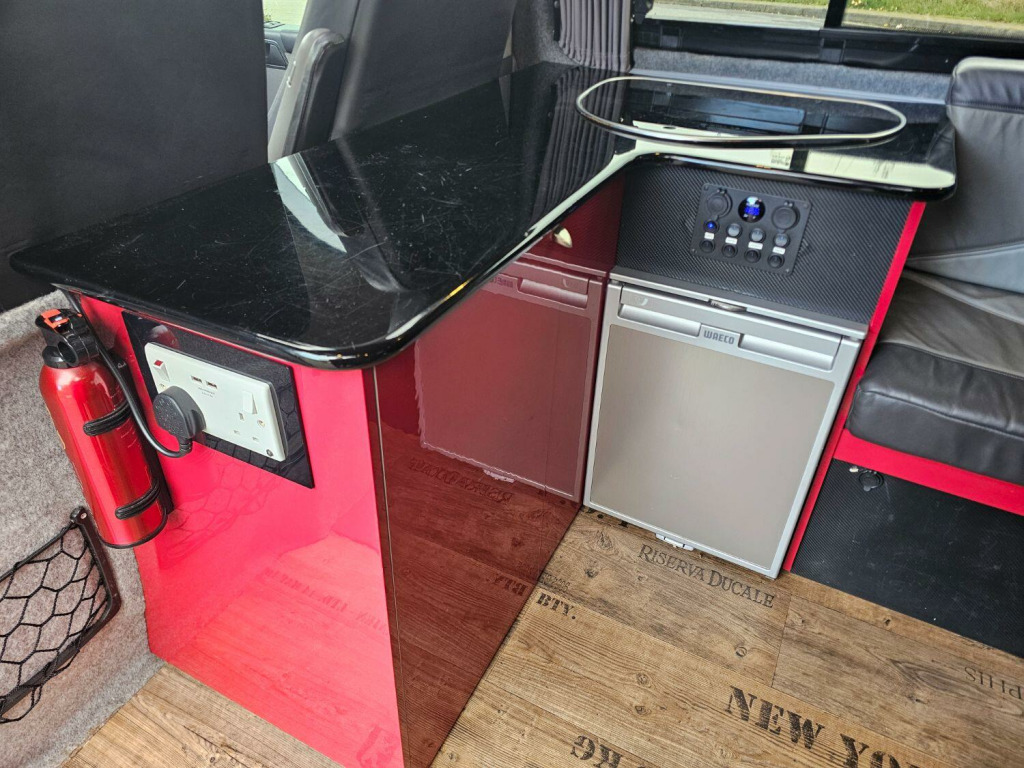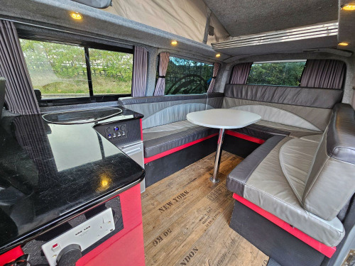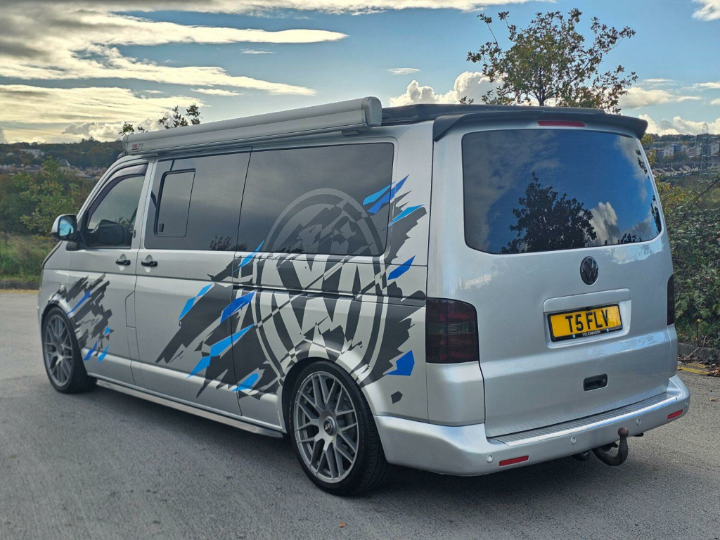 * VW Transporter T5, * LWB Pop Top Campervan, * 2006 2.5 TD, * 6 speed manual, * 4 Berth, * Air conditioning, * Upgrade T5.1 front , * Fiamma F45 awning, * Lounge conversion , * Fridge / Freezer, * Gas hobs / Sink, * LED interior lighting, * Upgraded steering wheel, * Reversing camera, * Leisure battery with split charger 240v hook up , * Lano guarded underneath, * Electric windows & mirrors, * Upgrade alloy wheel, * Lowered, * Front windscreen cover , * Towbar, * Drivers captain seat, * USB ports, * Blackout curtains, * Carbon dash inserts, * Private reg included
