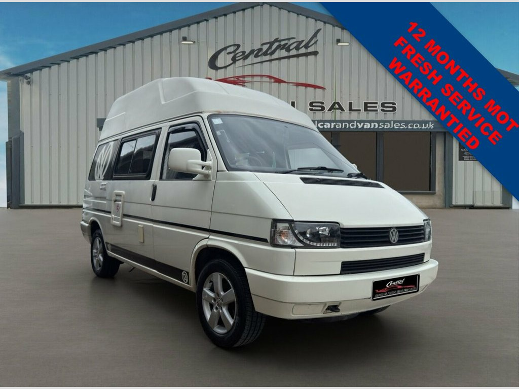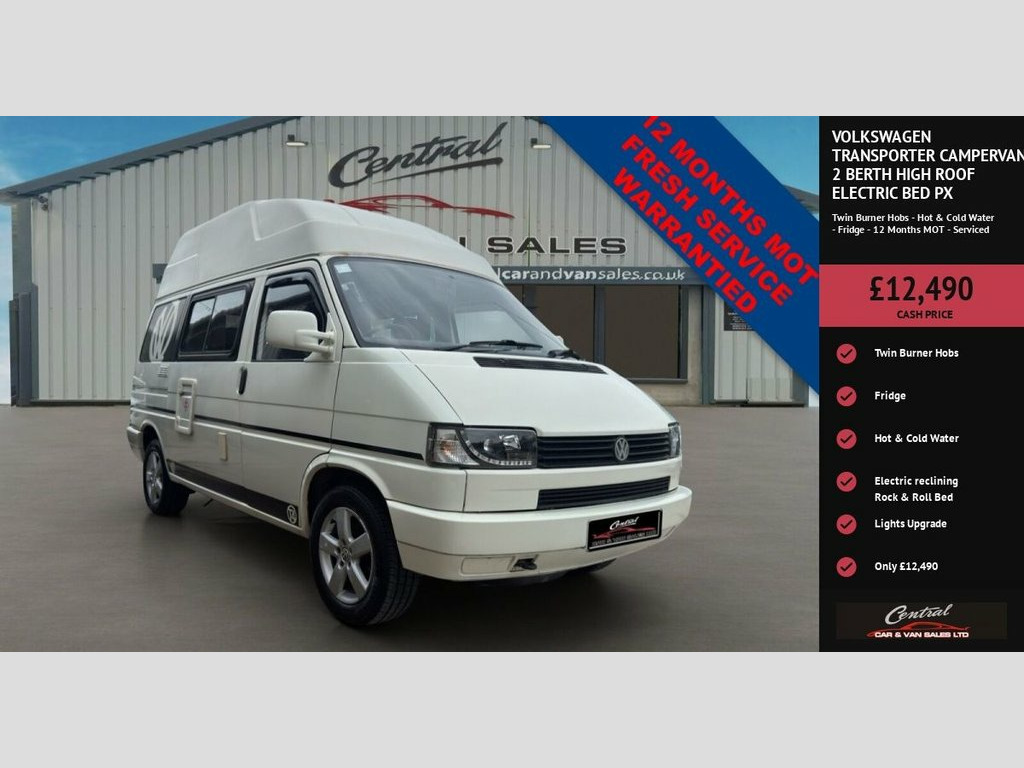 December 1995 Volkswagen Transporter T4 1.9 TDI 2 Berth Campervan with High Roof. This reliable and capable campervan has a gorgeous conversion layout and has a super rare electric lay and fold rock & roll bed, it also has a fridge, sink with hot & cold water, twin burner hobs, electric hook up with leisure battrey and split charging, fully insulated with skylight, fold down television, x4 seat belts and 4 traveling seats, storage cupboards, gas bottle, Upgraded headlights & Tail Lights. The camper is fully functioning and ready to go away in, will come with 12 months MOT from the day of purchase along with a service! The van has power steering & a Sony CD player head unit, The seats are fully retrimmed with VW embossed quilted two tone leather with armrests, This is a fantastic easy to use dependable campervan!