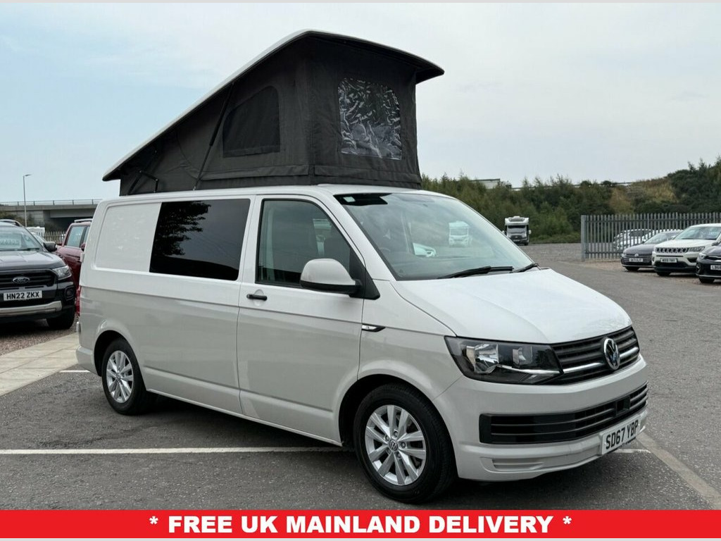 VOLKSWAGEN TRANSPORTER SERG CAMPER CONVERSION 2.0 TDI T28 BLUEMOTION MANUAL 4 BERTH ( POP TOP ROOF WITH DOUBLE BED, ROCK N ROLL BED, ROOF BED, END LOUNGE, 4 BERTH, 5 SEATBELTS, ) Comes in a gorgeous Volkswagen white paint with split beige body paint and white contrast pop top roof, 17 inch Volkswagen alloy wheels, SERG camper conversion Volkswagen exterior pack, Privacy glass, Barndoor tailgate, Power cable, Premium elevating roof with bed, SERRG camper conversion body kit, Upgrade tow bar, Electric windows, Electric adjustable wing mirrors, 5 speed manual gearbox, LED trip computer speedometer display, Central locking, Stunning unique Volkswagen SERG camper conversion black and navy blue luxury half leather and plush suede pattern interior seats throughout with white piping, Climate control no A/C, Volkswagen Bluetooth touch screen media interface, DAB radio, Bluetooth, Aux/usb ports, On board SERG camper conversion signature furniture, SERG camper conversion easy clean laminate rear flooring, Passenger seat swivel seats, SERG camper conversion panels and insulation, Dometic sink with gas hobs, Small on board fridge with freezer department, Water pump system with on board water tank, Various storage cupboards, Carpet walls and curtains throughout, Split charger, Lighting throughout, Leisure battery and 240 volt hook up, 2 seater rock n roll fold out bed with 2 rear seatbelts, Large roof double bed, Gorgeous luxury SERG camper conversion finishing's throughout, On board 12V Socket x2, 16in Steel Wheels, ABS - Anti-Lock Braking System, Airbags - Driver and Front Passenger wit, Automatic Post-Collision Braking System, BAS - Brake Assist System, Black Door Mirrors and Door Handles, Black Wheel Centre Caps, Bluetooth Hands Free Set, Bumpers - Front and Rear - Black, Composition Colour DAB+ Radio with 5in T, Dashboard - Dimmable Illumination, Digital Clock, Door Mirrors - Electrically Adjustable a, Driver Alert with Multi-Function Display, Drivers Seat with Height - Lumbar - Reac, EBD - Electronic Brake Pressure Distribu, EDL - Electronic Differential Lock, ESP - Electronic Stability Programme, Electric Windows - Front, Electronic Engine Immobiliser, Front Assis
