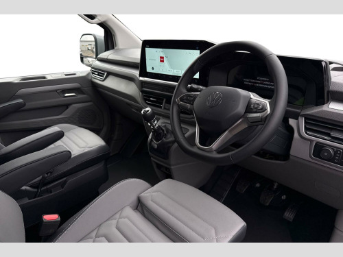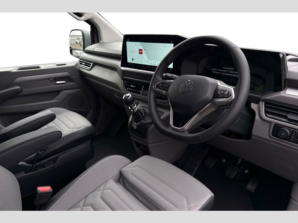The Volkswagen Transporter is known for its practicality and reliability. This model benefits from being in a low insurance group, which can help to reduce running costs. Its Euro 6 compliant engine also means it meets current emissions standards, making it a sensible choice for businesses and individuals alike. Stone Grey-Solid paint, Single sliding side load door, LED main headlight, LED daytime running light, cornering light and poor weather light, LED rear lights with exclusive light signature, Rear loading cargo doors without windows, Power folding/Heated external mirrors with puddle lights, Full height bulkhead, 2 seater cab pack with heated seats, Electric front seats in leatherette with driver's sports seat, Illuminated scuff plates, Arm rests for both front seats, Heated leatherette-wrapped multi-function steering wheel, Style interior trim pack - Transporter, 2 Seater Cab Pack, Rear loading cargo doors-without windows, Single sliding side load door, Stone Grey-Solid Paint, 17" 'Le Mans' alloy wheel, Temporary spare steel wheel, Heat reflecting side window glass, Body coloured door handles, Mud flaps front and rear, Rear Transporter nameplate in black grained decorative trim, Vehicle opening configuration 1x driver door, 2x all doors with additional CEP locking, Electromechanical brake booster, Electronic stability control, ABS, ASR with deactivation button, hill start assist and brake assist system, Adaptive cruise control, Electromechanical speed sensitive power steering, height and longitudinally adjustable steering column, Lane and blind spot assist with exit warning system, Wrong way driver warning, Electrically heated, adjustable and folding door mirrors, Driver and front passenger airbag with front passenger airbag deactivation, Dual tone horn, Front and curtain airbags for driver and front passenger, Seat belt pretensioner for driver seat, Apple CarPlay and Android Auto, Wireless mobile phone charging, 12" digital drivers display, 13" touchscreen infotainment display with wireless app connect and DAB radio, 5G Modem, Dynamic road sign display, eCall emergency system, Preparation of VW connect and connect plus, Alternator - 230A, 2x 15-W USB data/charging ports in dashboard and 1x USB-C, 1x USB-A center bottom, Additional 15W USB charging ports - 1x storage compartment front of steering wheel, 1x glove compartment, 1x interior rearview mirror, Black plastic scuff plate for sliding door in cargo without illumination, Glasses compartment in driver side roof, Grab handle on A-pillar passenger side, Illuminated lockable glovebox, Leatherette gear lever, Narrow centre console with cup holder and compartment for mobile phone, Overhead storage compartment, Rubber floor covering in cab, Striped fabric upholstery, Cabin interior lighting, 12V outlet in centre console and 12V outlet on rear right D-pillar, 2x LED lights in load compartment, 3x additional super bright LED lights in load compartment, Lashing rings for reinforced floor covering, Without passenger seats in load compartment, Exterior pack 2 - Transporter, 4 way height and tilt adjustable head restraints, Anti theft alarm system with interior monitoring in cab, backup horn and towing protection, Electronic immobiliser, Lockable wheel bolts, Preparation for alcohol ignition interlock, 5+ Promise