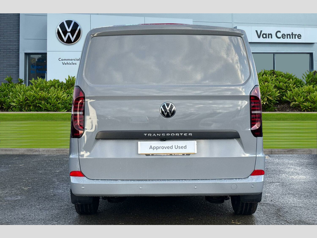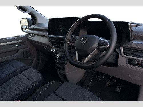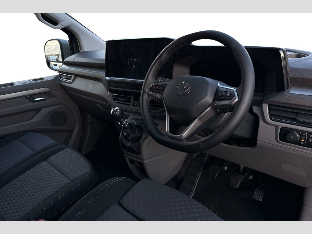 Volkswagen Transporter 2.0 TDI 110 Commerce Pro Van Solid paint, Harman kardon sound system with 4 speakers, Navigation system, 70 litre fuel tank, Keyless start with safelock, High metal partition fabric covering on upper part of partition on cab side, Rear tailgate, 3 seat cab package heated - Transporter, Parking package premium - Transporter, Solid - Stone Grey, Towbar preparation, 17" Le Mans glossy black alloy wheels, Heat reflecting side window glass, Body colour bumpers, Body coloured door handles, Body coloured radiator grille, Mud flaps front and rear, Rear Transporter nameplate in black grained decorative trim, Vehicle opening configuration 1x 1st row of seats, 2x all doors, Electromechanical brake booster, Electronic stability control, ABS, ASR with deactivation button, hill start assist and brake assist system, Adaptive cruise control, Electromechanical speed sensitive power steering, height and longitudinally adjustable steering column, Lane and blind spot assist with exit warning system, Wrong way driver warning, Body coloured door mirrors, Electrically heated, adjustable and folding door mirrors, Driver and front passenger airbag with front passenger airbag deactivation, Dual tone horn, Front and curtain airbags for driver and front passenger, Seat belt pretensioner for driver seat, Apple CarPlay and Android Auto, Wireless mobile phone charging, 12" digital drivers display, 13" touchscreen infotainment display with wireless app connect and DAB radio, 5G Modem, Dynamic road sign display, eCall emergency system, Preparation of VW connect and connect plus, Alternator - 230A, 2x 15-W USB data/charging ports in dashboard and 1x USB-C, 1x USB-A center bottom, 5 additional USB-C charging ports, Black plastic scuff plate for sliding door in cargo without illumination, Glasses compartment in driver side roof, Grab handle on A-pillar passenger side, Illuminated lockable glovebox, Leatherette gear lever, Narrow centre console with cup holder and compartment for mobile phone, Overhead storage compartment, Rubber floor covering in cab, Striped fabric upholstery, Cabin interior lighting, 12V outlet in centre console and 12V outlet on rear right D-pillar, 2x LED lights in load compartment, 3x additional super bright LED lights in load compartment, Lashing rings for reinforced floor covering, Without passenger seats in load compartment, 4 way height and tilt adjustable head restraints, Anti theft alarm system with interior monitoring in cab, backup horn and towing protection, Electronic immobiliser, Lockable wheel bolts, Preparation for alcohol ignition interlock, 5+ Promise