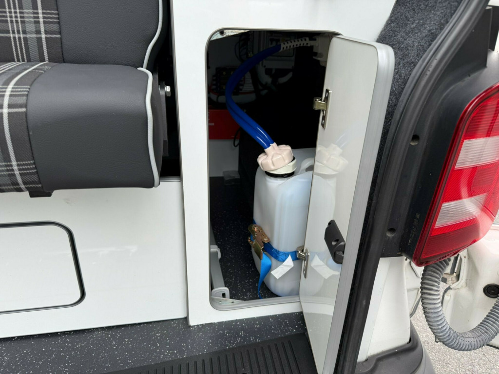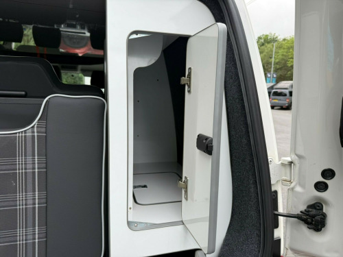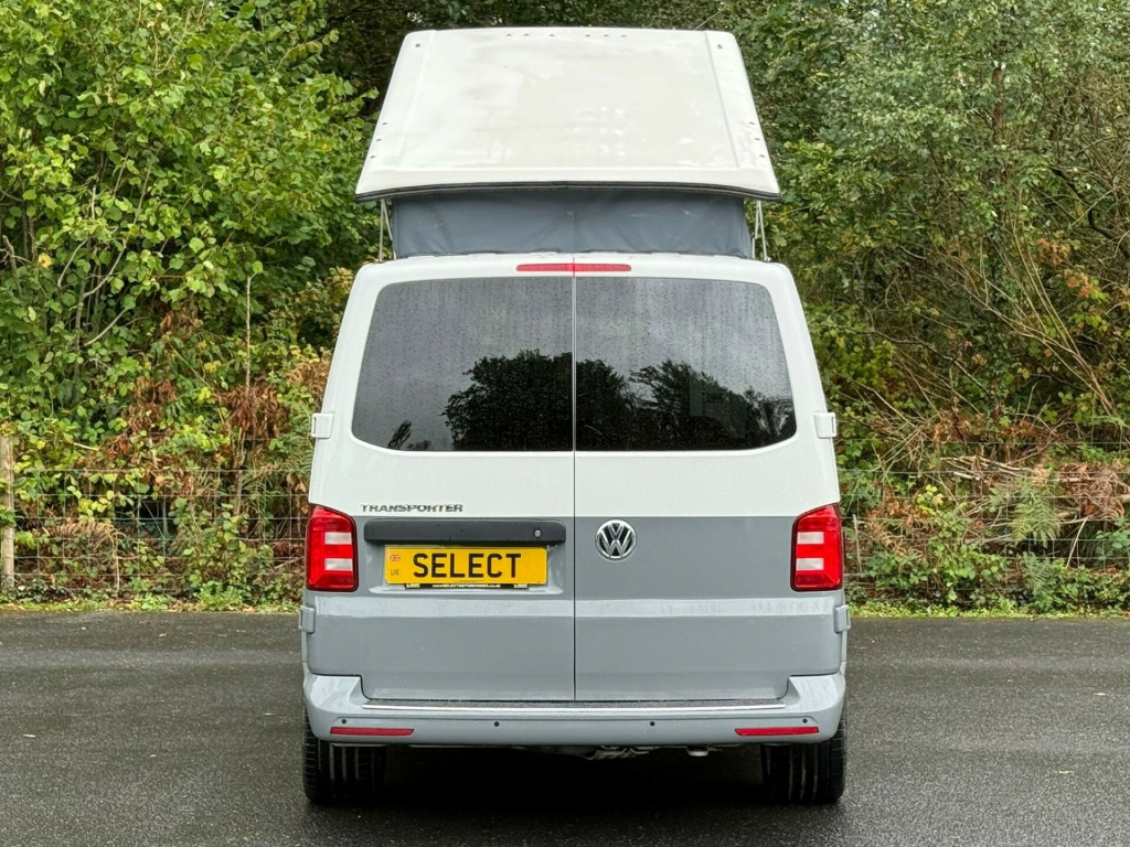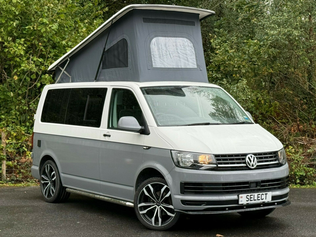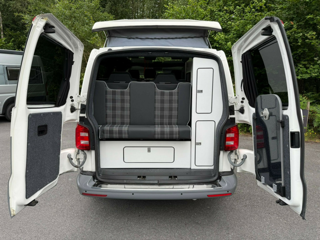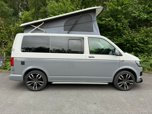 This 2019 Volkswagen Transporter T28 TDI STARTLINE campervan with 2 previous registered keeper(s) is a diesel motorhome with 54681 miles on the clock. It can comfortably seat 5 people and sleeps 4 with its 4 berths including a fixed double bed in the end bedroom. The wardrobe provides ample storage space, and the 2-burner hob is perfect for cooking up meals on the go. The vehicle measures 4892mm in length, 1904mm in width, and 1990mm in height, with a gross weight and MTPLM of 2800kg. With its compact dimensions and spacious interior, this campervan is perfect for road trips and adventures. uble bed, end bedroom, fixed bed, wardrobe, 2-burner hob, fridge freezer, side kitchen, sink/drainer, service indicator, chrome side pipes, cruise control, electric fold-out bed, pop top, swivel front bench, 20'' Alloys