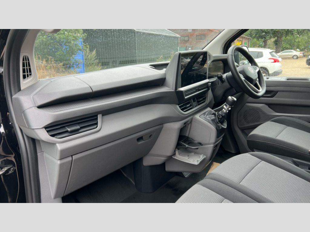 Volkswagen Transporter 2.0 TDI 150 Commerce Pro Van 12" digital drivers display, 13" touchscreen infotainment display with wireless app connect and DAB radio, 5G Modem, Adaptive cruise control, Apple CarPlay and Android Auto, Dynamic road sign display, eCall emergency system, Electromechanical speed sensitive power steering, height and longitudinally adjustable steering column, Lane and blind spot assist with exit warning system, Preparation of VW connect and connect plus, Wireless mobile phone charging, Wrong way driver warning, Body colour bumpers, Body coloured door handles, Body coloured door mirrors, Body coloured radiator grille, Electrically heated, adjustable and folding door mirrors, Heat reflecting side window glass, Mud flaps front and rear, Rear Transporter nameplate in black grained decorative trim, Vehicle opening configuration 1x 1st row of seats, 2x all doors, 12V outlet in centre console and 12V outlet on rear right D-pillar, 2x 15-W USB data/charging ports in dashboard and 1x USB-C, 1x USB-A center bottom, 2x LED lights in load compartment, 3x additional super bright LED lights in load compartment, 4 way height and tilt adjustable head restraints, 5 additional USB-C charging ports, Black plastic scuff plate for sliding door in cargo without illumination, Cabin interior lighting, Glasses compartment in driver side roof, Grab handle on A-pillar passenger side, Illuminated lockable glovebox, Lashing rings for reinforced floor covering, Leatherette gear lever, Narrow centre console with cup holder and compartment for mobile phone, Overhead storage compartment, Rubber floor covering in cab, Striped fabric upholstery, Without passenger seats in load compartment, Driver and front passenger airbag with front passenger airbag deactivation, Dual tone horn, Front and curtain airbags for driver and front passenger, Seat belt pretensioner for driver seat, Anti theft alarm system with interior monitoring in cab, backup horn and towing protection, Electronic immobiliser, Lockable wheel bolts, Preparation for alcohol ignition interlock, 5+ Promise, Alternator - 230A, Electromechanical brake booster, Electronic stability control, ABS, ASR with deactivation button, hill start assist and brake assist system