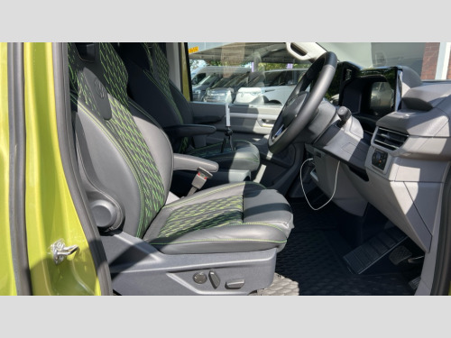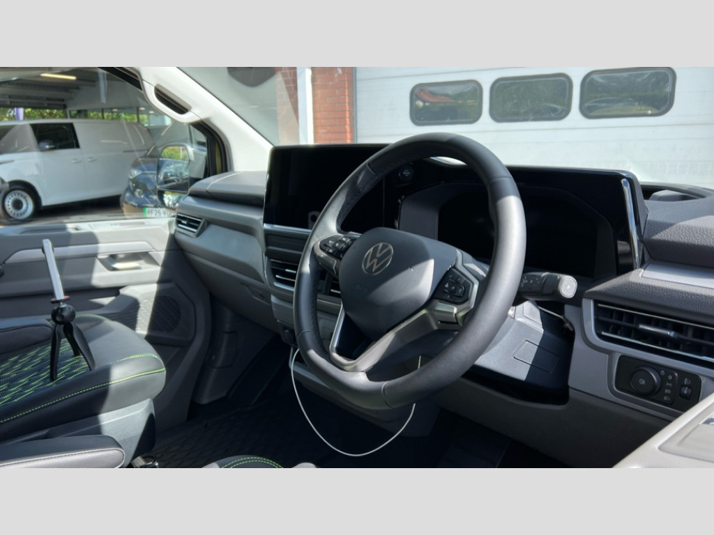 Volkswagen Transporter 2.0 TDI 170 Commerce Pro Van Auto 12" digital drivers display, 13" touchscreen infotainment display with wireless app connect and DAB radio, 5G Modem, Adaptive cruise control, Apple CarPlay and Android Auto, Dynamic road sign display, eCall emergency system, Electromechanical speed sensitive power steering, height and longitudinally adjustable steering column, Lane and blind spot assist with exit warning system, Preparation of VW connect and connect plus, Traffic jam assist, Wireless mobile phone charging, Wrong way driver warning, Body colour bumpers, Body coloured door handles, Body coloured door mirrors, Body coloured radiator grille, Electrically heated, adjustable and folding door mirrors, Heat reflecting side window glass, Mud flaps front and rear, Rear Transporter nameplate in black grained decorative trim, Vehicle opening configuration 1x 1st row of seats, 2x all doors, 12V outlet in centre console and 12V outlet on rear right D-pillar, 2x 15-W USB data/charging ports in dashboard and 1x USB-C, 1x USB-A center bottom, 2x LED lights in load compartment, 3x additional super bright LED lights in load compartment, 4 way height and tilt adjustable head restraints, 5 additional USB-C charging ports, Black plastic scuff plate for sliding door in cargo without illumination, Cabin interior lighting, Gear selector lever on steering wheel, Glasses compartment in driver side roof, Grab handle on A-pillar passenger side, Illuminated lockable glovebox, Lashing rings for reinforced floor covering, Narrow centre console with cup holder and compartment for mobile phone, Overhead storage compartment, Rubber floor covering in cab, Striped fabric upholstery, Without passenger seats in load compartment, Driver and front passenger airbag with front passenger airbag deactivation, Dual tone horn, Front and curtain airbags for driver and front passenger, Seat belt pretensioner for driver seat, Anti theft alarm system with interior monitoring in cab, backup horn and towing protection, Electronic immobiliser, Lockable wheel bolts, Preparation for alcohol ignition interlock, 5+ Promise, Alternator - 230A, Electromechanical brake booster, Electronic stability control, ABS, ASR with deactivation button, hill start assist and brake assist system