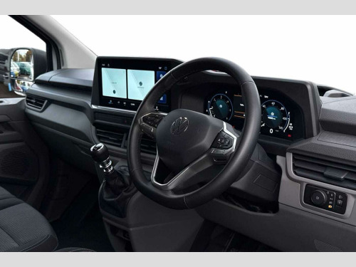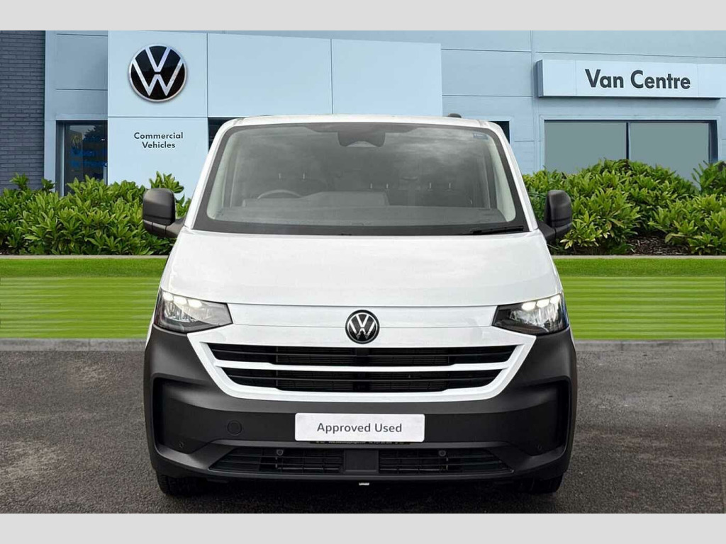 Volkswagen Transporter 2.0 TDI 110 Commerce Plus Van Solid paint-Clear White, LED headlights with separate LED daytime running lights, Single sliding side load door, Rear wing cargo doors, Parking sensors front + rear, Rear view camera, Exterior Pack with black bumpers, High metal partition without window, Fully ply-lined, Rear wing doors, Sliding door on front passenger side, 3 seat cab package - Transporter, Solid - Clear White, Striped fabric - Titanium/Palladium black, 16" steel wheels with hub caps, Steel spare wheel with jack and without tyre pressure sensor, 5 Years Warranty, 5 Years Roadside Assistance, 5 Services, 3 MOT's, (From Date Of Registration), Heat reflecting side window glass, Body coloured door handles, Mud flaps front and rear, Rear Transporter nameplate in black grained decorative trim, Vehicle opening configuration 1x 1st row of seats, 2x all doors, Electronic stability control, ABS, ASR with deactivation button, hill start assist and brake assist system, Cruise control, Electromechanical speed sensitive power steering, height and longitudinally adjustable steering column, Lane assist, Wrong way driver warning, Driver and front passenger airbag with front passenger airbag deactivation, Dual tone horn, Front and curtain airbags for driver and front passenger, Seat belt pretensioner for driver seat, Apple CarPlay and Android Auto, 4 speakers - 2x dashboard, 2x cab doors, 12" digital drivers display, 13" touchscreen infotainment display with wireless app connect and DAB radio, 5G Modem, Dynamic road sign display, eCall emergency system, Preparation of VW connect and connect plus, Alternator - 230A, 2x 15-W USB data/charging ports in dashboard and 1x USB-C, 1x USB-A center bottom, 3 spoke leather wrapped multi function steering wheel, Black plastic scuff plate for sliding door in cargo without illumination, Leatherette gear lever, Narrow centre console with cup holder and compartment for mobile phone, Overhead storage compartment, Roof grab handle on front passenger side, Rubber floor covering in cab, Striped fabric upholstery, Cabin interior lighting, 2x LED lights in load compartment, Lashing rings for reinforced floor covering, Without passenger seats in load compartment, 4 way height and tilt adjustable head restraints, Anti theft alarm system with interior monitoring in cab, backup horn and towing protection, Electronic immobiliser, Preparation for alcohol ignition interlock, 5+ Promise