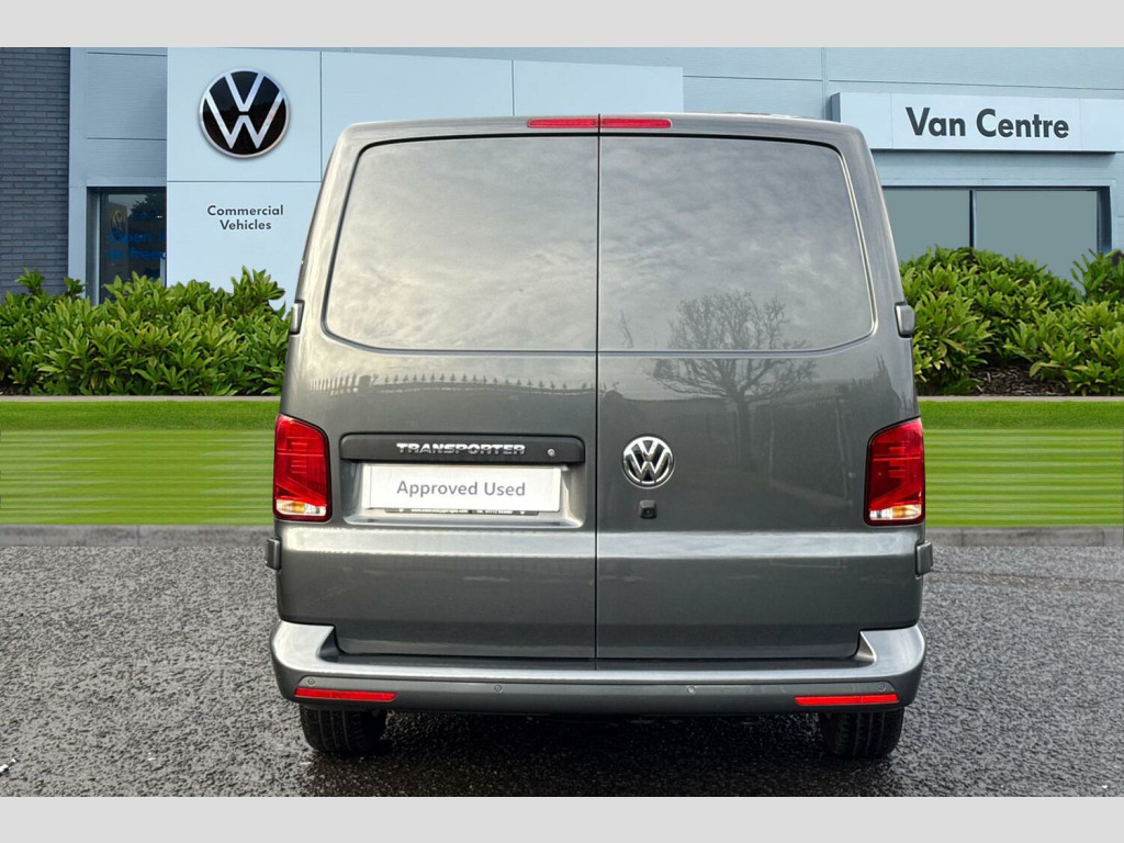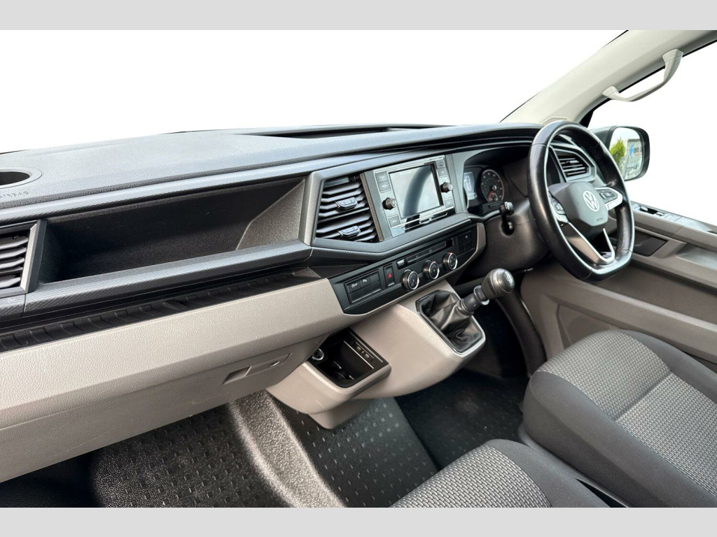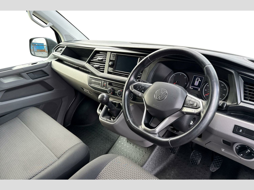 Metallic paint, LED headlights with LED daytime running lights, Rear view camera, Front and rear parking sensors, Electronically controlled air conditioning system, Armrest for driver right cab seat, Dual passenger seat in cab, Metallic - Indium grey, Heat insulating glass (green) in cab and passenger/load compartment, Heated front windscreen, Windshield wiper intermittent control with rain sensor for windshield wipers, 16" chassis with 16" brake system, Radiator grille with 2 chrome trims, Transporter nameplate on the rear fender, Automatic headlight control, leaving home and manual coming home feature, Front fog lamps with cornering light, Electronic stability control, ABS, ASR with deactivation button, hill start assist and brake assist system, Start/stop system with regenerative breaking, Adaptive cruise control, Cross wind assist, Left convex exterior mirror, Power folding adjustable door mirrors with separately heated, Right convex exterior mirror, 3 point height adjustable seat belts on outer seats cab with electric pretensioners, Driver and front passenger airbag with front passenger airbag deactivation, Warning buzzer and light for driver and front passenger seat belt not fastened, Without child safety lock in passenger compartment, Mobile phone interface, 2 USB interfaces type C in dashboard, 4 speakers with 2 tweeters and 2 woofers, Composition colour radio with 6.5" touchscreen, Digital radio reception (DAB+), Volkswagen app connect, Closing rear wing door with unlatching from the inside, Rear wing doors without window apertures, Dimmable illuminated instruments, Driver alert with Multi-function display plus, Multi function display plus with black and white display, eCall emergency system, Forward collision warning front assist with autonomous emergency braking, Diesel particulate filter, Dust/pollen filter, 3 spoke leather wrapped multi function steering wheel, Auto dimming breakaway interior rear view mirror, Comfort headliner in cab, hardboard roof trim in passenger and load compartment, Glove compartment with illumination, Heavy duty tool kit and jack, High partition, Refrigerant R134a, Standard lower part dashboard in palladium, Storage compartments on cab seats and reading light, LED Interior lighting in load and passenger compartment, Front and rear left without window closed side panel in load compartment, Interior plastic loading edge protection, Without right side window apertures in passenger and load compartment, Comfort pack - Transporter, Exterior pack without fog light- Transporter, Non smoker pack - Transporter, Front seats on the right in 1st row of seat, Manual adjustable lumbar support for right single seat in 1st row seats, Anti theft alarm system with interior monitoring in cab, backup horn and towing protection, Lockable wheel bolts, 16" Clayton alloy wheels