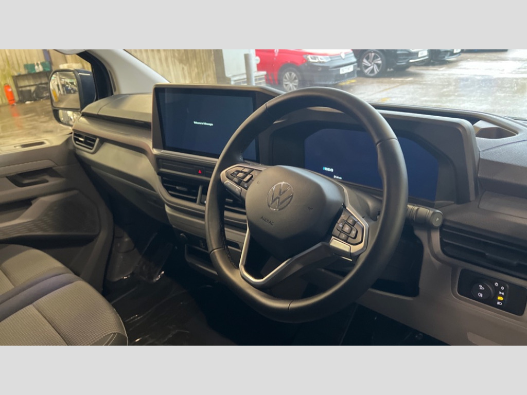 Volkswagen Transporter 100kW 65kWh Commerce Pro Van Auto 12" digital drivers display, 13" touchscreen infotainment display with wireless app connect and DAB radio, 5G Modem, Adaptive cruise control, Apple CarPlay and Android Auto, Dynamic road sign display, eCall emergency system, Electromechanical speed sensitive power steering, height and longitudinally adjustable steering column, Lane and blind spot assist with exit warning system, Preparation of VW connect and connect plus, Traffic jam assist, Wireless mobile phone charging, Wrong way driver warning, Body colour bumpers, Body coloured door handles, Body coloured door mirrors, Body coloured radiator grille, Electrically heated, adjustable and folding door mirrors, Heat reflecting side window glass, LED rear lights with exclusive light signature, Mud flaps front and rear, Rear Transporter nameplate in black grained decorative trim, Vehicle opening configuration 1x 1st row of seats, 2x all doors, 12V outlet in centre console and 12V outlet on rear right D-pillar, 2x 15-W USB data/charging ports in dashboard and 1x USB-C, 1x USB-A center bottom, 2x LED lights in load compartment, 3 spoke heated leather wrapped multi function steering wheel, 3x additional super bright LED lights in load compartment, 4 way height and tilt adjustable head restraints, 5 additional USB-C charging ports, Black plastic scuff plate for sliding door in cargo without illumination, Cabin interior lighting, Electric auxiliary heater, Glasses compartment in driver side roof, Grab handle on A-pillar passenger side, Heat pump, Illuminated lockable glovebox, Lashing rings for reinforced floor covering, Narrow centre console with cup holder and compartment for mobile phone, Overhead storage compartment, Rubber floor covering in cab, Striped fabric upholstery, Without passenger seats in load compartment, Driver and front passenger airbag with front passenger airbag deactivation, Front and curtain airbags for driver and front passenger, Seat belt pretensioner for driver seat, Single tone horn, Anti theft alarm system with interior monitoring in cab, backup horn and towing protection, Electronic immobiliser, Lockable wheel bolts, Preparation for alcohol ignition interlock, 5+ Promise, Electromechanical brake booster, Electronic stability control, ABS, ASR with deactivation button, hill start assist and brake assist system, Mode 3 charging cable, type 2, 3-phase, 32A, cable length 5m, Without alternator, Goodyear all season tyres, Tyre mobility kit in lieu of spare wheel with 12 volt compressor and tyre sealant