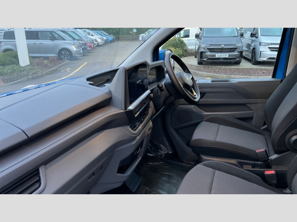 Volkswagen Transporter 100kW 65kWh Commerce Pro Van Auto 12" digital drivers display, 13" touchscreen infotainment display with wireless app connect and DAB radio, 5G Modem, Adaptive cruise control, Apple CarPlay and Android Auto, Dynamic road sign display, eCall emergency system, Electromechanical speed sensitive power steering, height and longitudinally adjustable steering column, Lane and blind spot assist with exit warning system, Preparation of VW connect and connect plus, Traffic jam assist, Wireless mobile phone charging, Wrong way driver warning, Body colour bumpers, Body coloured door handles, Body coloured door mirrors, Body coloured radiator grille, Electrically heated, adjustable and folding door mirrors, Heat reflecting side window glass, LED rear lights with exclusive light signature, Mud flaps front and rear, Rear Transporter nameplate in black grained decorative trim, Vehicle opening configuration 1x 1st row of seats, 2x all doors, 12V outlet in centre console and 12V outlet on rear right D-pillar, 2x 15-W USB data/charging ports in dashboard and 1x USB-C, 1x USB-A center bottom, 2x LED lights in load compartment, 3 spoke heated leather wrapped multi function steering wheel, 3x additional super bright LED lights in load compartment, 4 way height and tilt adjustable head restraints, 5 additional USB-C charging ports, Black plastic scuff plate for sliding door in cargo without illumination, Cabin interior lighting, Electric auxiliary heater, Glasses compartment in driver side roof, Grab handle on A-pillar passenger side, Heat pump, Illuminated lockable glovebox, Lashing rings for reinforced floor covering, Narrow centre console with cup holder and compartment for mobile phone, Overhead storage compartment, Rubber floor covering in cab, Striped fabric upholstery, Without passenger seats in load compartment, Driver and front passenger airbag with front passenger airbag deactivation, Front and curtain airbags for driver and front passenger, Seat belt pretensioner for driver seat, Single tone horn, Anti theft alarm system with interior monitoring in cab, backup horn and towing protection, Electronic immobiliser, Lockable wheel bolts, Preparation for alcohol ignition interlock, 5+ Promise, Electromechanical brake booster, Electronic stability control, ABS, ASR with deactivation button, hill start assist and brake assist system, Mode 3 charging cable, type 2, 3-phase, 32A, cable length 5m, Without alternator, Goodyear all season tyres, Tyre mobility kit in lieu of spare wheel with 12 volt compressor and tyre sealant