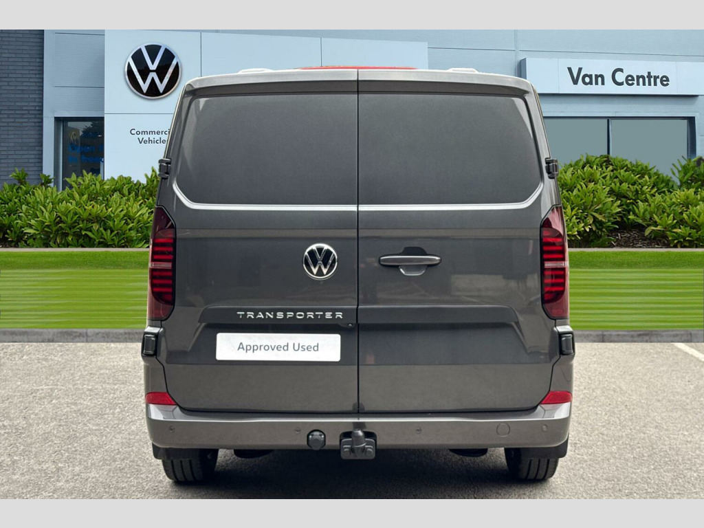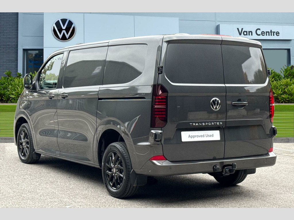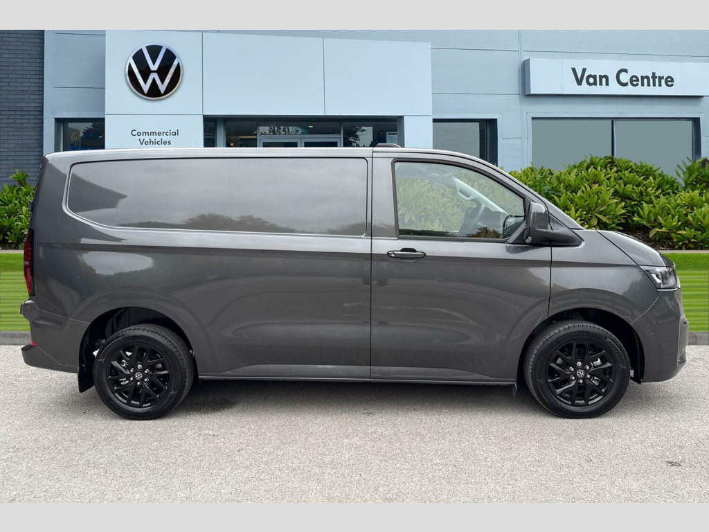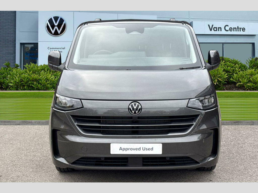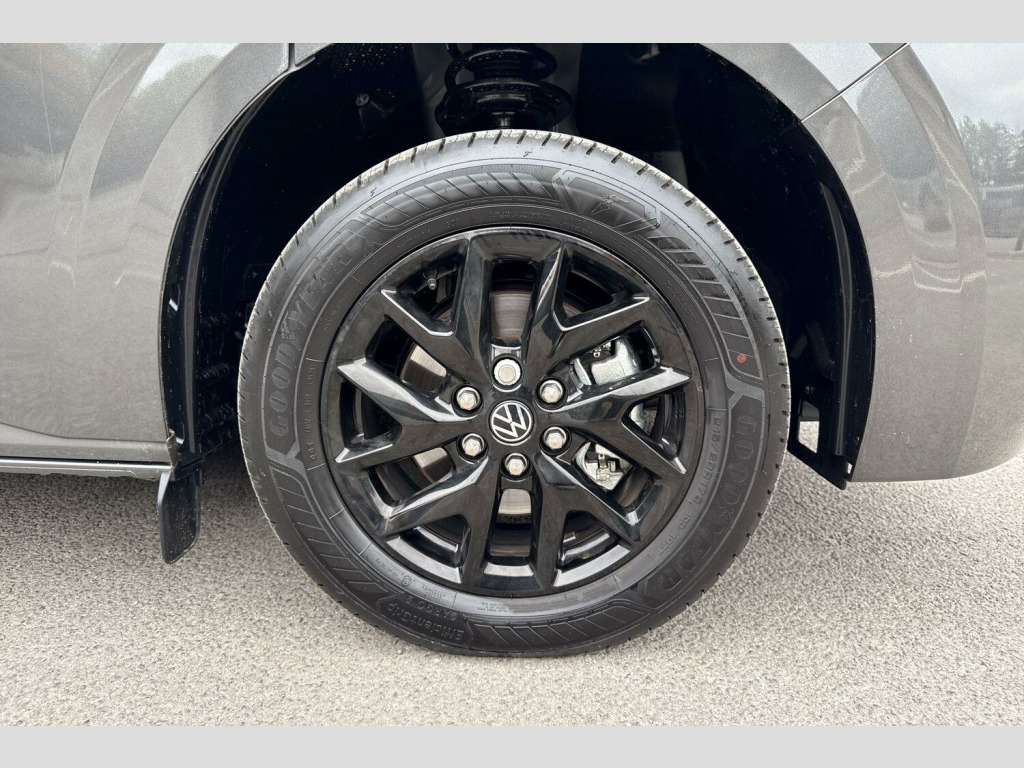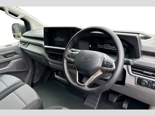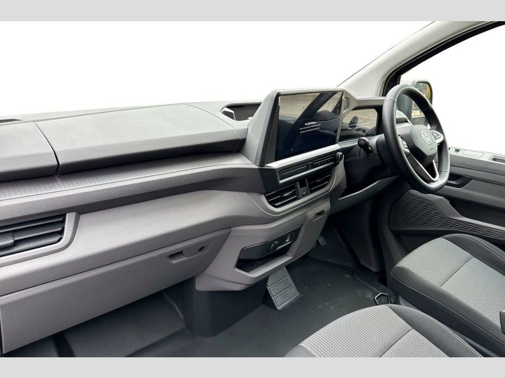 Metallic paint, Keyless start with safelock, 3 seat cab package heated - Transporter, Parking package premium - Transporter, Metallic - Graphite dust, Fixed trailer hitch, 17" Le Mans glossy black alloy wheels, Heat reflecting side window glass, Body colour bumpers, Body coloured door handles, Body coloured radiator grille, Mud flaps front and rear, Rear Transporter nameplate in black grained decorative trim, Vehicle opening configuration 1x 1st row of seats, 2x all doors, Electromechanical brake booster, Electronic stability control, ABS, ASR with deactivation button, hill start assist and brake assist system, Adaptive cruise control, Electromechanical speed sensitive power steering, height and longitudinally adjustable steering column, Lane and blind spot assist with exit warning system, Traffic jam assist, Wrong way driver warning, Body coloured door mirrors, Electrically heated, adjustable and folding door mirrors, Driver and front passenger airbag with front passenger airbag deactivation, Dual tone horn, Front and curtain airbags for driver and front passenger, Seat belt pretensioner for driver seat, Apple CarPlay and Android Auto, Wireless mobile phone charging, 12" digital drivers display, 13" touchscreen infotainment display with wireless app connect and DAB radio, 5G Modem, Dynamic road sign display, eCall emergency system, Preparation of VW connect and connect plus, Alternator - 230A, 2x 15-W USB data/charging ports in dashboard and 1x USB-C, 1x USB-A center bottom, 5 additional USB-C charging ports, Black plastic scuff plate for sliding door in cargo without illumination, Gear selector lever on steering wheel, Glasses compartment in driver side roof, Grab handle on A-pillar passenger side, Illuminated lockable glovebox, Narrow centre console with cup holder and compartment for mobile phone, Overhead storage compartment, Rubber floor covering in cab, Striped fabric upholstery, Cabin interior lighting, 12V outlet in centre console and 12V outlet on rear right D-pillar, 2x LED lights in load compartment, 3x additional super bright LED lights in load compartment, Lashing rings for reinforced floor covering, Without passenger seats in load compartment, 4 way height and tilt adjustable head restraints, Anti theft alarm system with interior monitoring in cab, backup horn and towing protection, Electronic immobiliser, Lockable wheel bolts, Preparation for alcohol ignition interlock, 5+ Promise