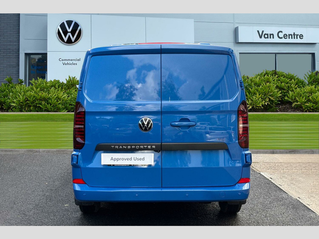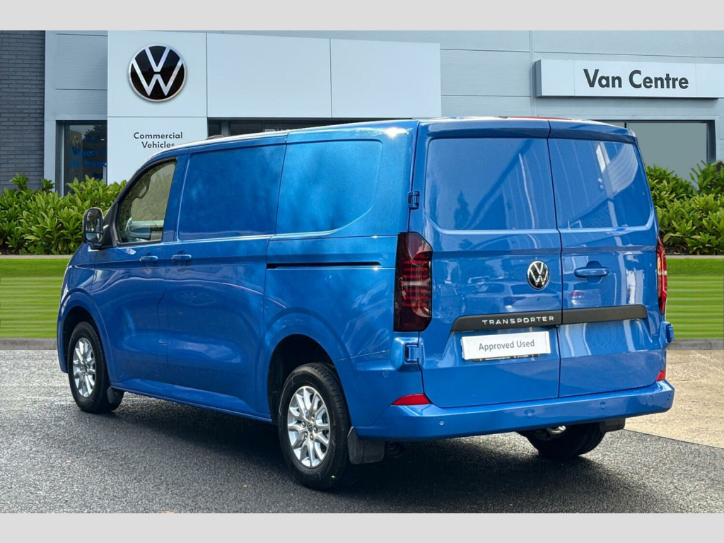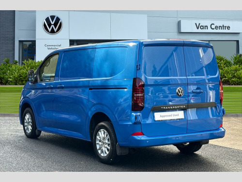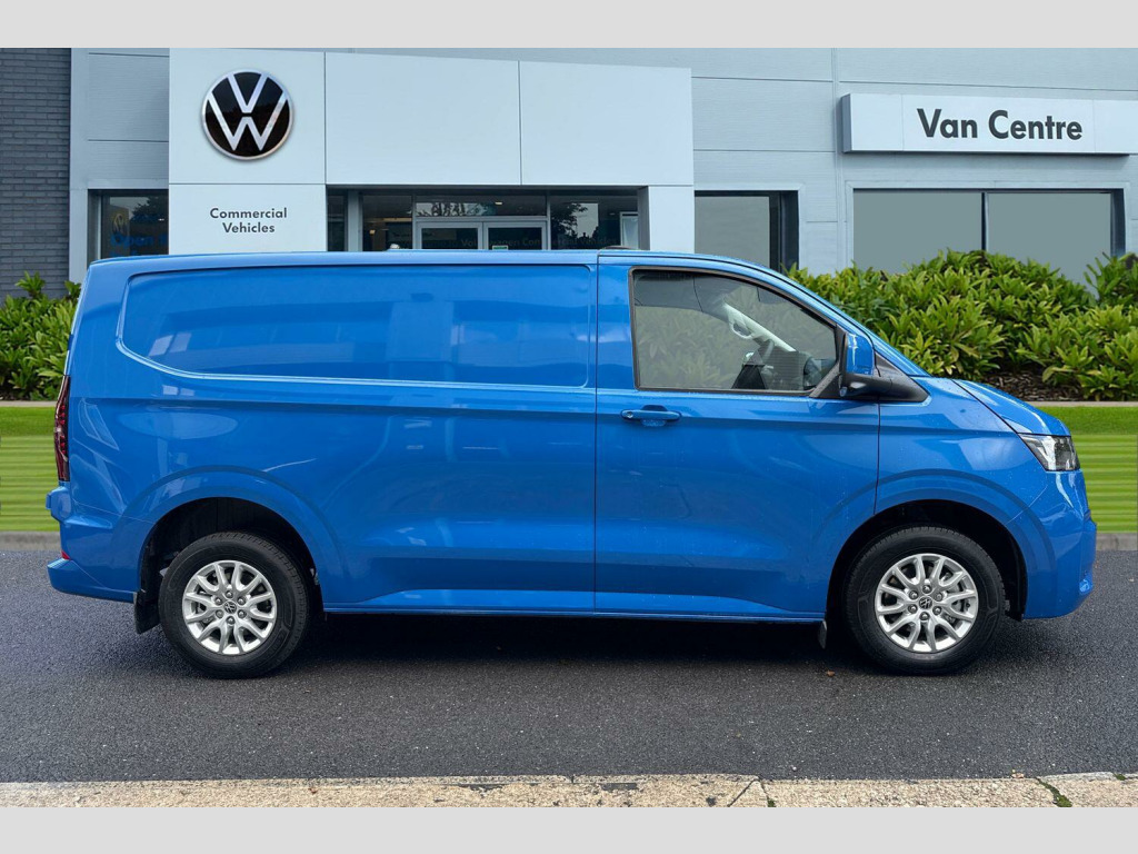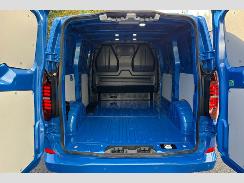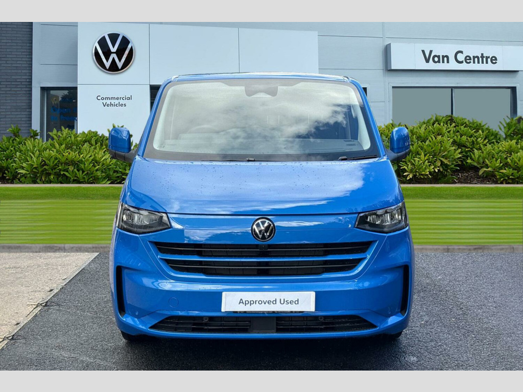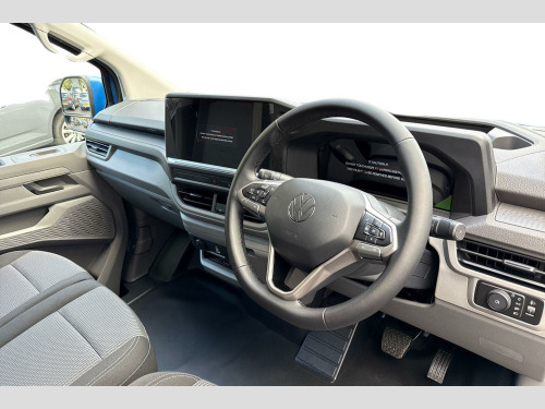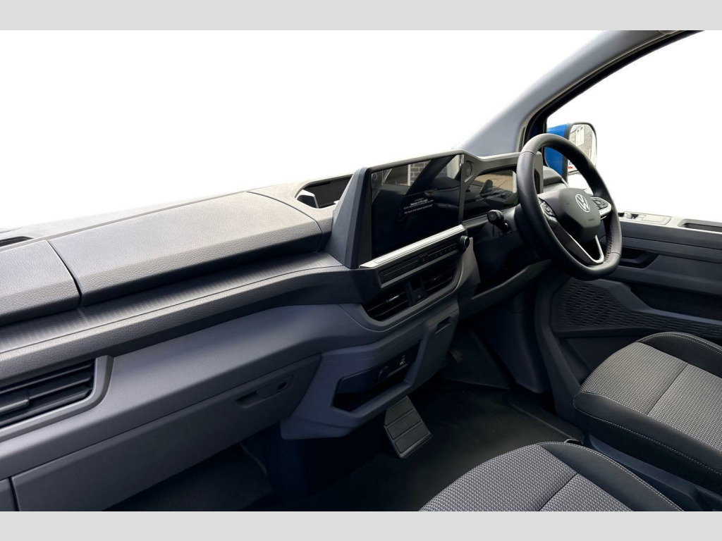 Metallic paint, Keyless start with safelock, 3 seat cab package heated - Transporter, Parking package premium plus - Transporter, Metallic - Mid Blue, Towbar preparation, Heat reflecting side window glass, Body colour bumpers, Body coloured door handles, Body coloured radiator grille, Mud flaps front and rear, Rear Transporter nameplate in black grained decorative trim, Vehicle opening configuration 1x 1st row of seats, 2x all doors, Electromechanical brake booster, Electronic stability control, ABS, ASR with deactivation button, hill start assist and brake assist system, Adaptive cruise control, Electromechanical speed sensitive power steering, height and longitudinally adjustable steering column, Lane and blind spot assist with exit warning system, Wrong way driver warning, Body coloured door mirrors, Electrically heated, adjustable and folding door mirrors, Driver and front passenger airbag with front passenger airbag deactivation, Dual tone horn, Front and curtain airbags for driver and front passenger, Seat belt pretensioner for driver seat, Apple CarPlay and Android Auto, Wireless mobile phone charging, 12" digital drivers display, 13" touchscreen infotainment display with wireless app connect and DAB radio, 5G Modem, Dynamic road sign display, eCall emergency system, Preparation of VW connect and connect plus, Alternator - 230A, 2x 15-W USB data/charging ports in dashboard and 1x USB-C, 1x USB-A center bottom, 5 additional USB-C charging ports, Black plastic scuff plate for sliding door in cargo without illumination, Glasses compartment in driver side roof, Grab handle on A-pillar passenger side, Illuminated lockable glovebox, Leatherette gear lever, Narrow centre console with cup holder and compartment for mobile phone, Overhead storage compartment, Rubber floor covering in cab, Striped fabric upholstery, Cabin interior lighting, 12V outlet in centre console and 12V outlet on rear right D-pillar, 2x LED lights in load compartment, 3x additional super bright LED lights in load compartment, Lashing rings for reinforced floor covering, Without passenger seats in load compartment, 4 way height and tilt adjustable head restraints, Anti theft alarm system with interior monitoring in cab, backup horn and towing protection, Electronic immobiliser, Lockable wheel bolts, Preparation for alcohol ignition interlock, 5+ Promise